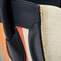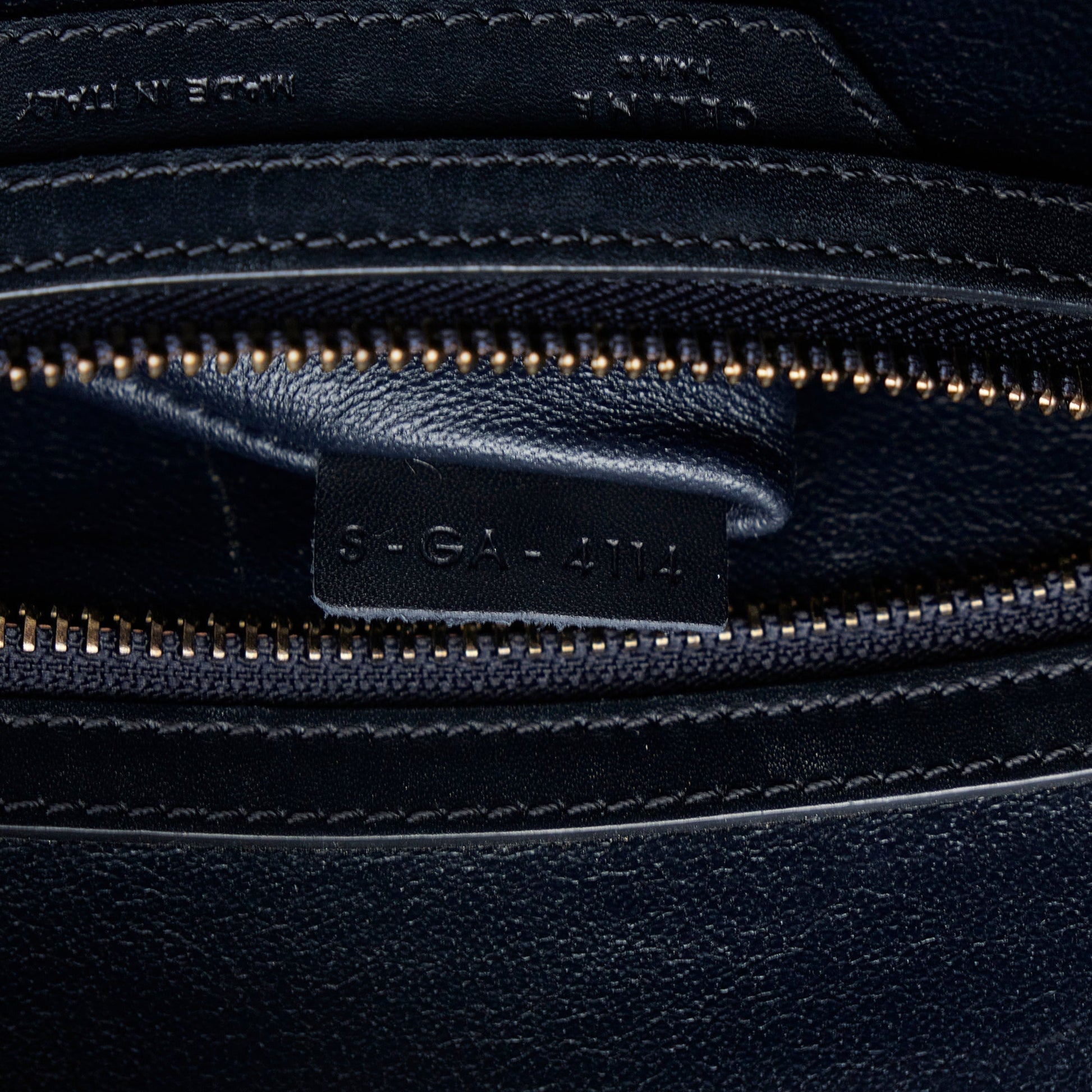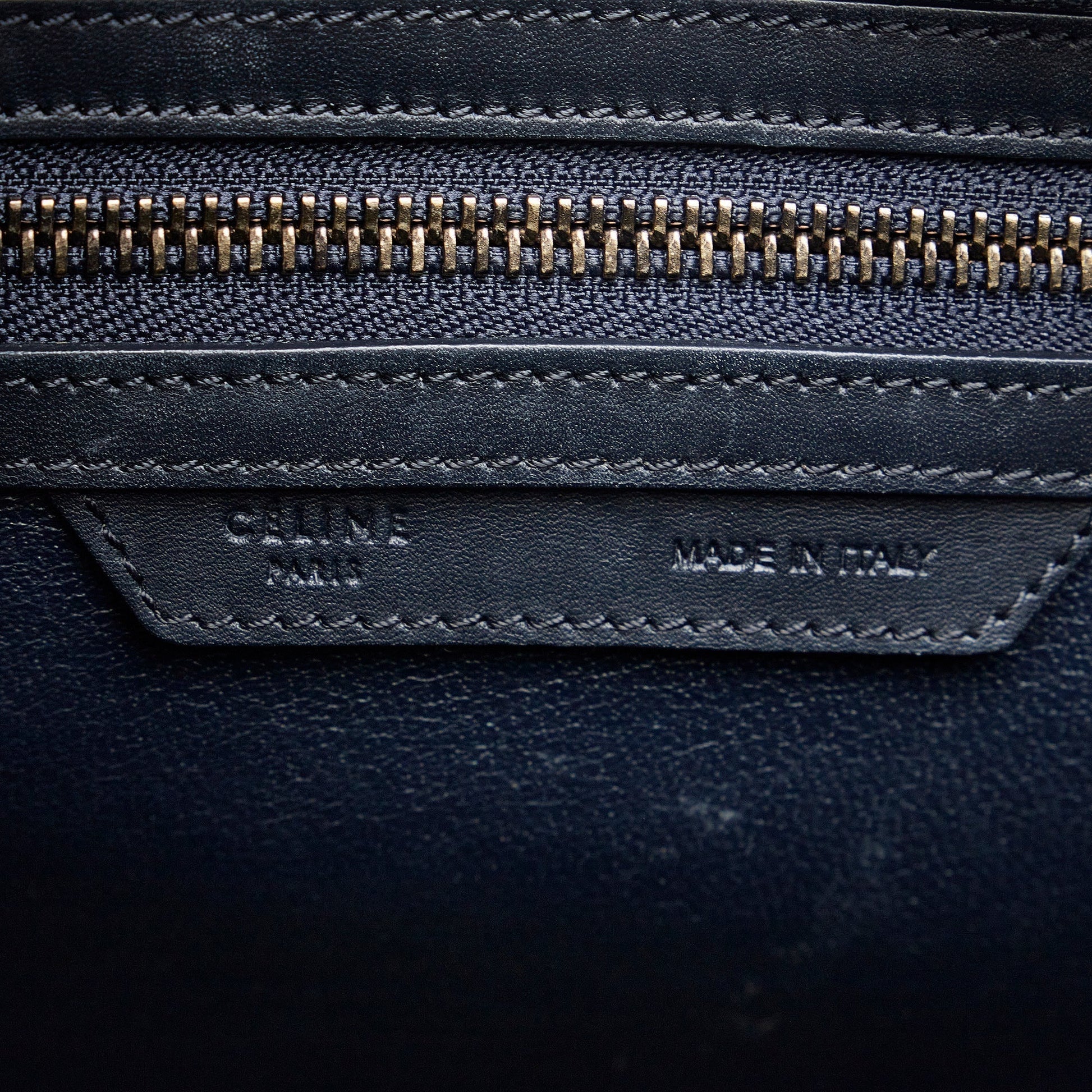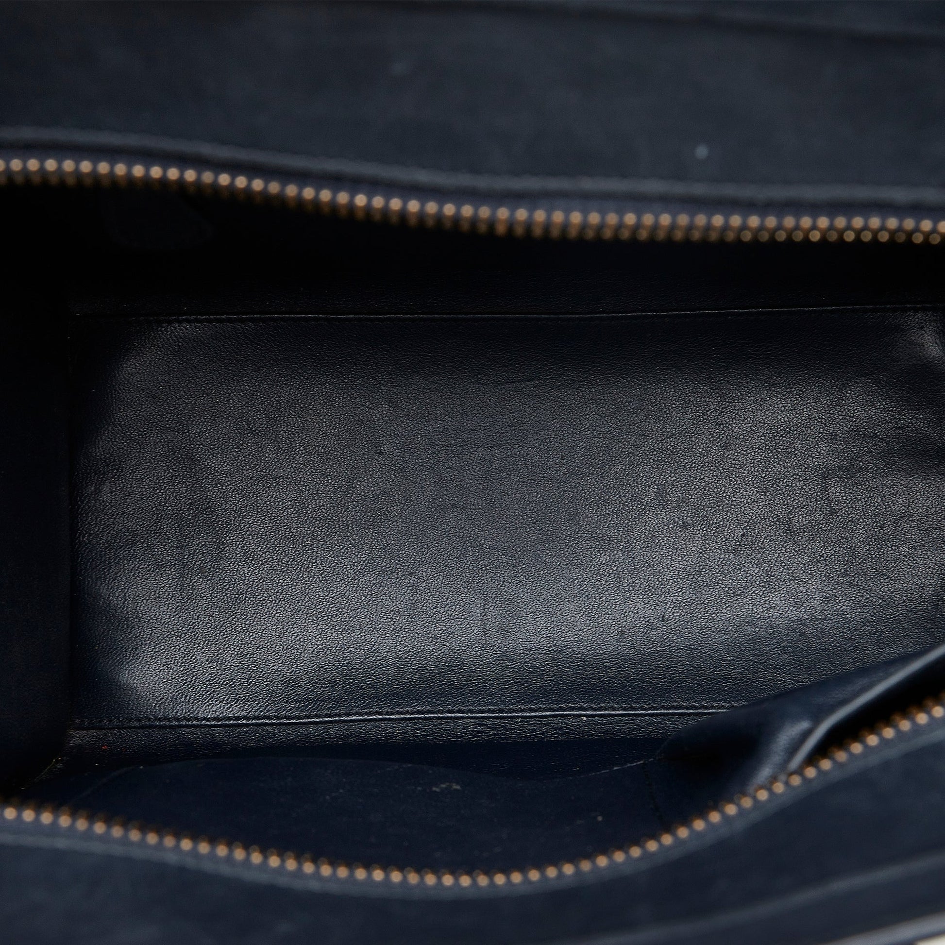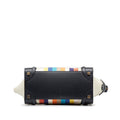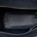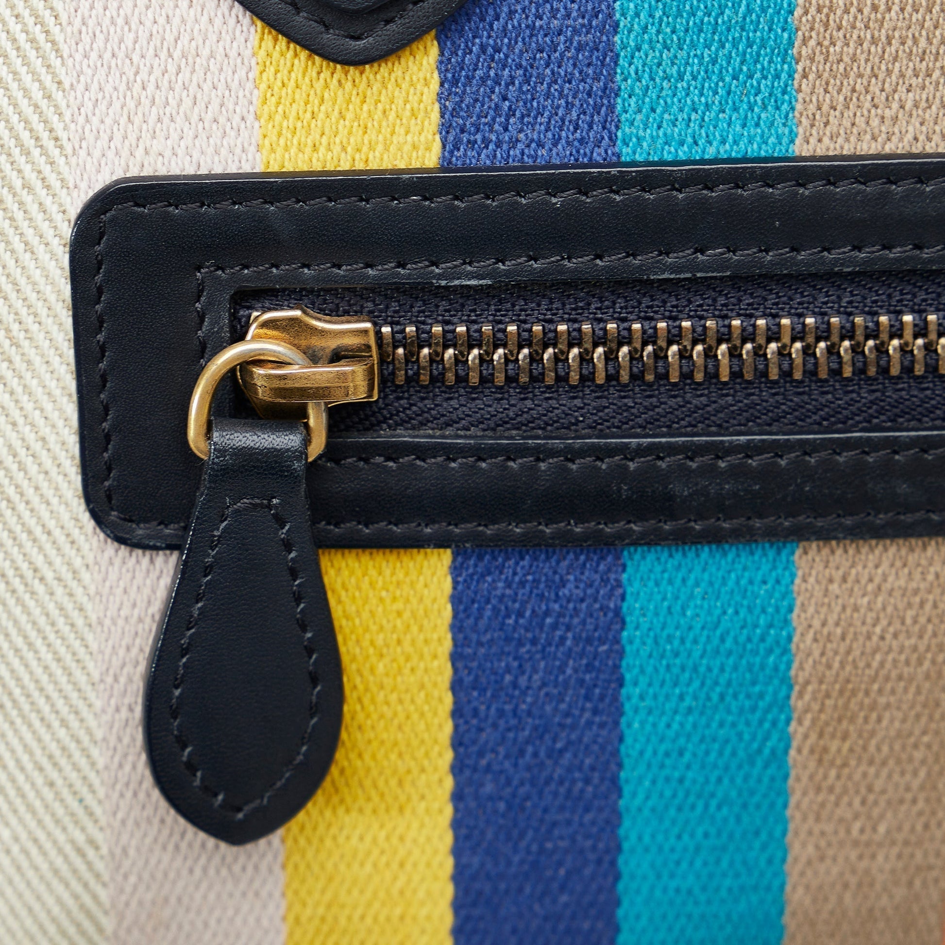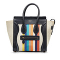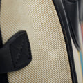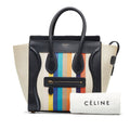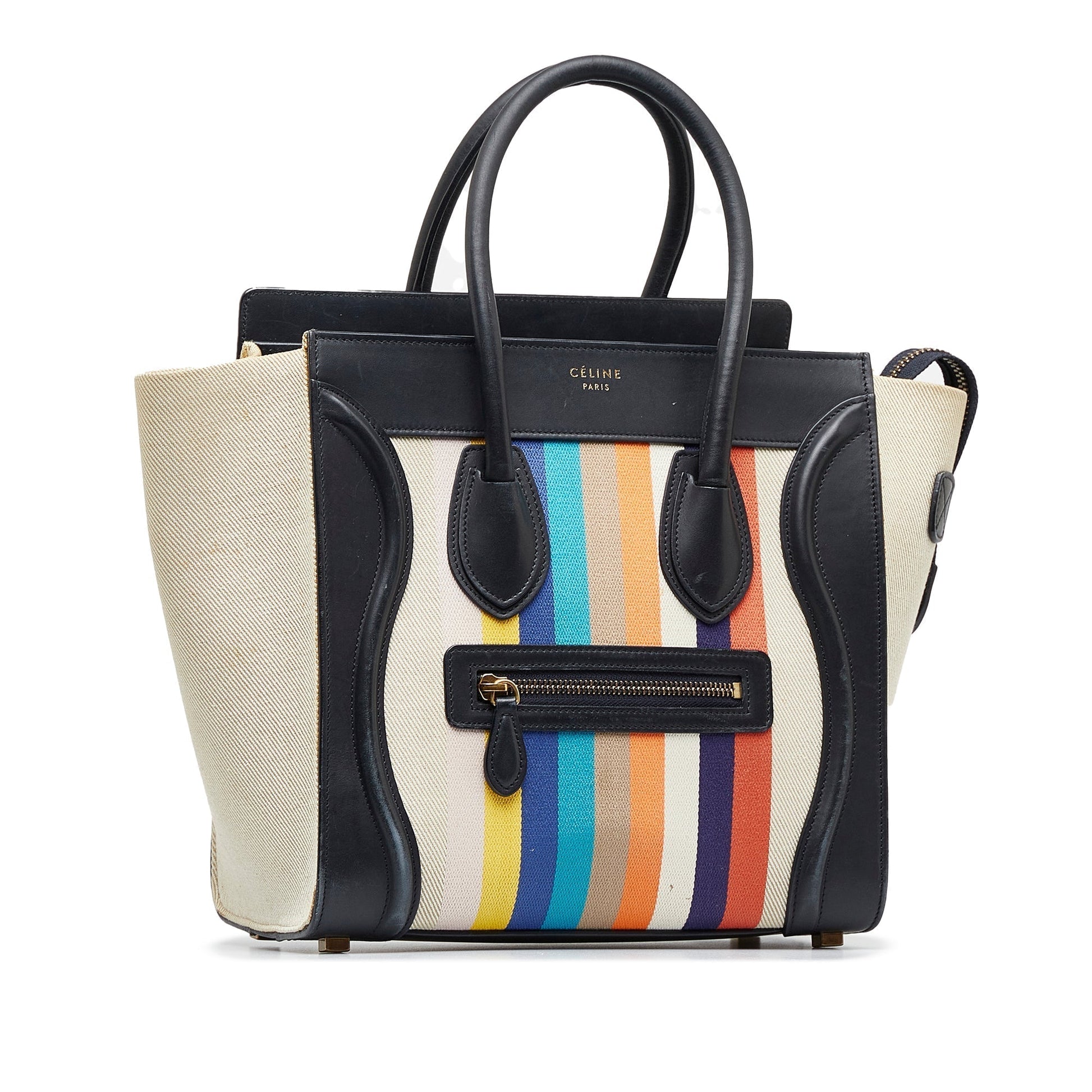 The Micro Luggage Tote handbag features a canvas and leather body, front exterior zip pocket, rolled leather handles, top zip closure, and an interior zip pocket. Comes with dust bag