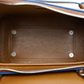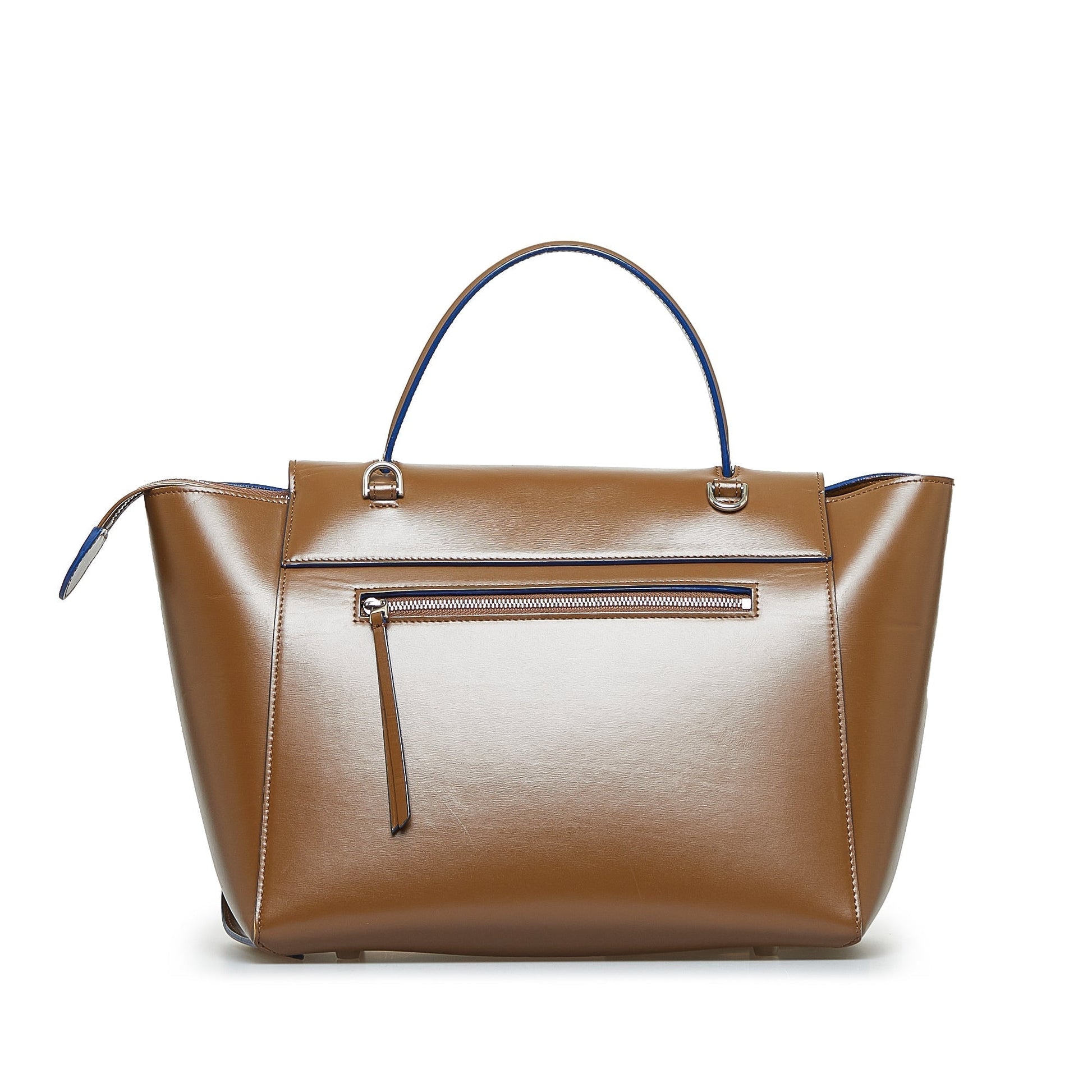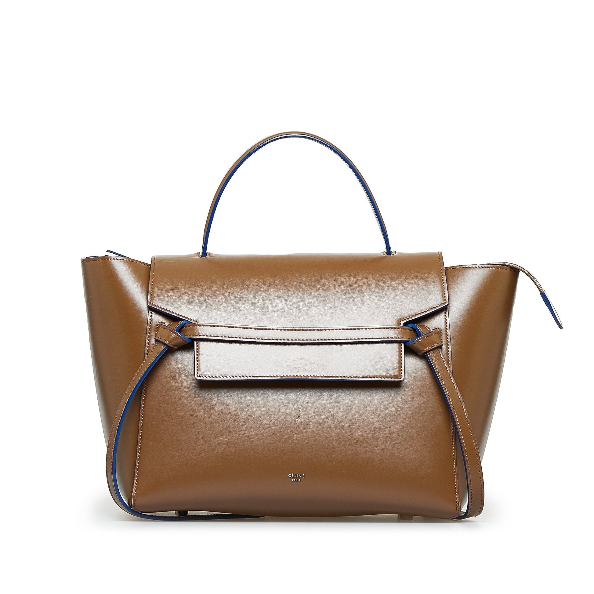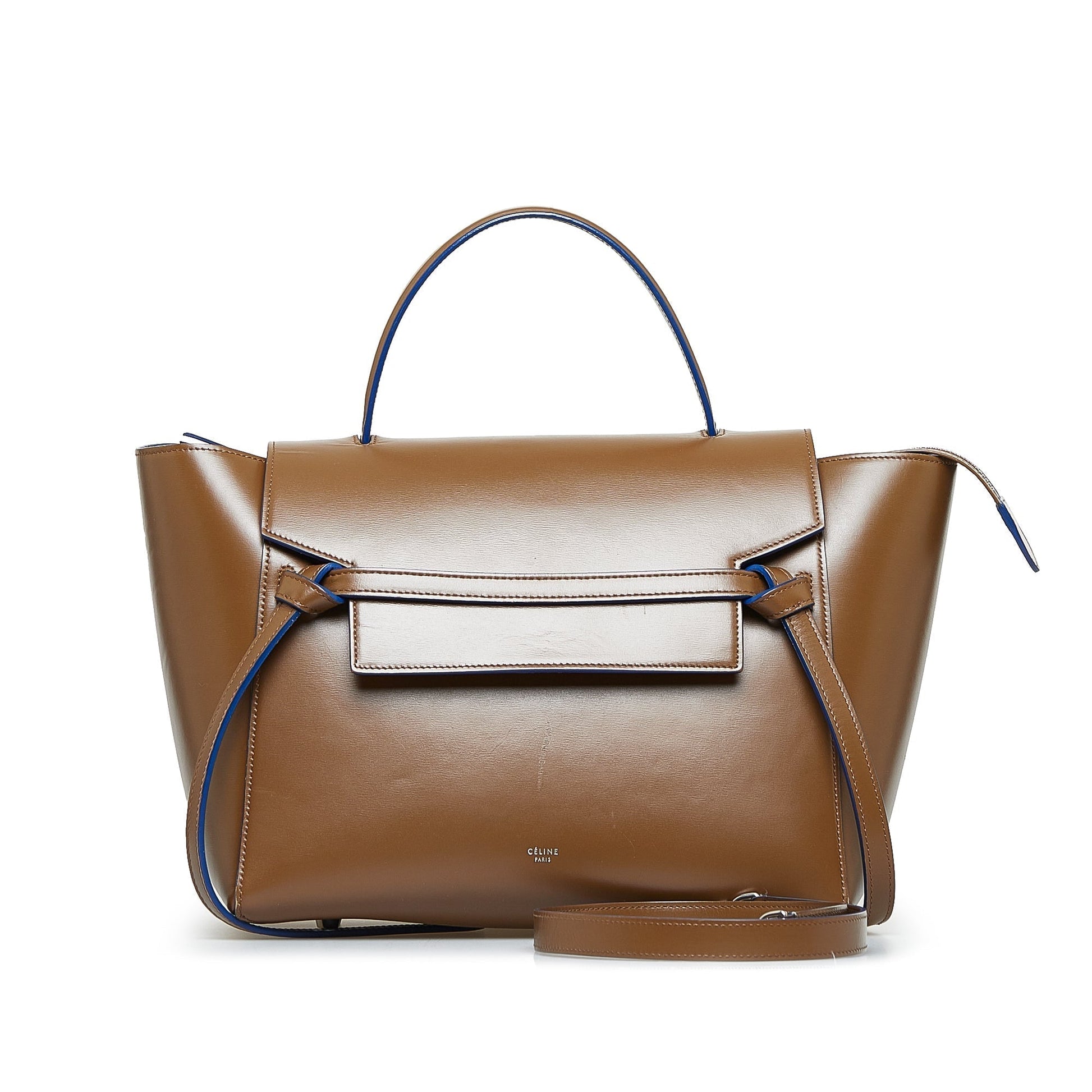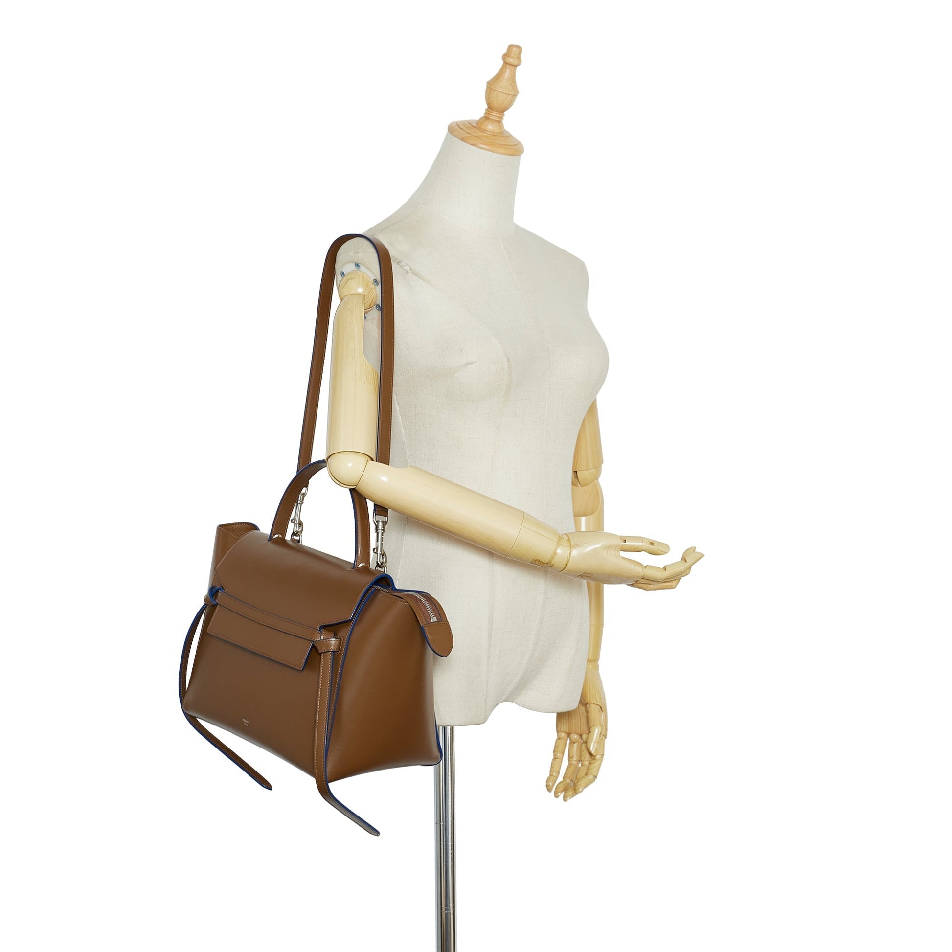 The Belt bag features a leather body, a flat leather top handle, a detachable flat leather strap, a front flap with a top zip closure, an exterior zip pocket, and interior slip pockets.