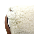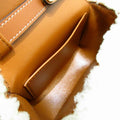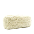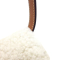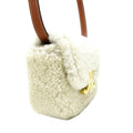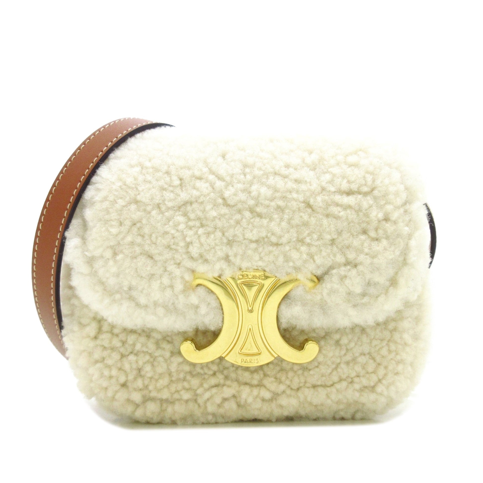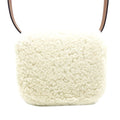 The Triomphe shoulder bag features a shearling body, an adjustable flat leather shoulder strap, a flap with magnetic snap closure, and an interior slip pocket. Comes with box and dust bag.