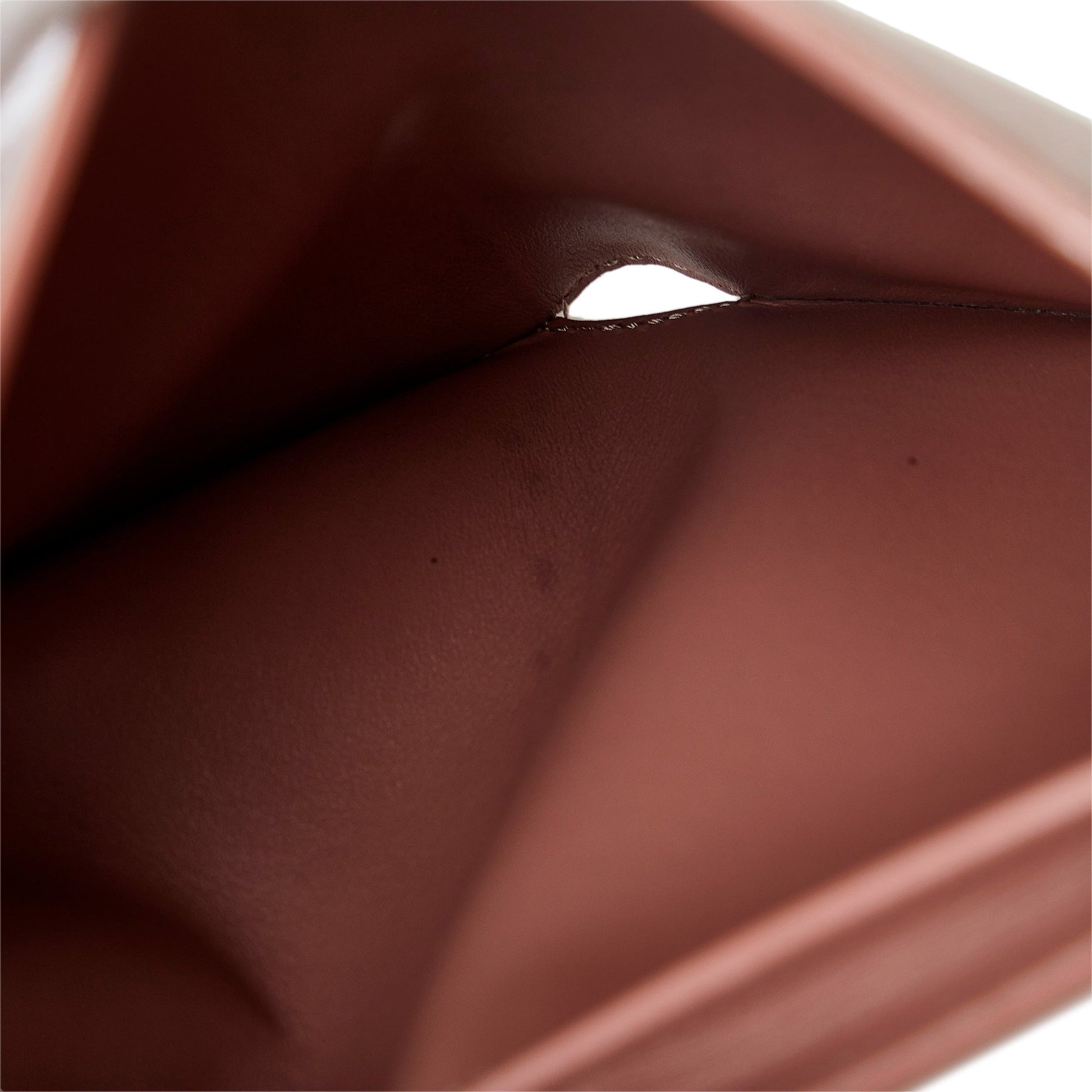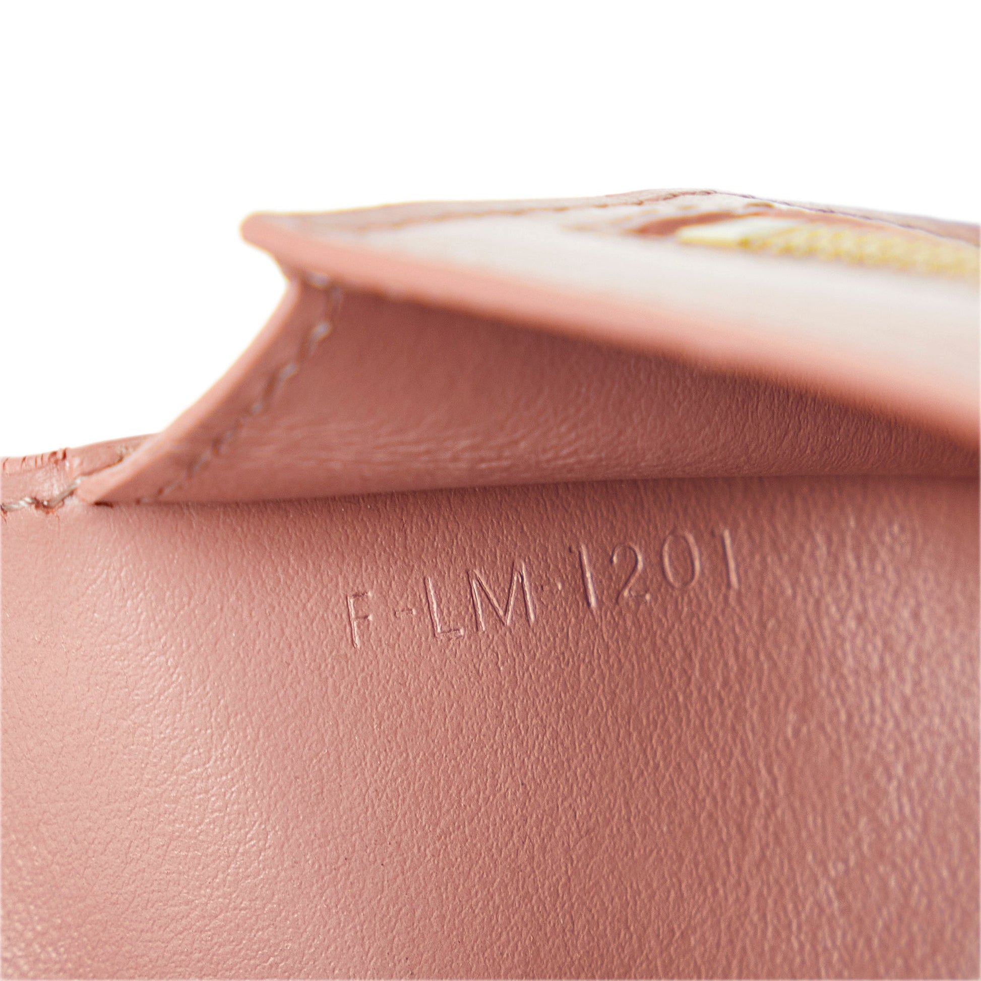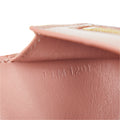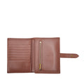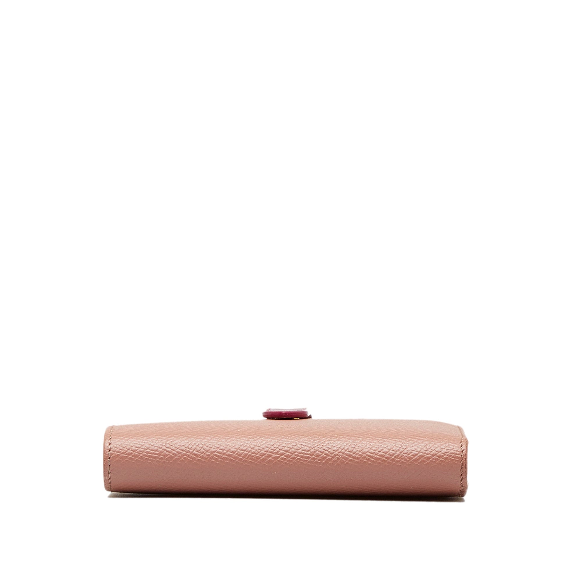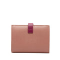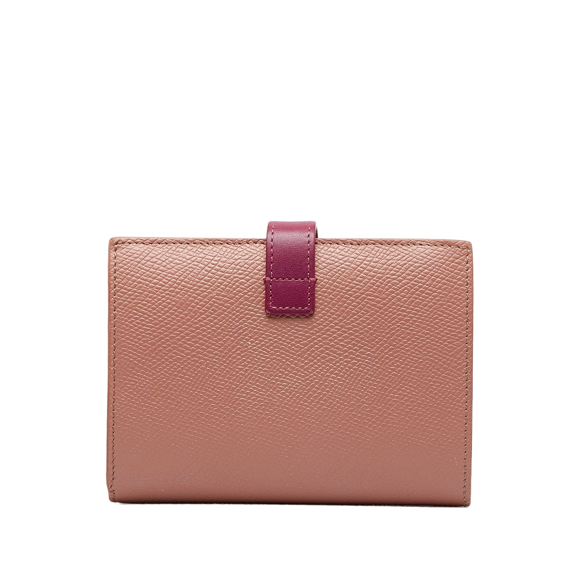 The Multifunction Wallet features a calf leather body, a top strap with a snap button closure, a contrast color leather lining, and multiple interior card and cash slots. Comes with box.