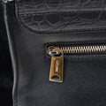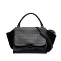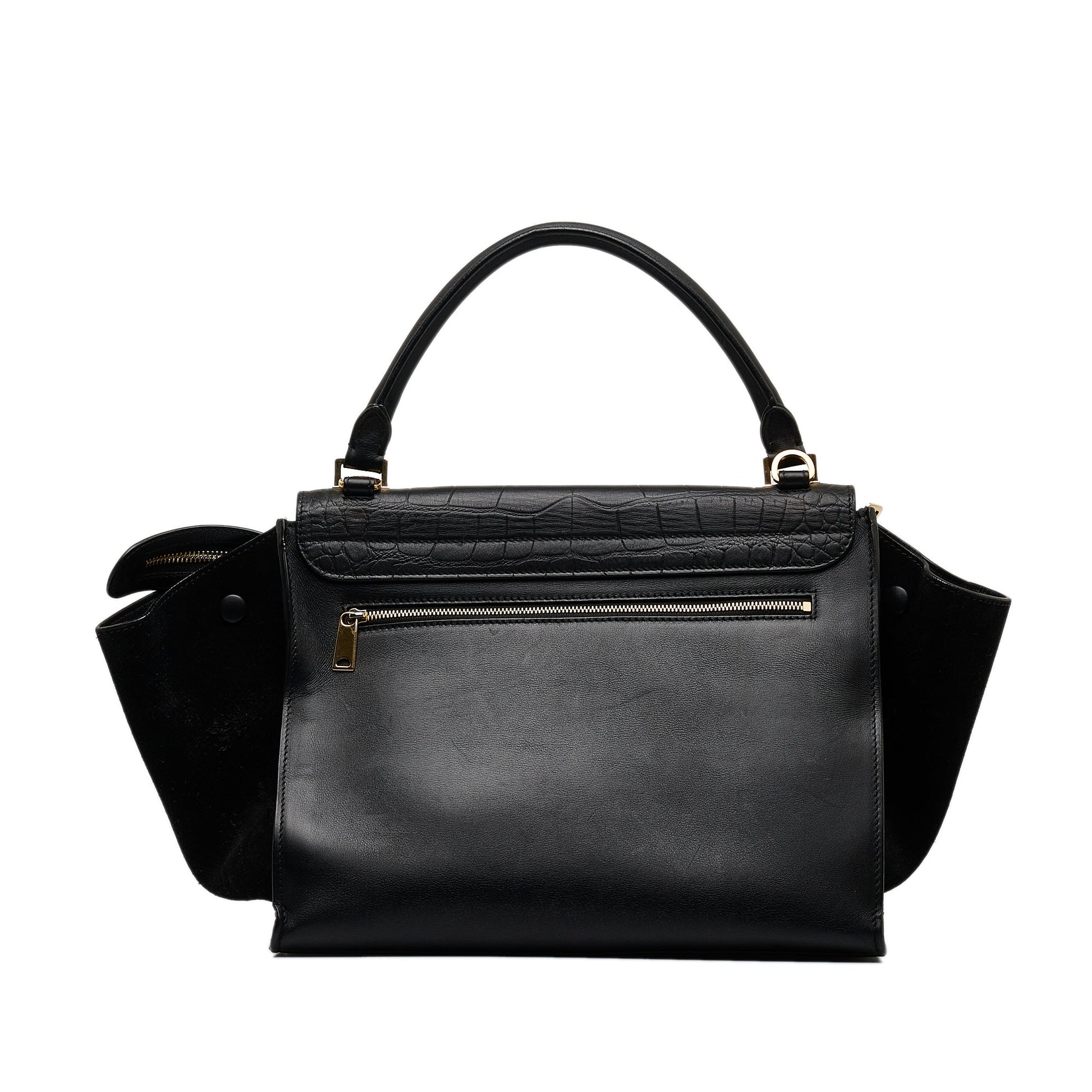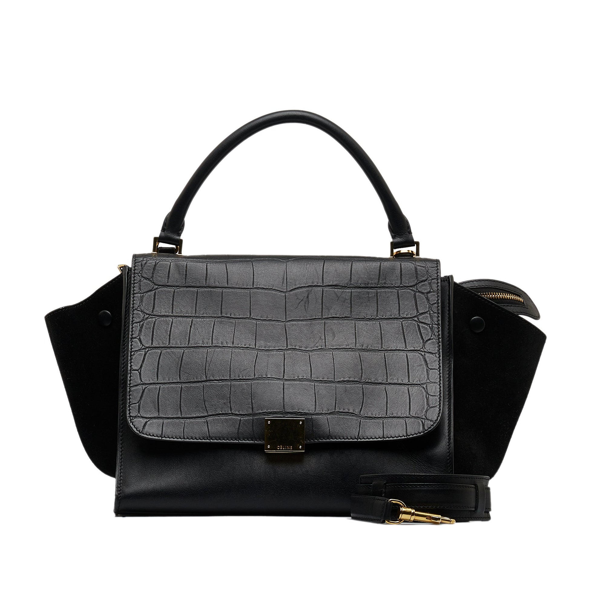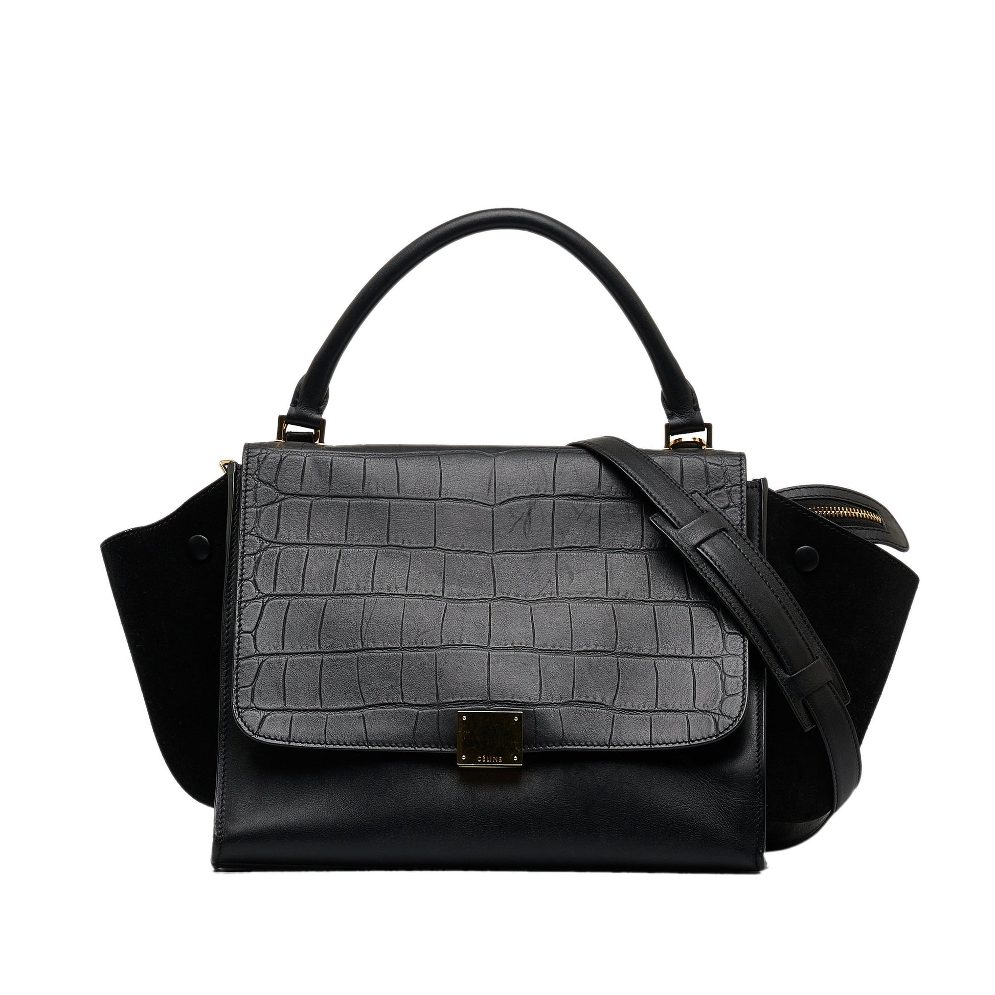 The Trapeze features a leather body, a rolled leather top handle, a detachable flat leather strap, a croc embossed front flap with a clasp closure, a top zip closure, and interior slip pockets.