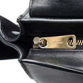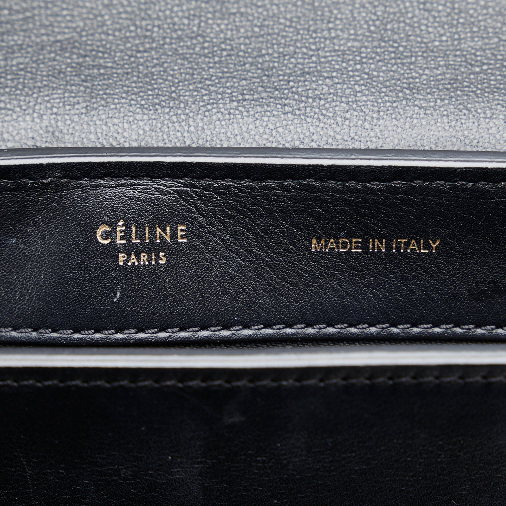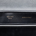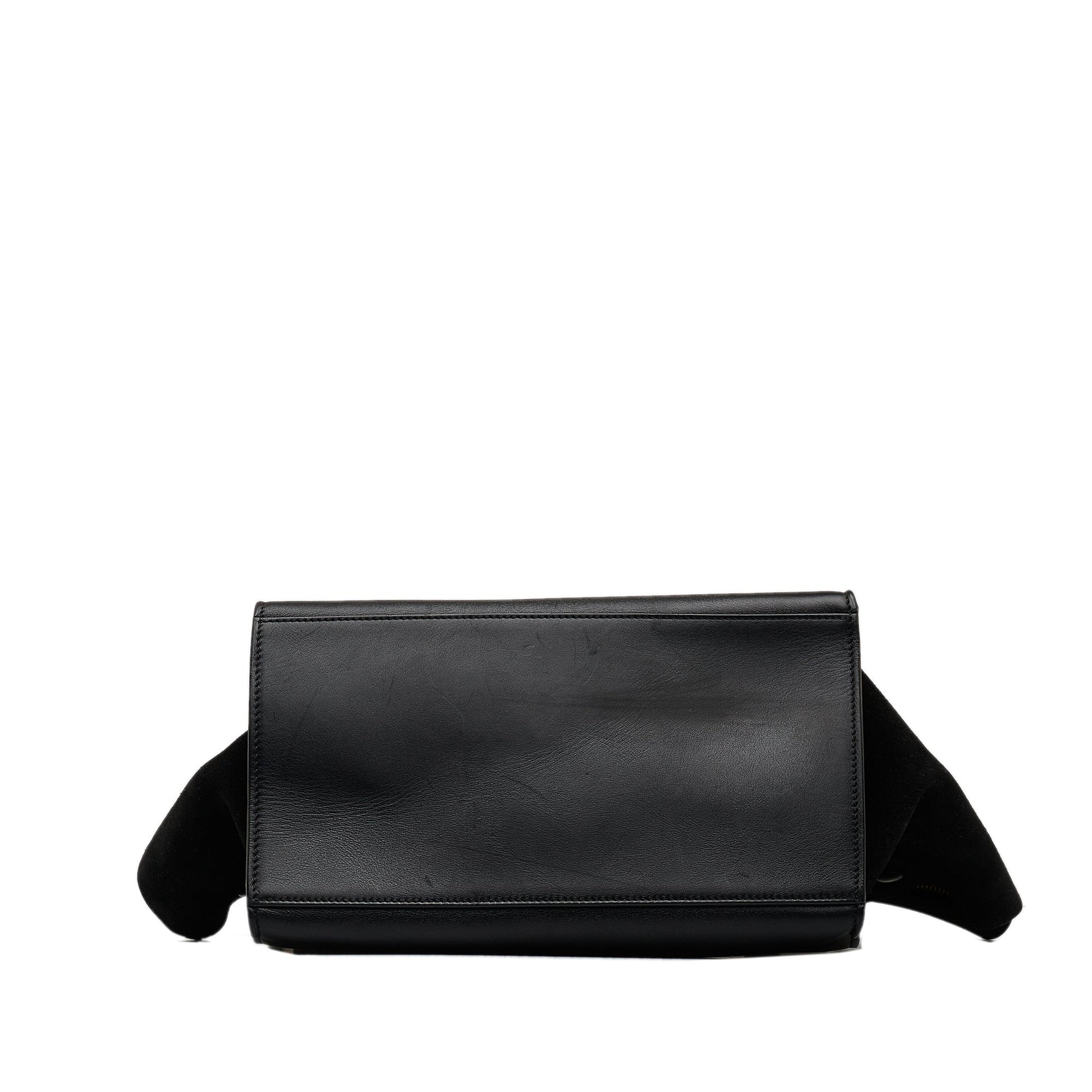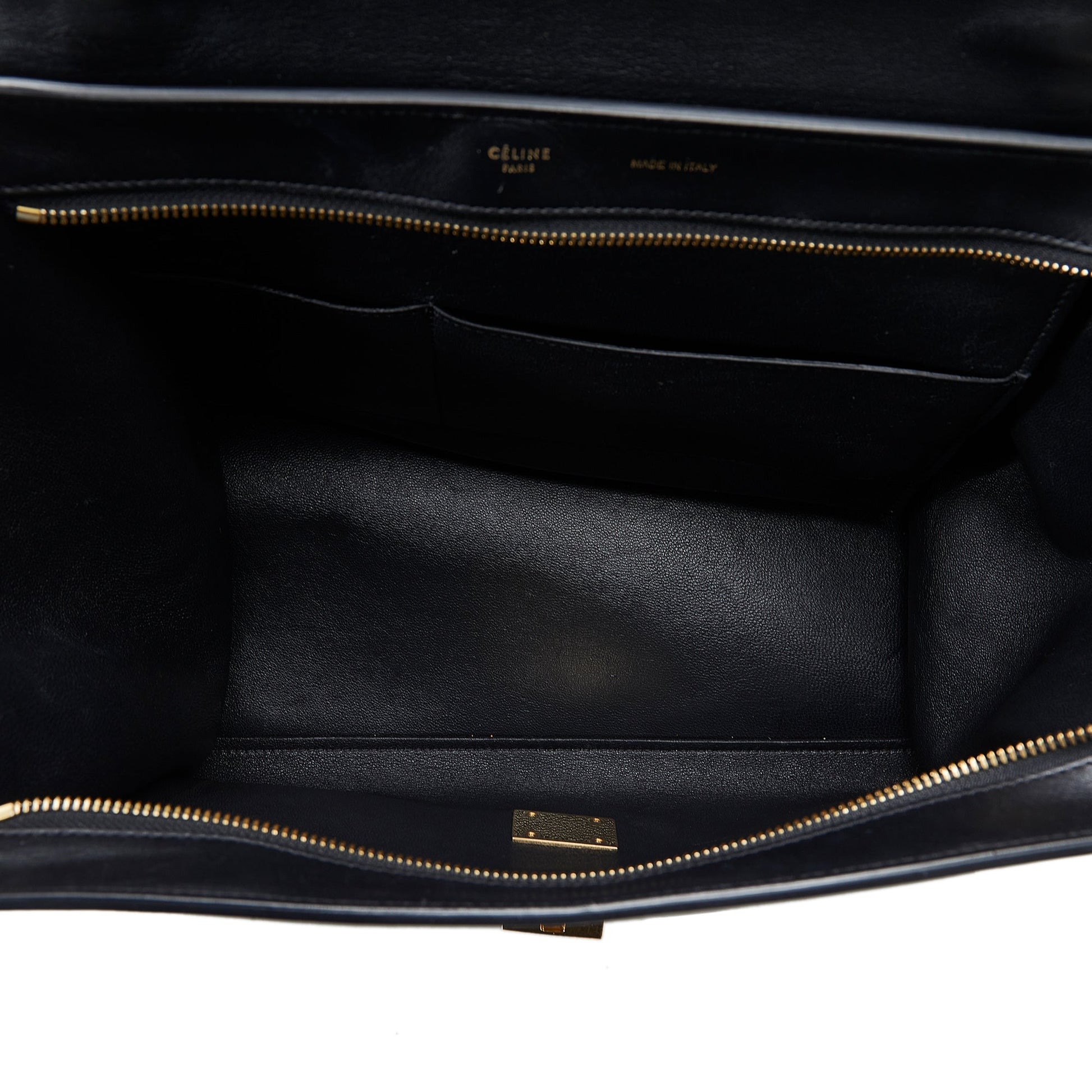 The Trapeze features a leather body, a rolled leather top handle, a detachable flat leather strap, a croc embossed front flap with a clasp closure, a top zip closure, and interior slip pockets.
