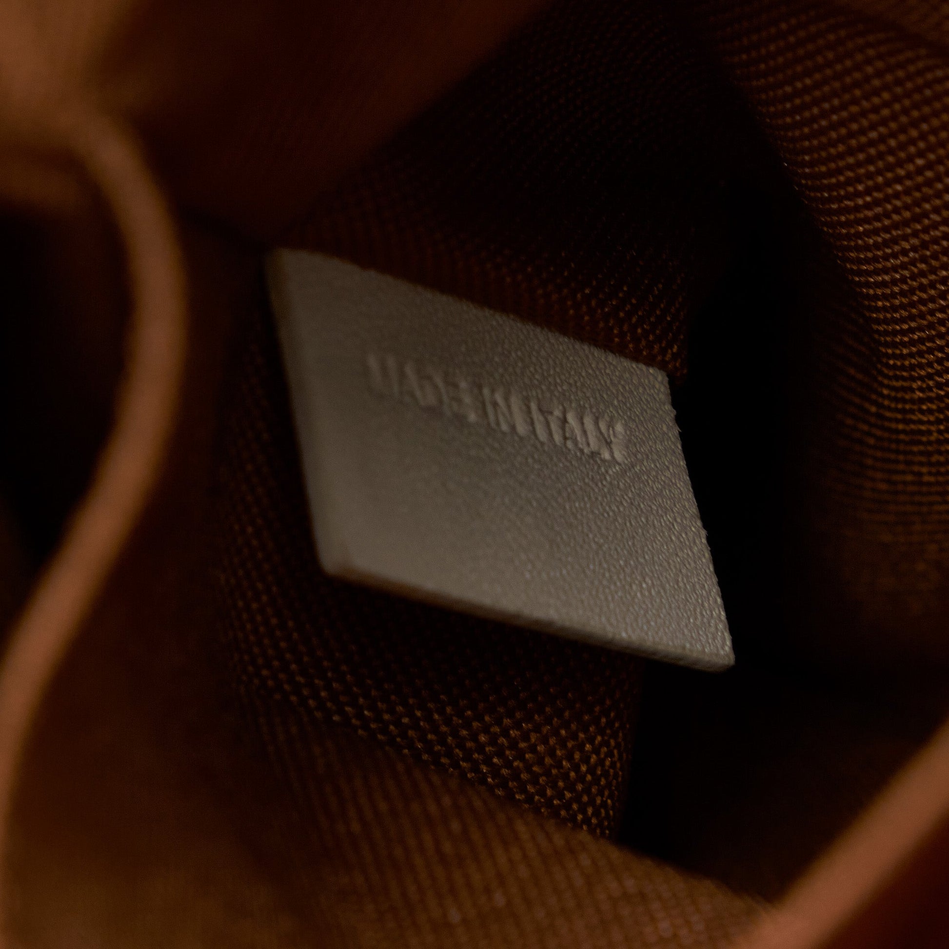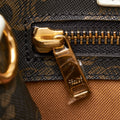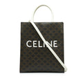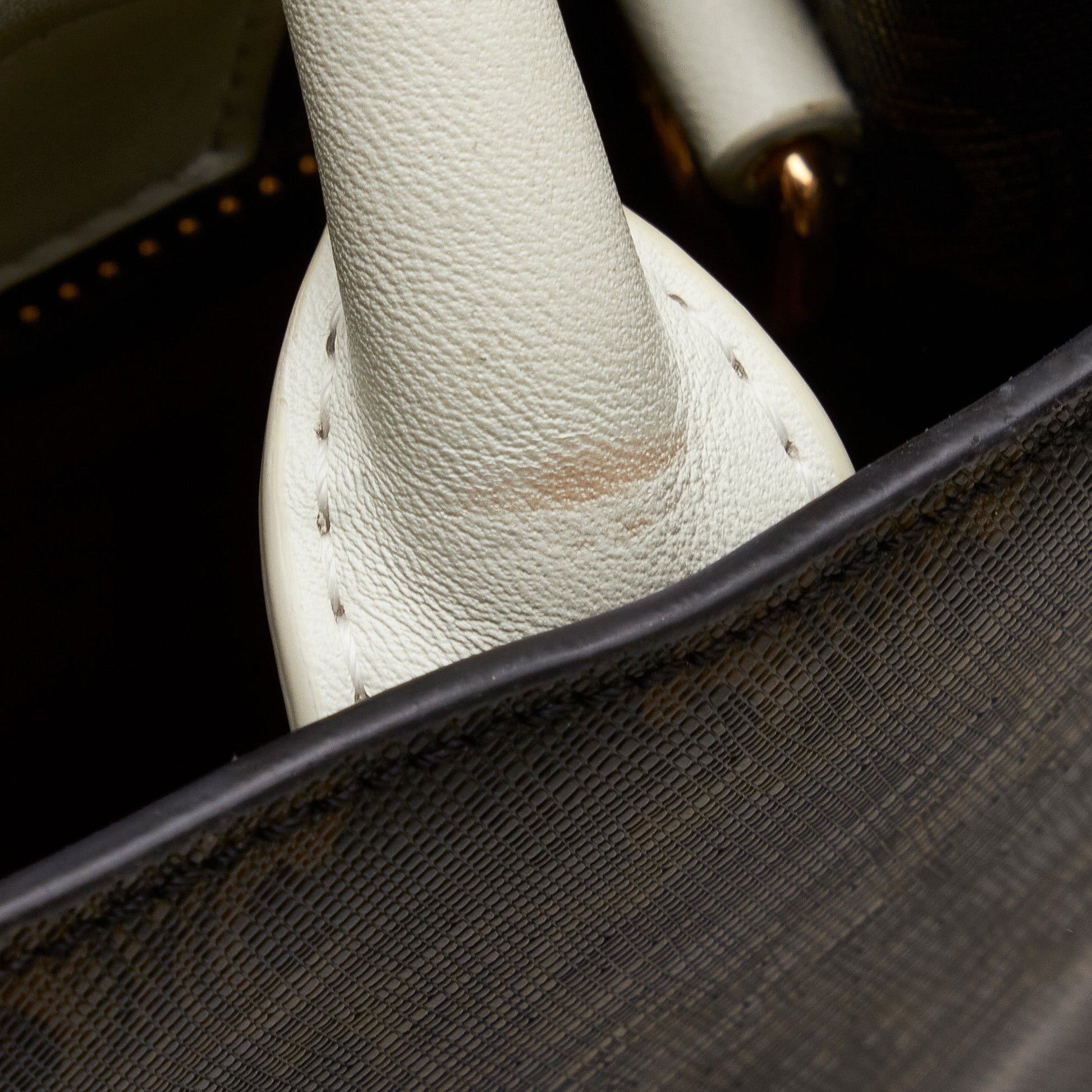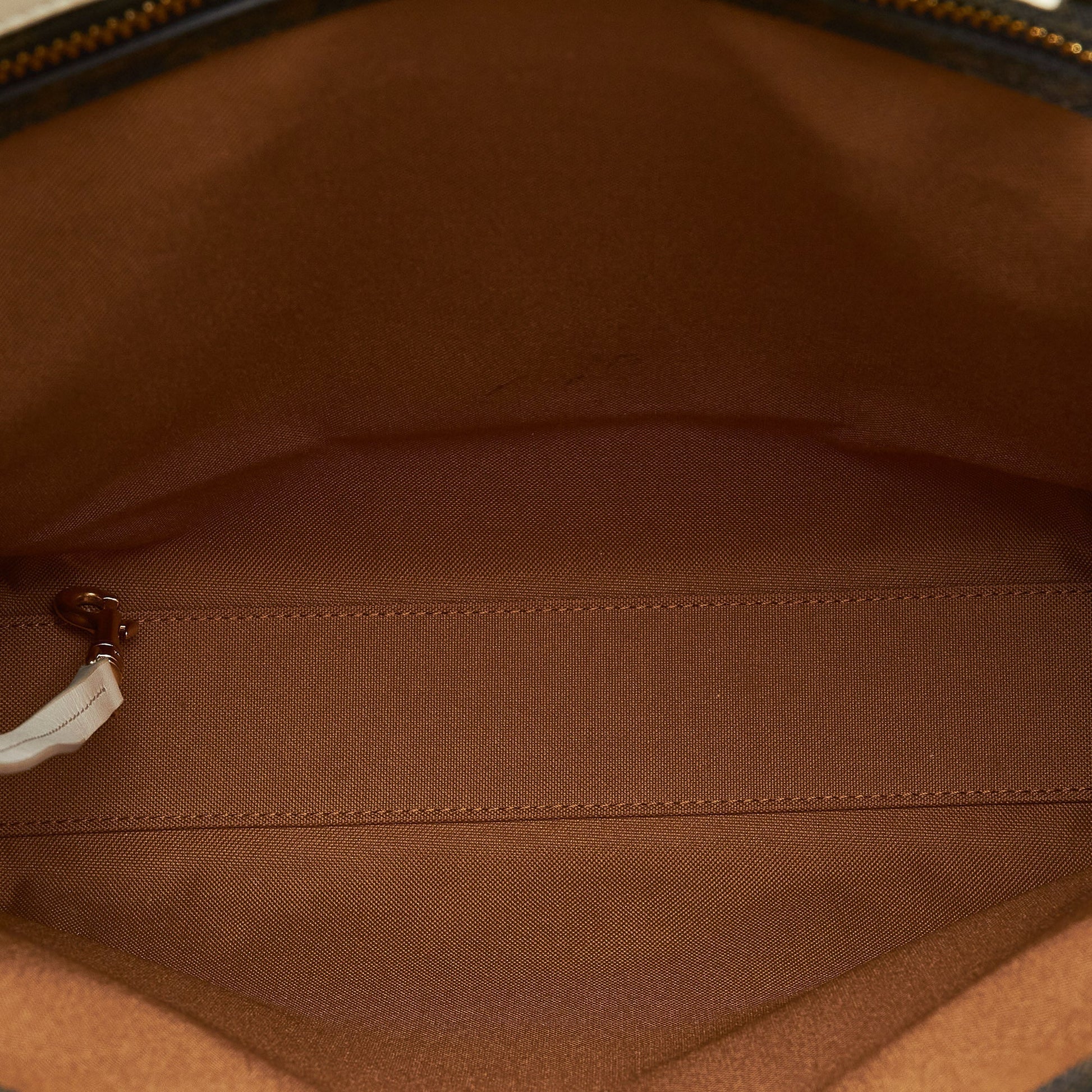 This satchel features a coated canvas body, rolled leather handles, a detachable flat leather strap, an open top, and an interior zip pocket.