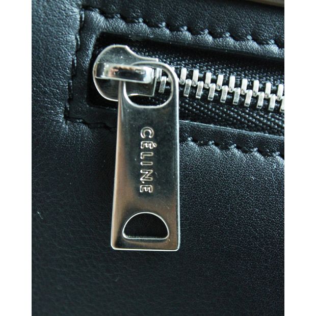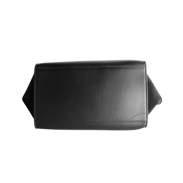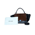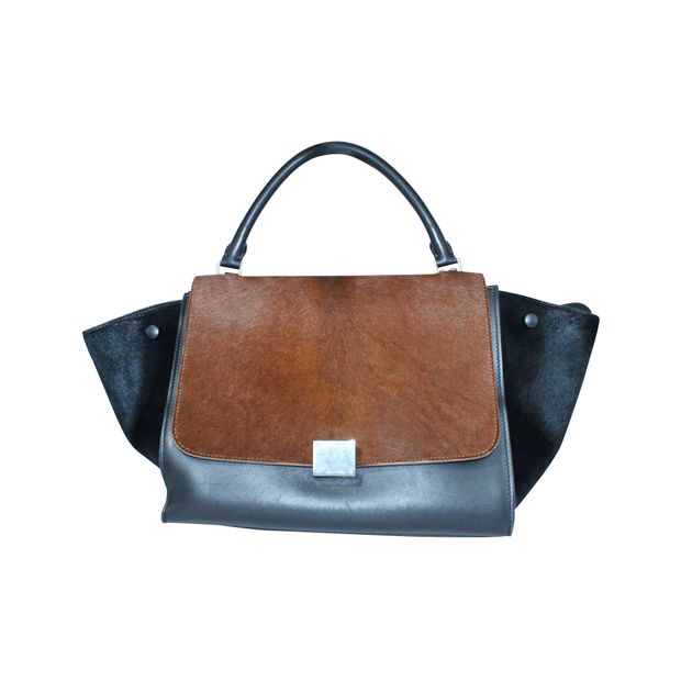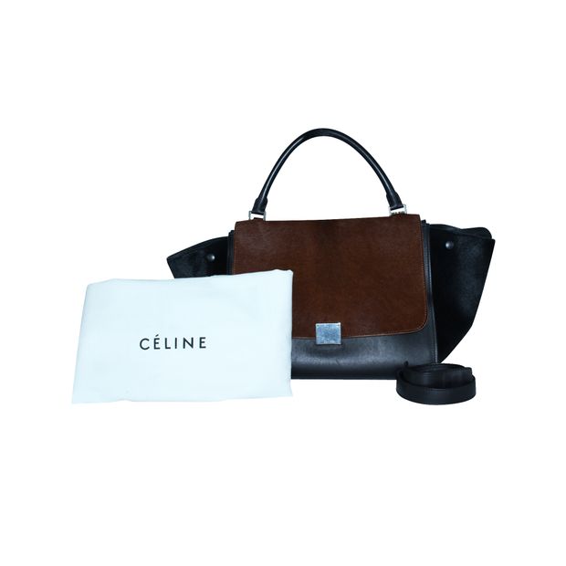 As seen from the Fall/Winter 2013 Collection by Phoebe Philo, the famed Celine Trapeze Tote now comes luxurious brown calf hair and sturdy calfskin in black color, paired with lustrous silver-tone hardware that adds a luxurious touch.