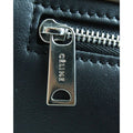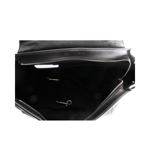 The bag features a flap at the front with flip-lock closure that opens to a tonal leather lining, dual slit pockets at interior wall and zip closure at top.