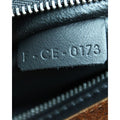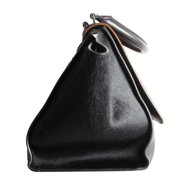 It is designed with a single rolled top handle, black calf hair panels at sides, single exterior zip pocket at back.