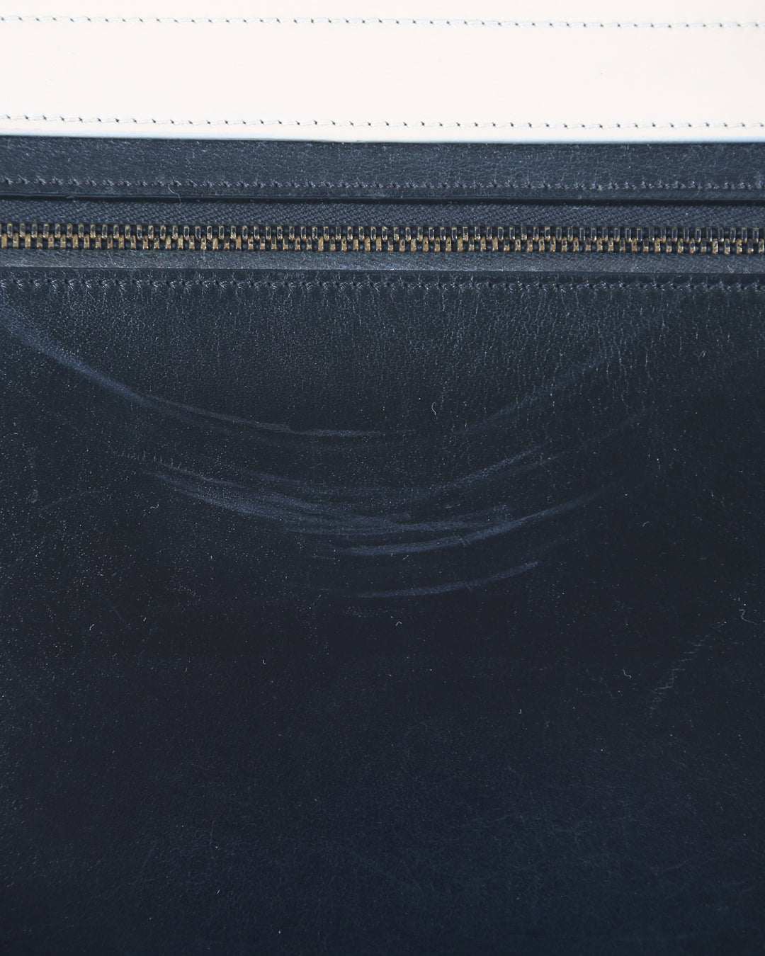 There are surface scratches throughout the leather body and the bottom corners are slightly scuffed (barely noticeable).