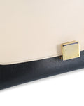 This Celine bag is crafted from black leather body, ivory leather flap, and olive suede wings.