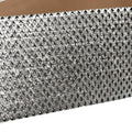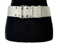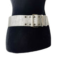 * This wide leather belt is finished in a perforated metallic silver diamond pattern.