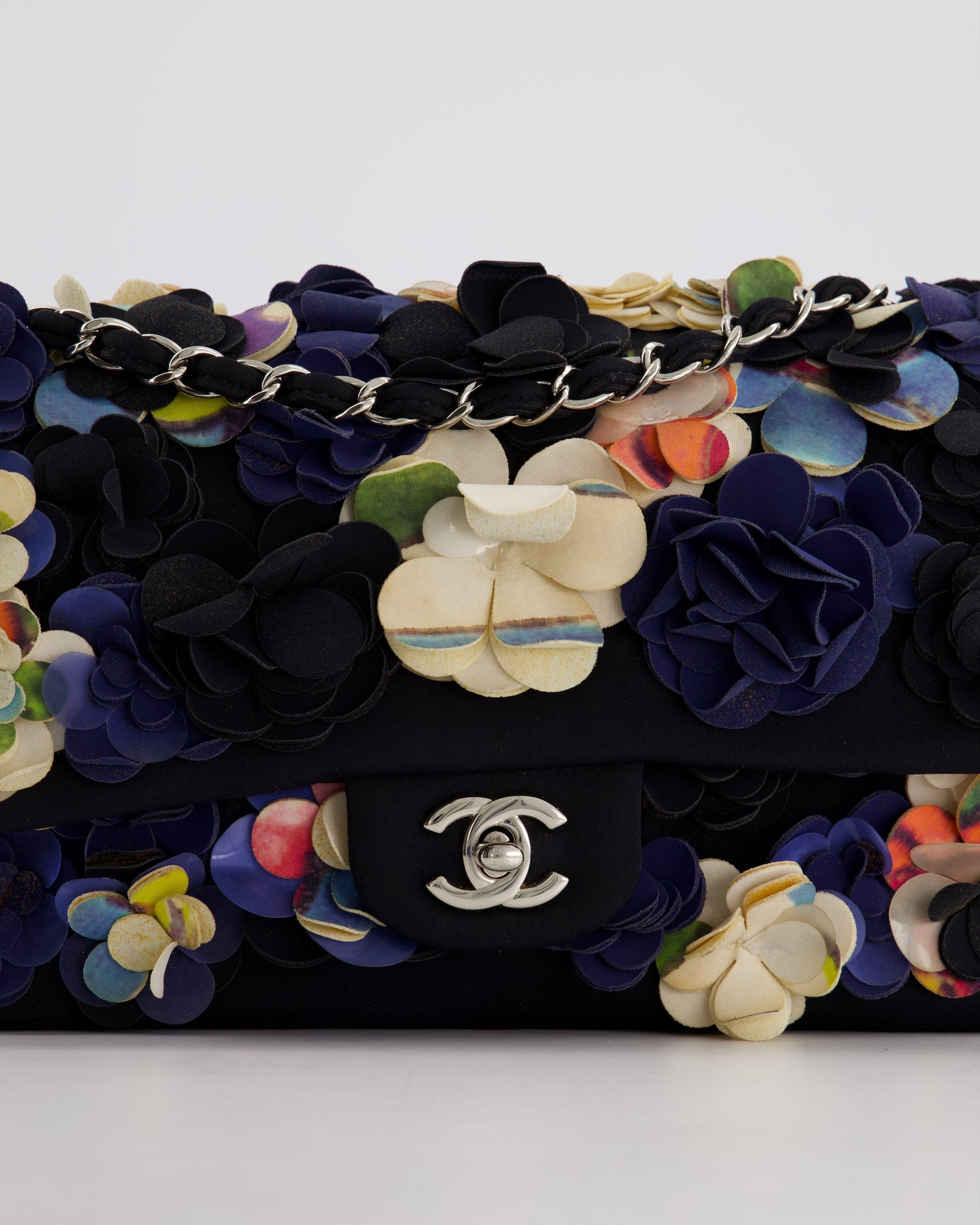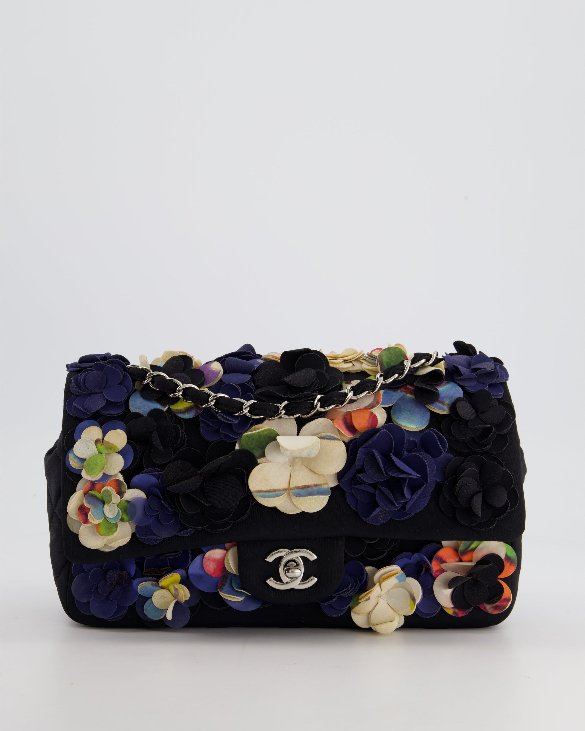 Chanel 15C Navy Camelia Embroidered Flap Bag in Fabric Material with Silver Hardware