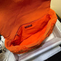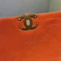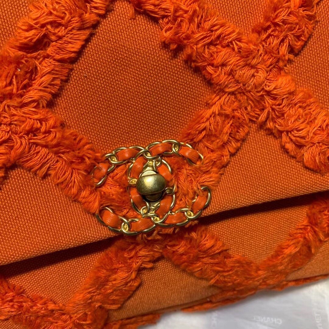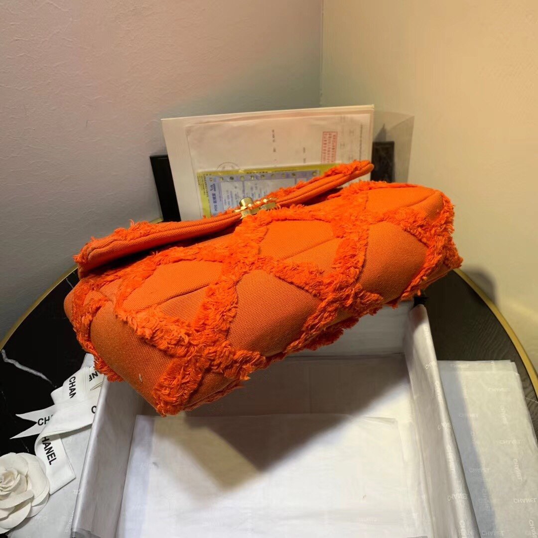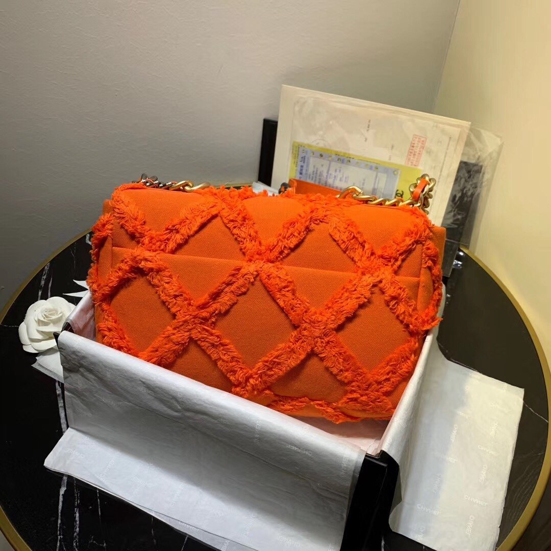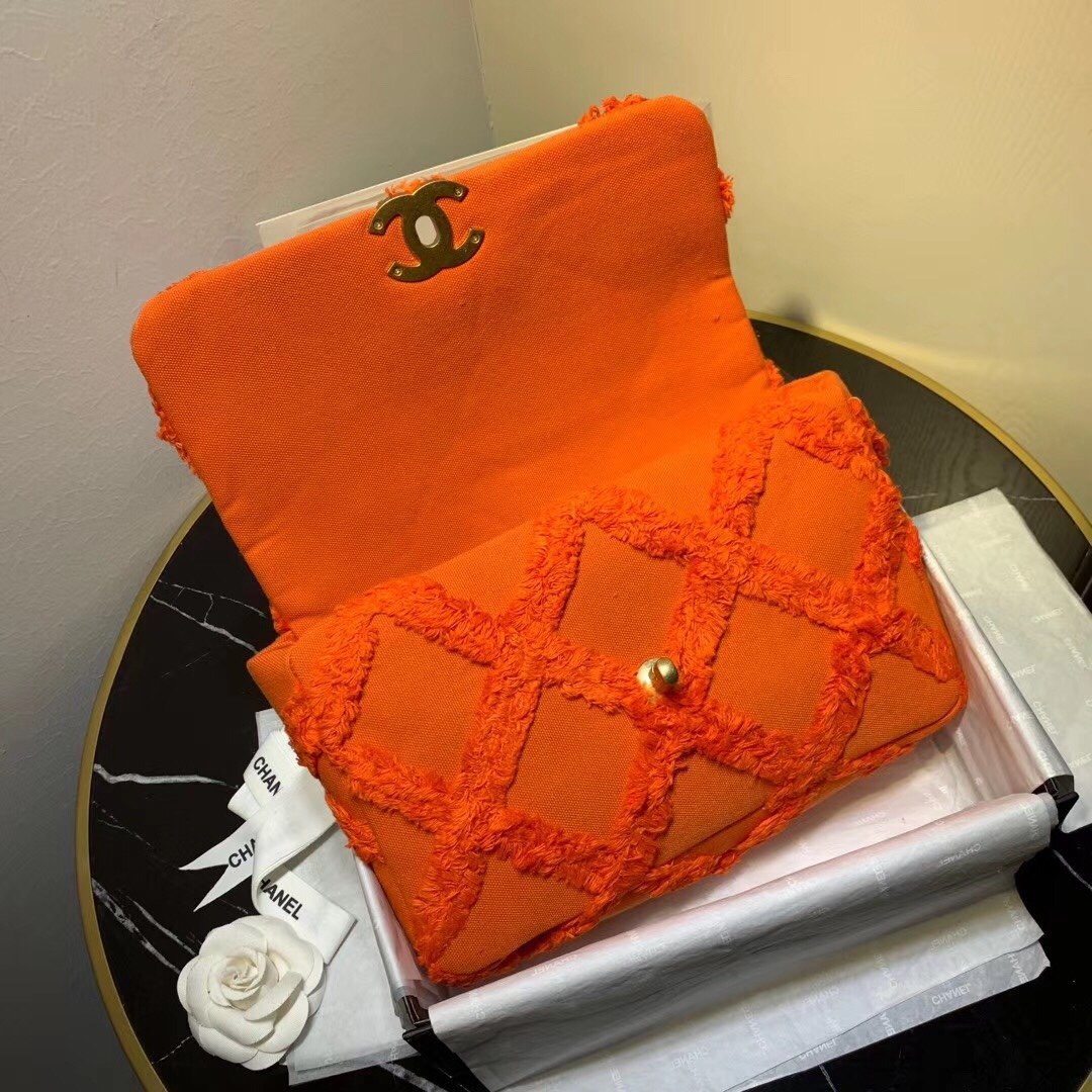 We this is an CHANEL Quilted Medium Chanel 19 Flap Orange or This pillowy soft shoulder bag is crafted of oversized quilted goatskin leather in orange. The refined bag features a chain detail CC turn-lock on the flap, a magnetic snap pocket on the back, a chunky matte gold chain top handle, and a leather threaded gradient gold to ruthenium chain-link shoulder strap. The front flap opens to a fabric interior with a zipper pocket. This versatile bag is essential for any Chanel aficionado!