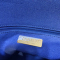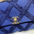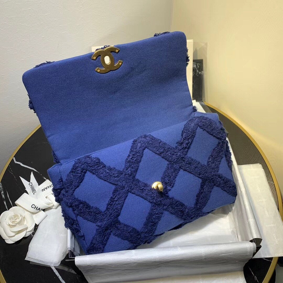 We this is an CHANEL Quilted Medium Chanel 19 Flap Blue or This pillowy soft shoulder bag is crafted of oversized quilted leather in blue. The refined bag features a chain detail CC turn-lock on the flap, a magnetic snap pocket on the back, a chunky matte gold chain top handle, and a leather threaded gradient gold to ruthenium chain-link shoulder strap. The front flap opens to a fabric interior with a zipper pocket. This versatile bag is essential for any Chanel aficionado!