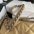 The Chanel 19 collection was first introduced for Chanel's Fall/Winter 2019 Act 2 collection, to signify Karl Lagerfeld's final collection before his passing. The Chanel 19 collection features a chunky two-tone chain strap, puffy quilting and luxurious fabrics incorporated in the styles. This particular bag is made from a puffy goatskin leather with chain entwined CC emblem closure. For the avid Chanel collector's this is the one that is not to be missed!