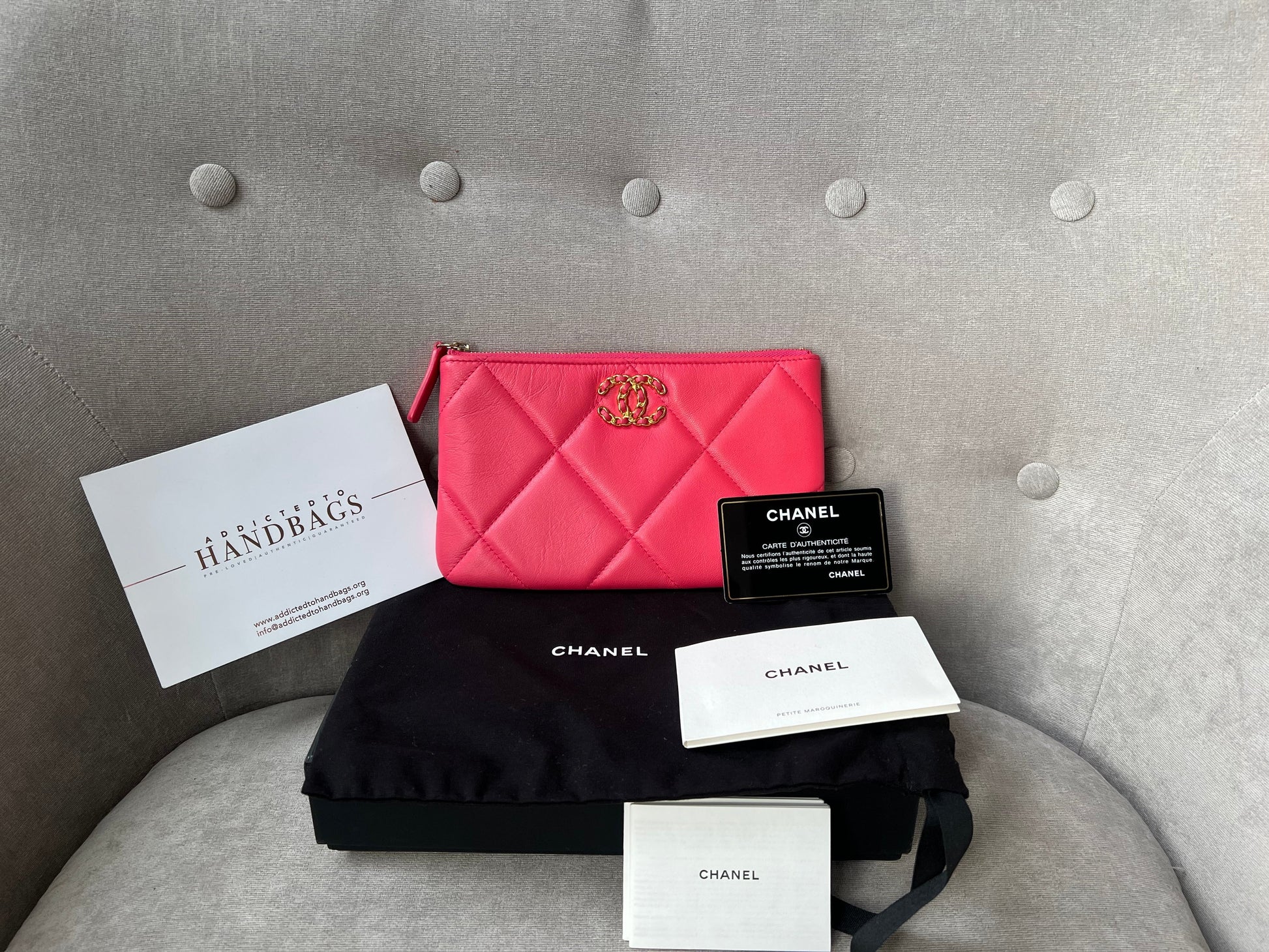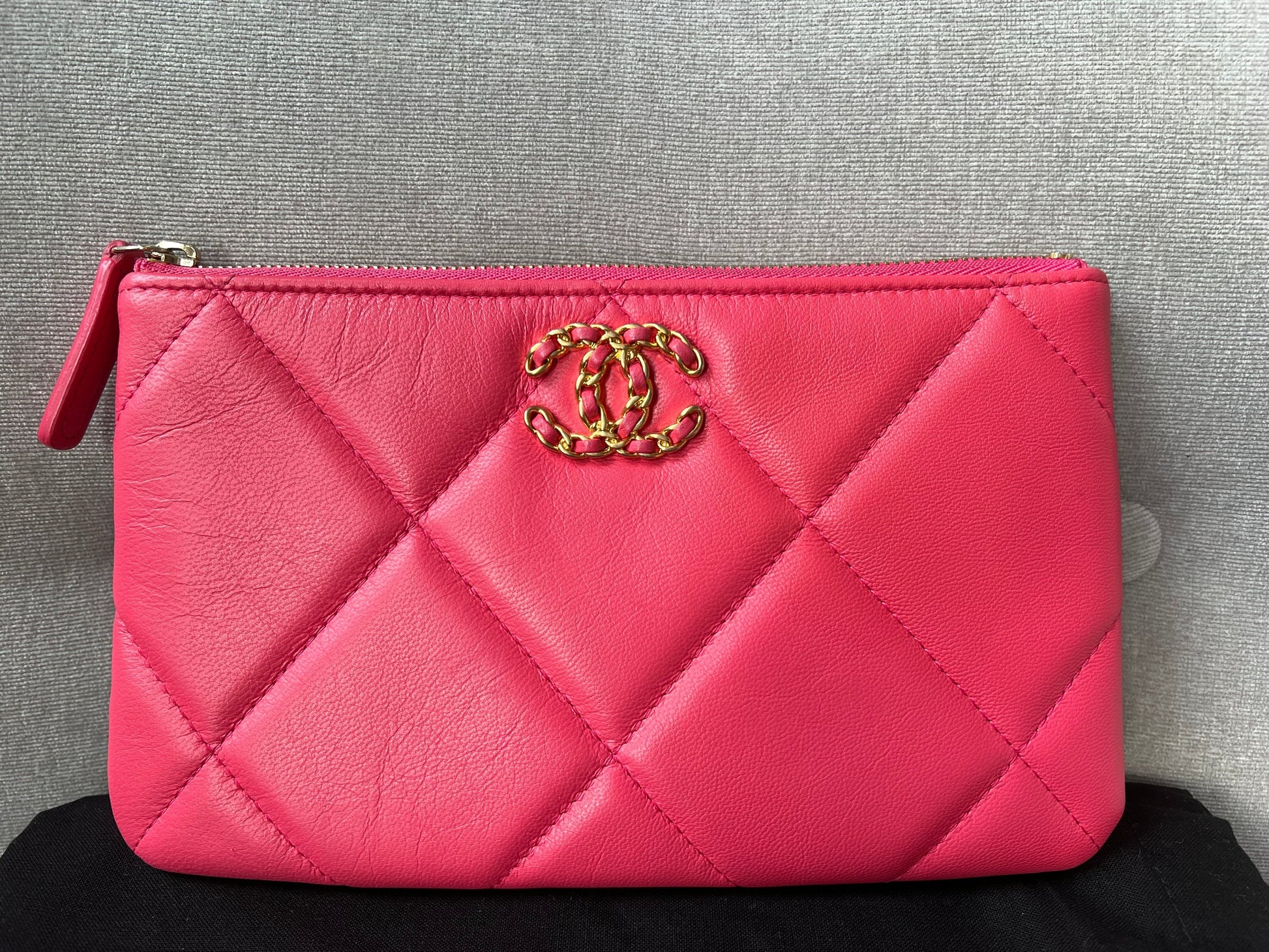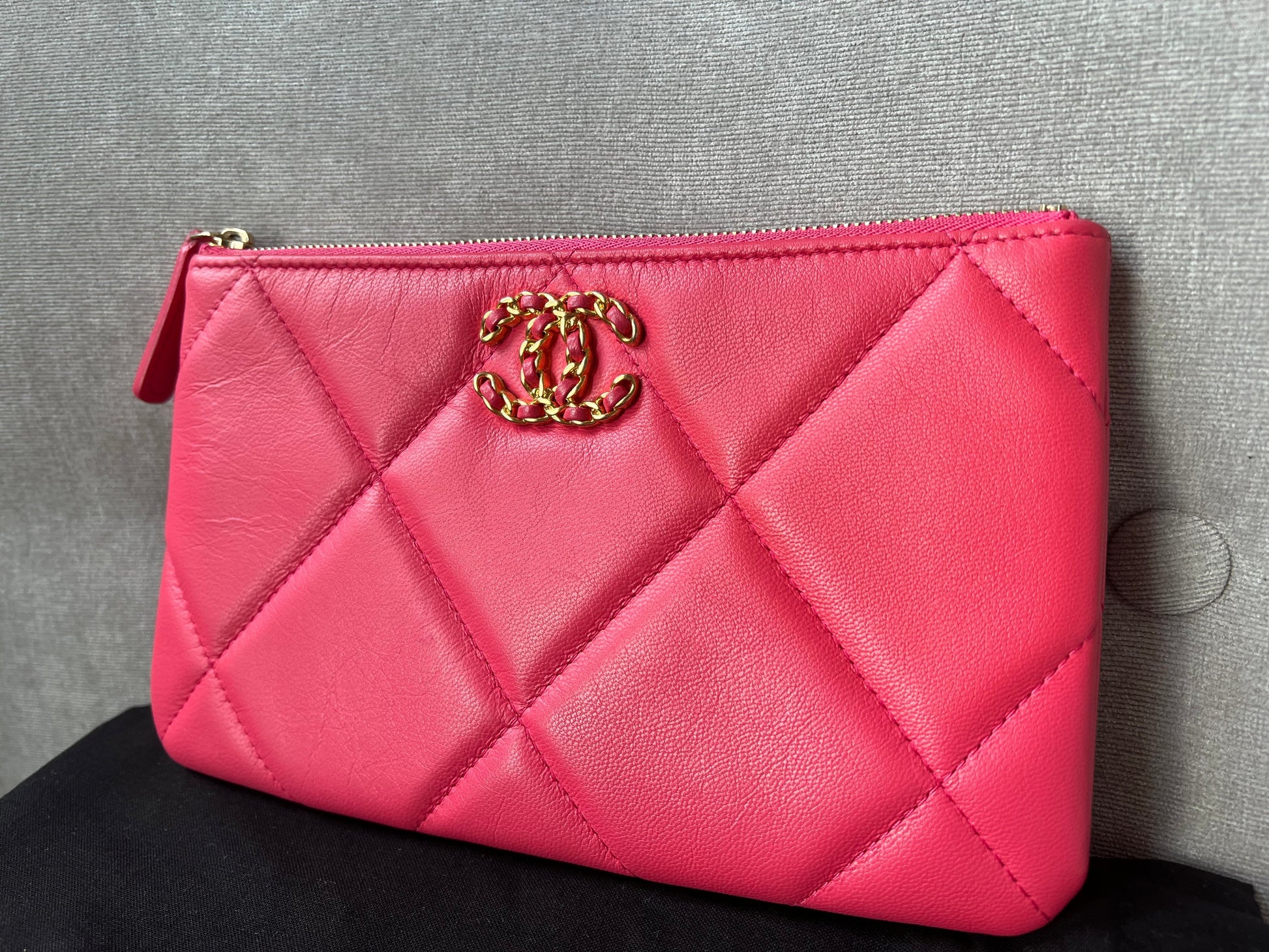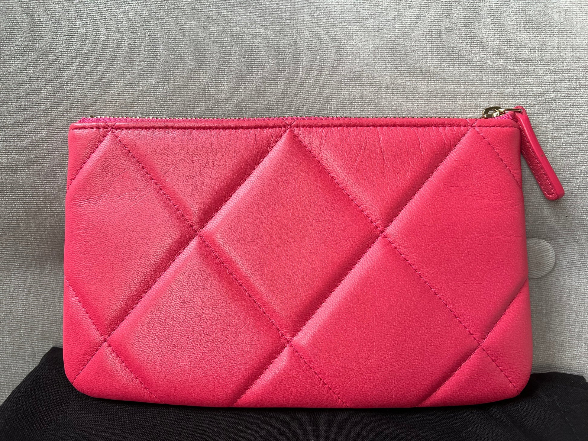 Chanel 19 Small Ocase in Pink lambskin leather with pale gold hardware. pouch for storing cards, coins, keys and possibly lipstick. Zipper closure. Could also be used as a small clutch. Highly sought after and rare.