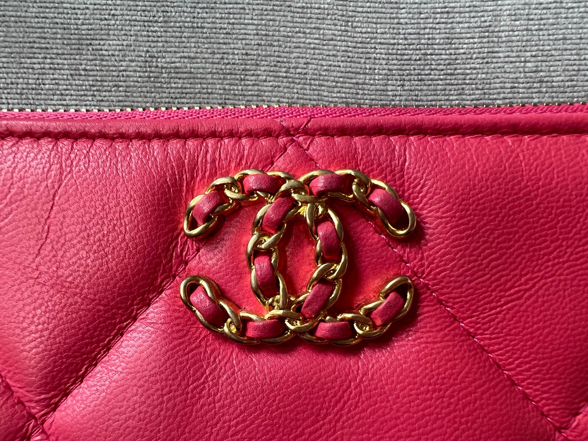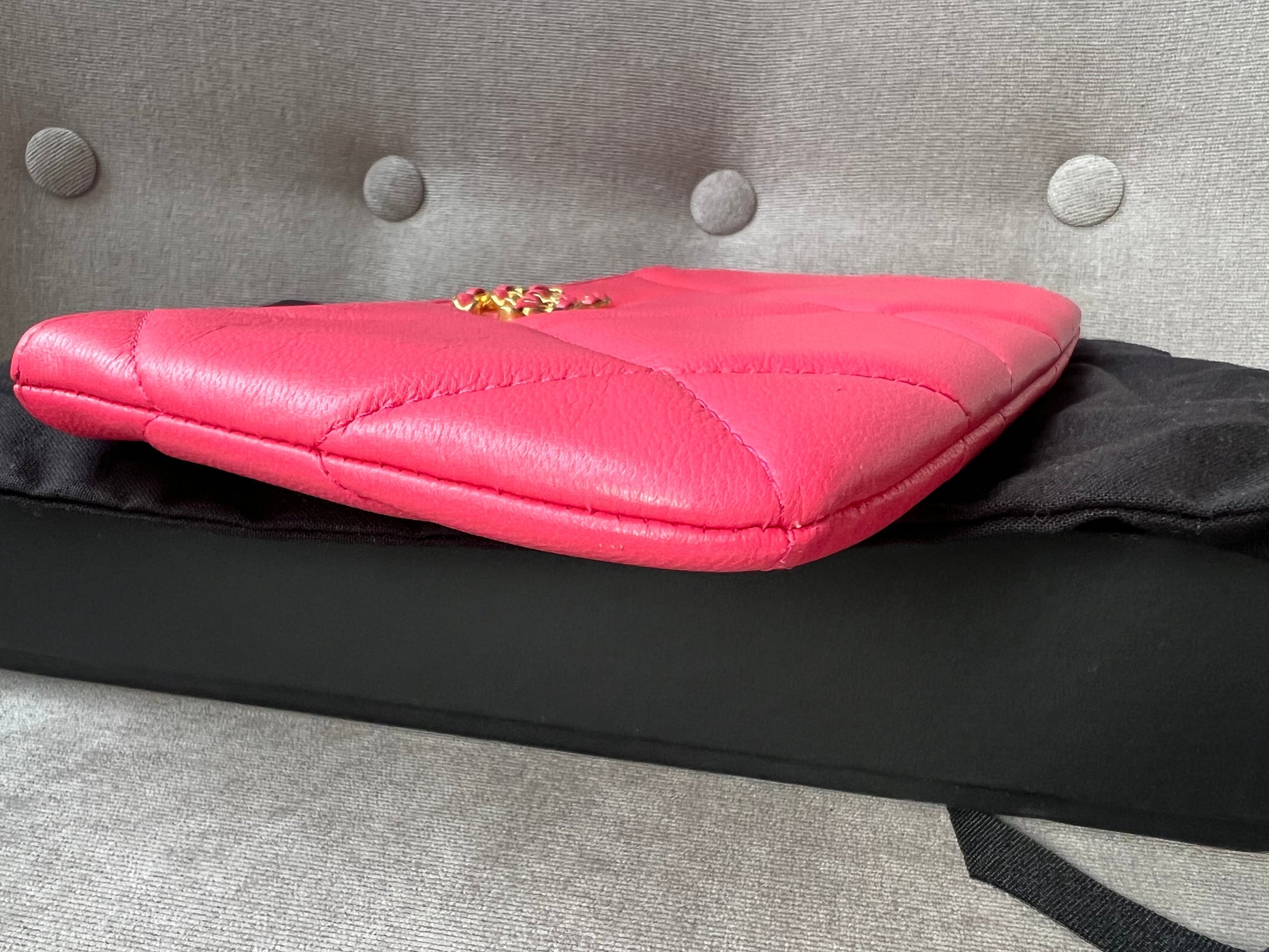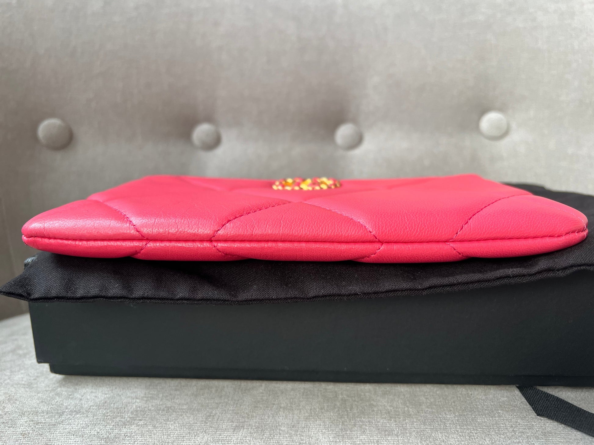 Chanel 19 Small Ocase in Pink lambskin leather with pale gold hardware. pouch for storing cards, coins, keys and possibly lipstick. Zipper closure. Could also be used as a small clutch. Highly sought after and rare.