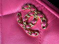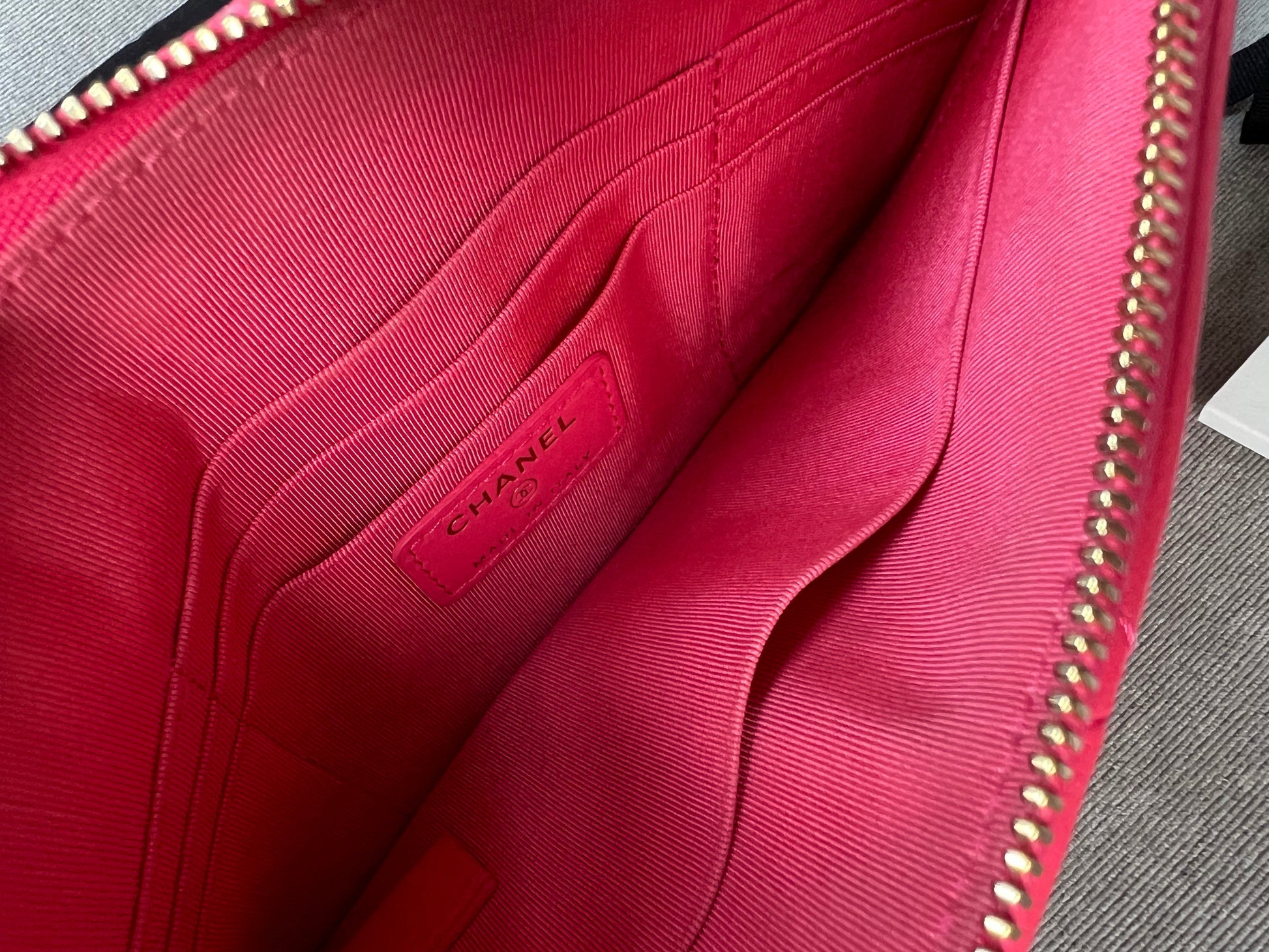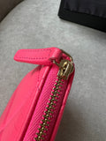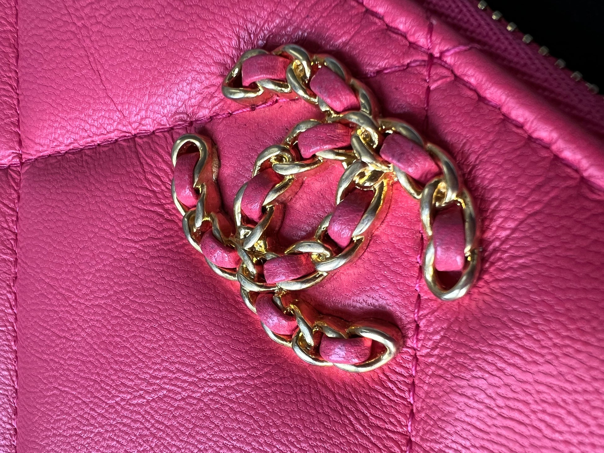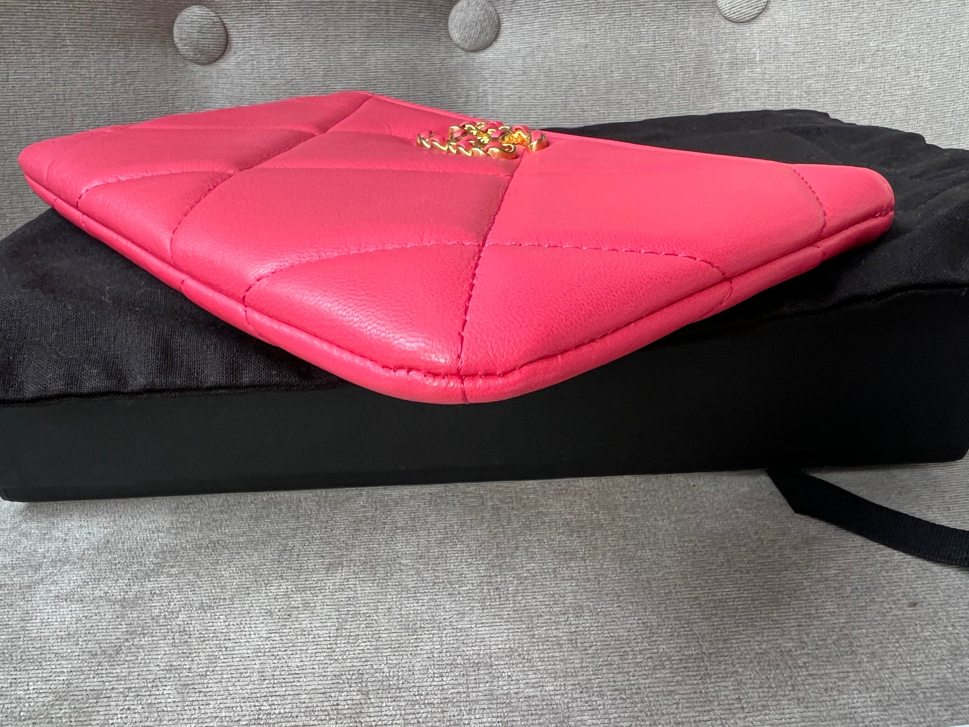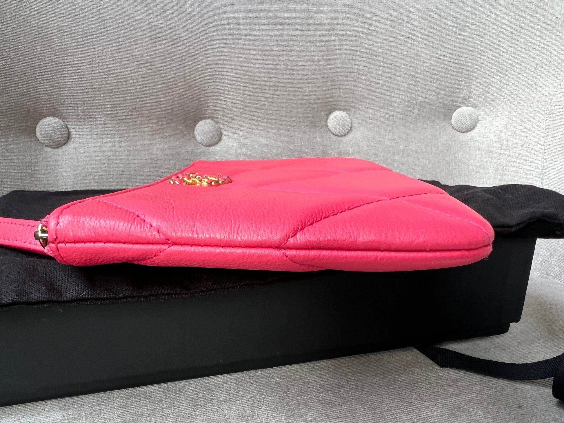 Chanel 19 Small Ocase in Pink lambskin leather with pale gold hardware. pouch for storing cards, coins, keys and possibly lipstick. Zipper closure. Could also be used as a small clutch. Highly sought after and rare.