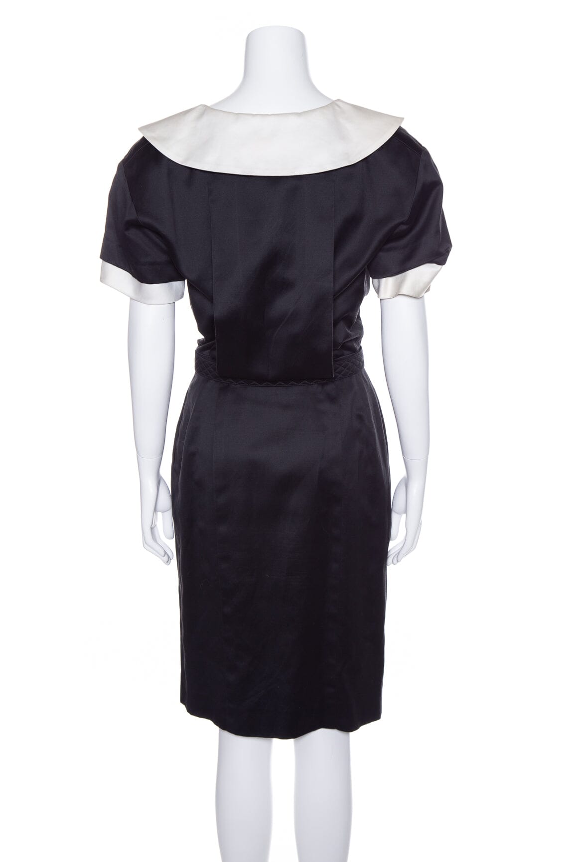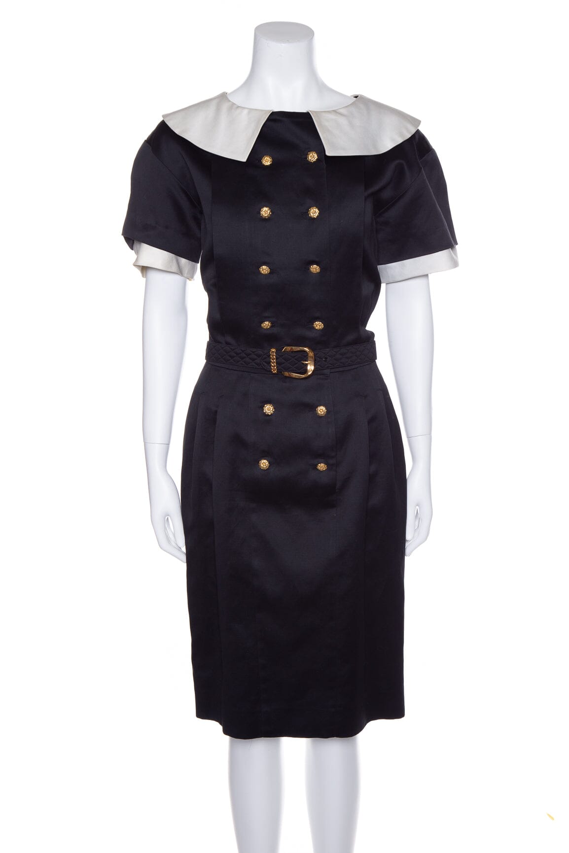 Chanel 1980's Black Dress with Gold Camellia Buttons and White Collar. This item is in good condition.