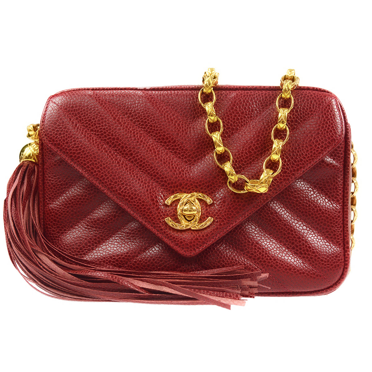 CHANEL V stitch Fringe Bijou Chain Shoulder Bag Red Caviar