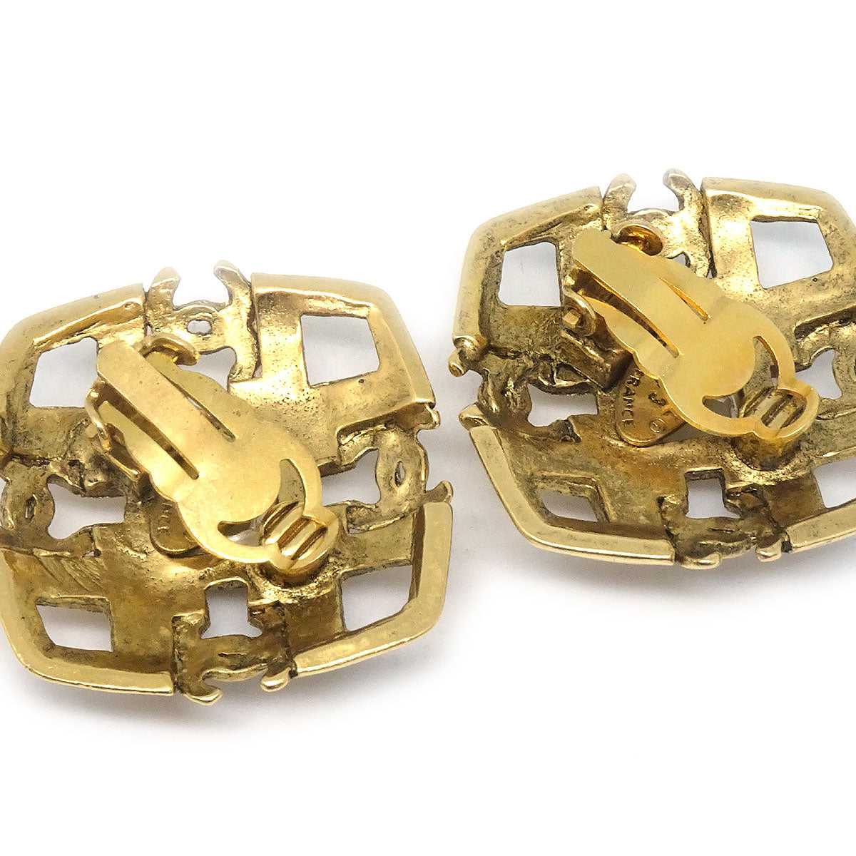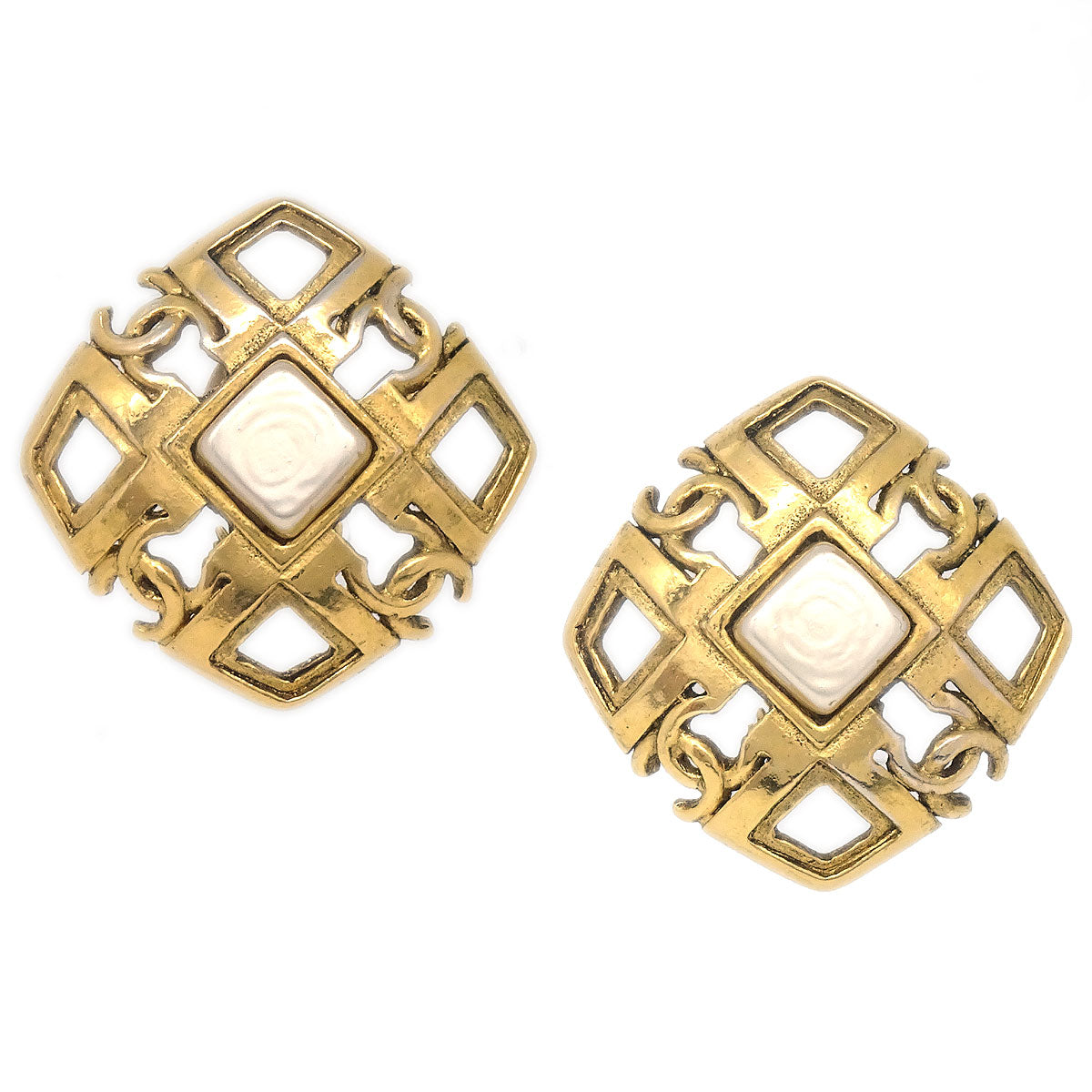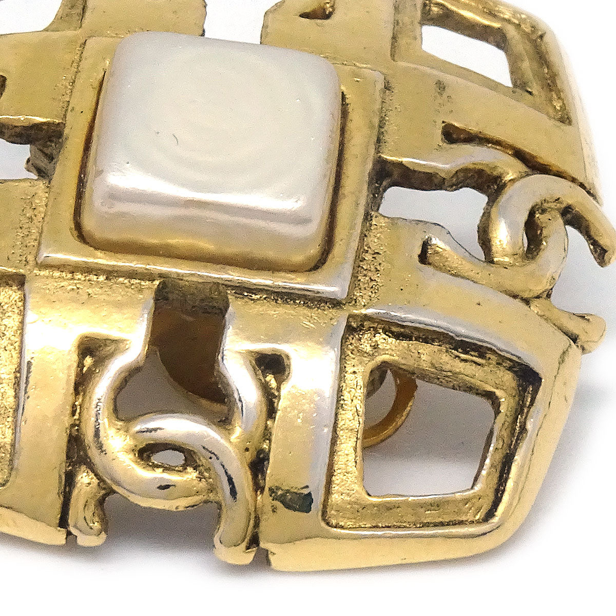 CHANEL Rhombus Imitation Pearl Earrings Clip-On Gold 23