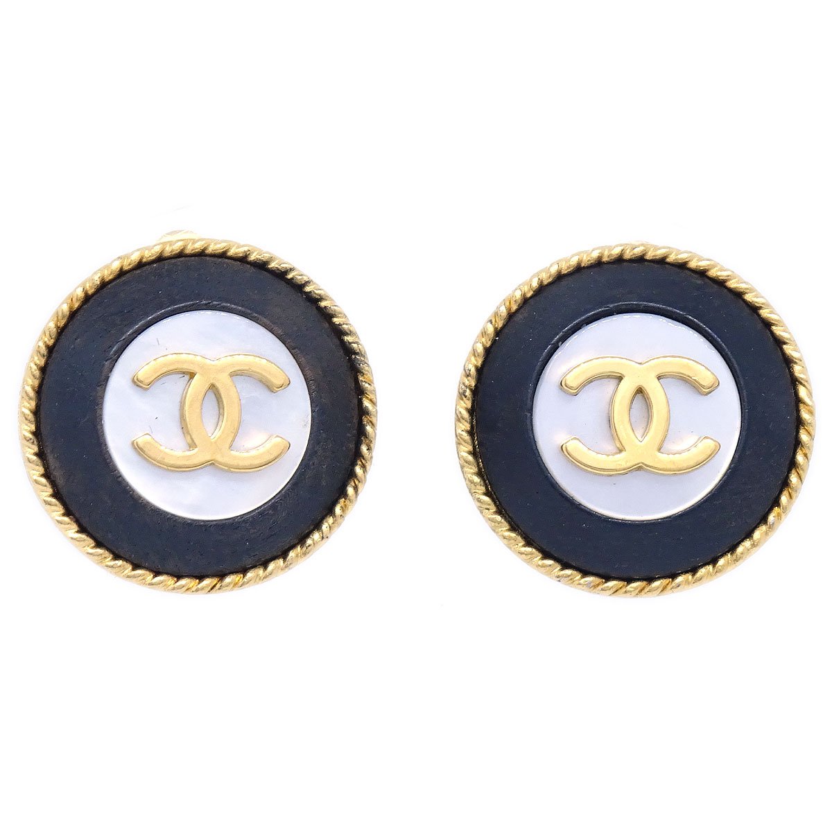 CHANEL 1993 Mother of Pearl Earrings Gold Black Clip-On 61981