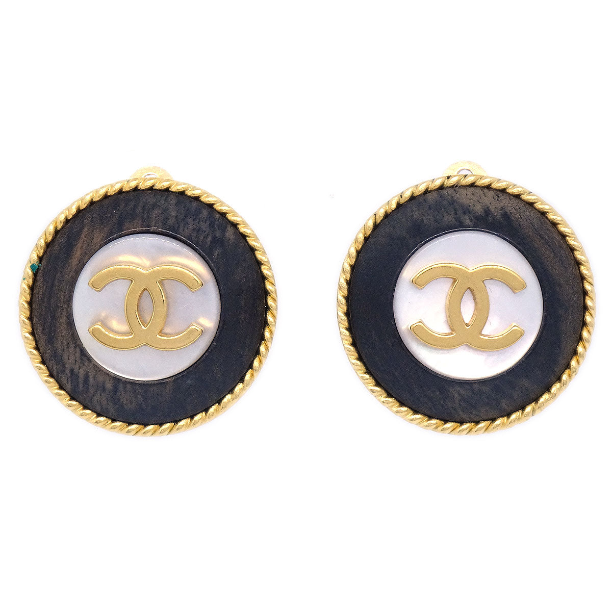 CHANEL 1995 Mother-of-pearl Button Earrings Gold Brown Clip-On 94728