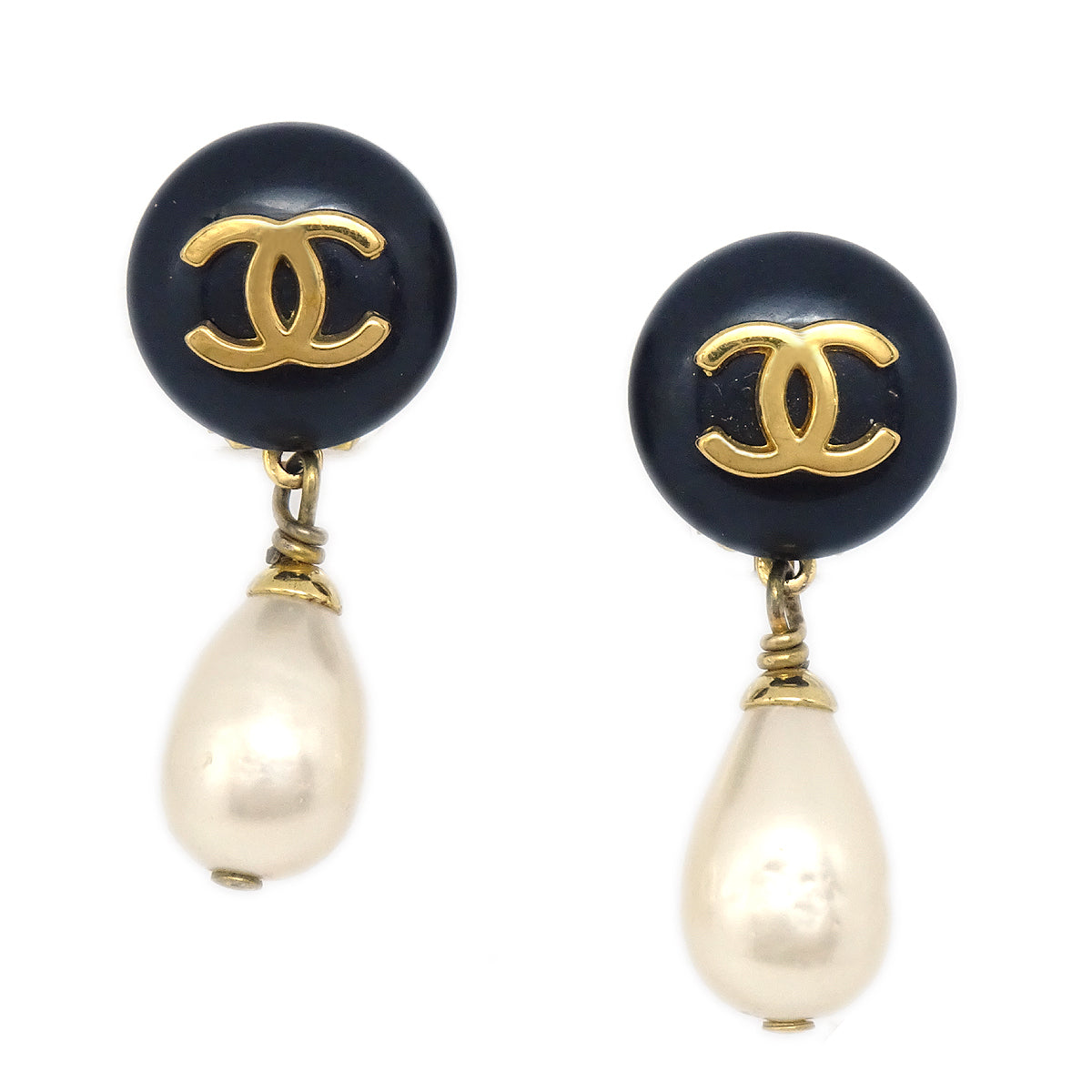 Chanel Artificial Pearl Dangle Earrings Clip-On Black 96P