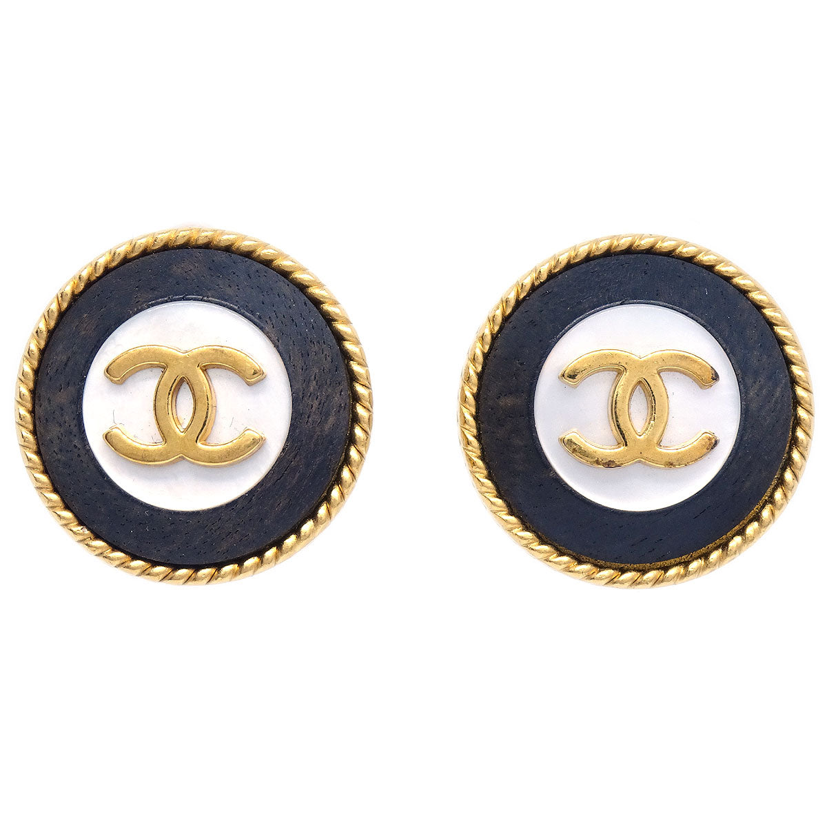 CHANEL 1997 Mother of Pearl Button Earrings Gold Black Clip-On 04327