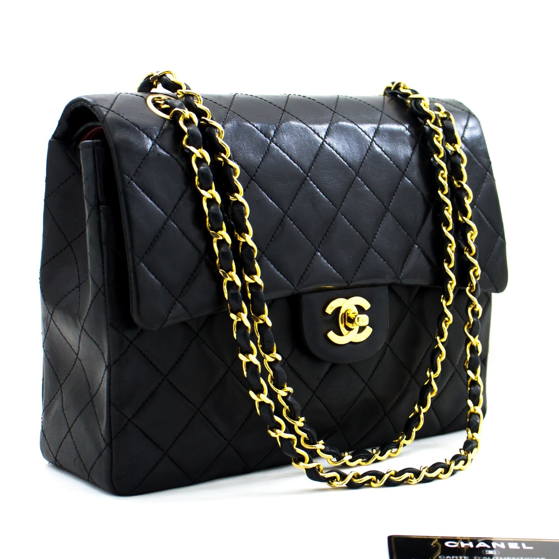 An entic CHANEL 2.55 Classic Double Flap Square Chain Shoulder Bag Black made of black Lambskin.
