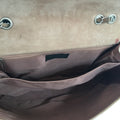 This gorgeous shoulder bag is crafted of suede in Beige with matte silver hardware