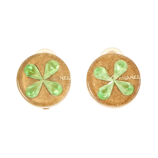 CHANEL 2001 Made Rhinestone Clover Earrings Gold/ Green