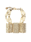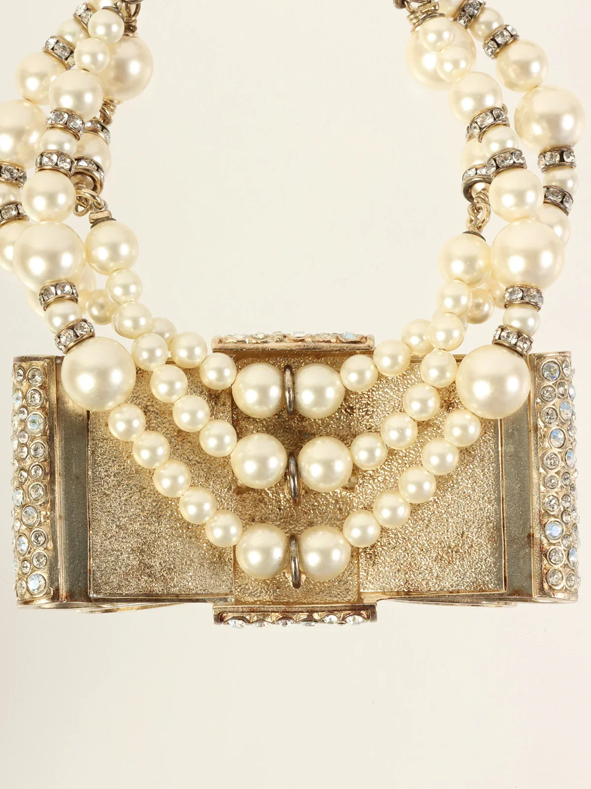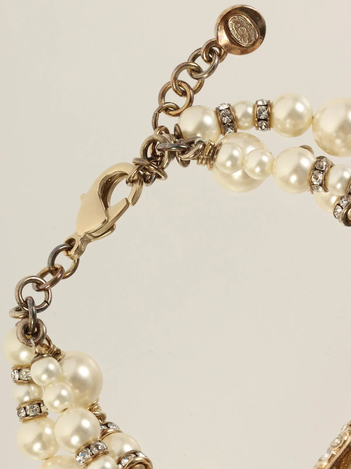 CHANEL 2013 Made Pearl Rhinestone Ribbon Motif Bracelet Gold/White