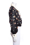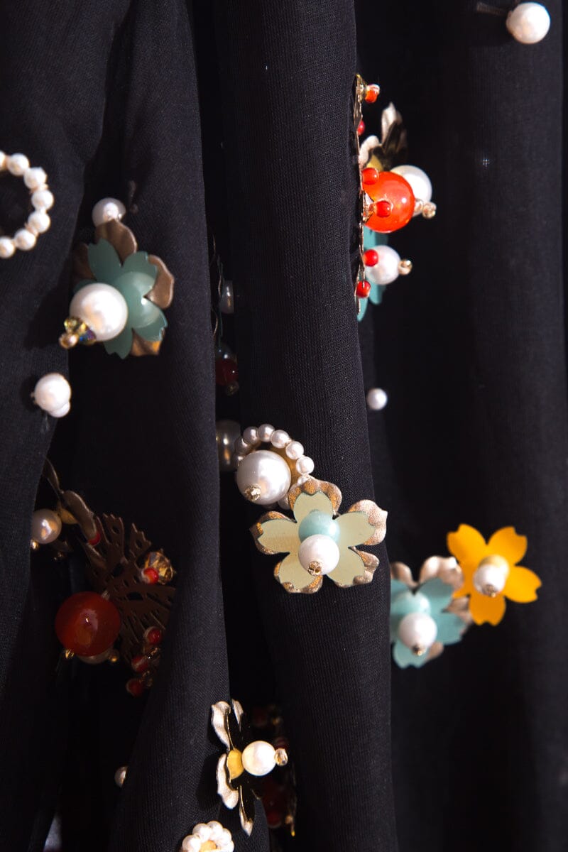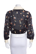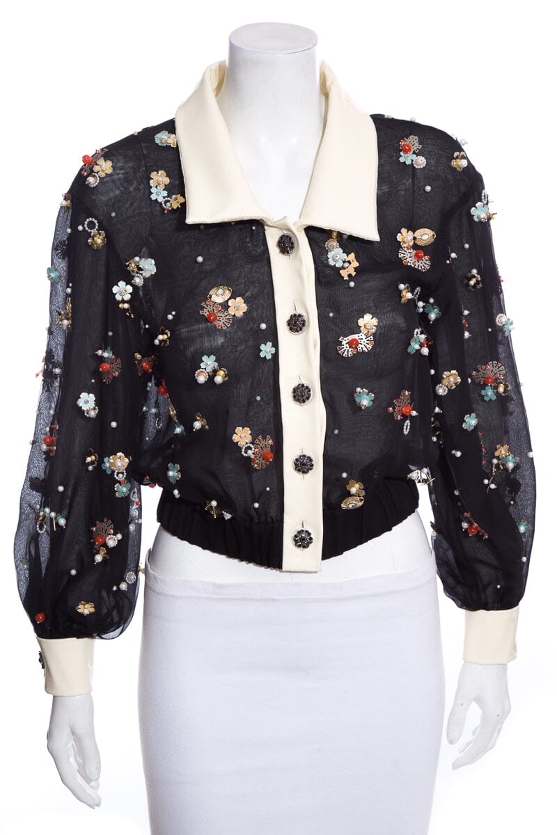 Chanel 2016 Seoul Collection Silk Organza Black Jacket W/ Beaded Flower Detail; includes Chanel Hanger, Some slight color transfer on Patent Collar and Sleeves.