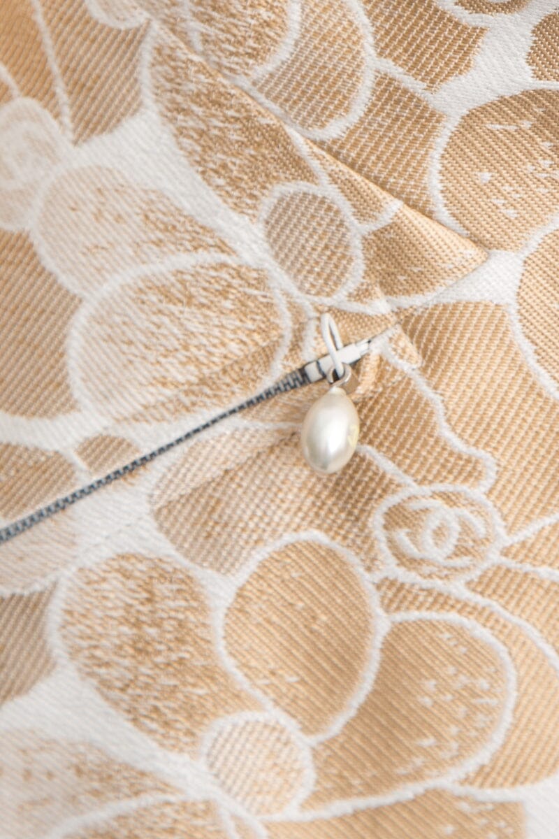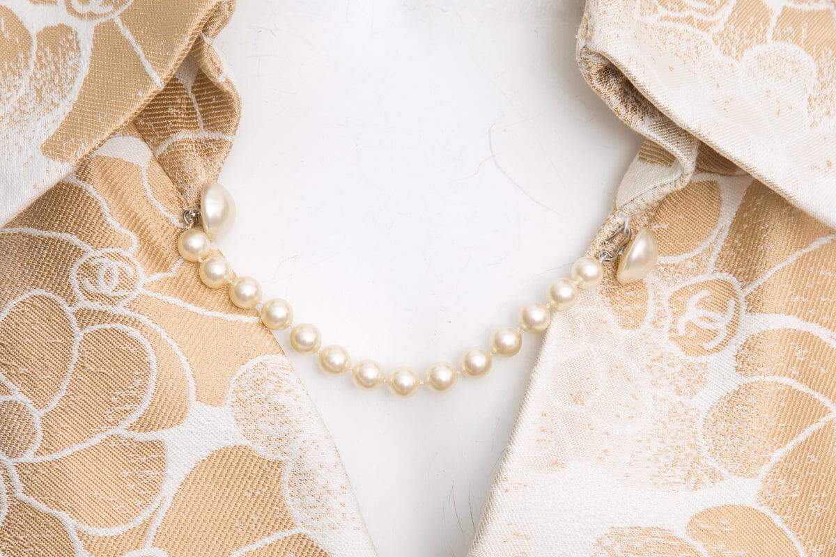 Chanel 2017 Cream/Gold Floral Print Jacket with Pearl Strand Detail. This item is in very good condition.