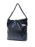 The Chanel 22 Tote Bag comes in a shiny quilted calfskin and black-tone metal hardware.