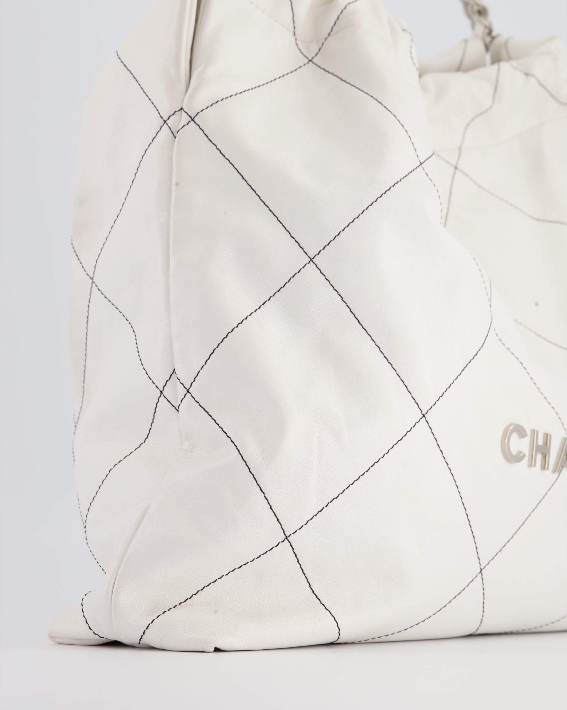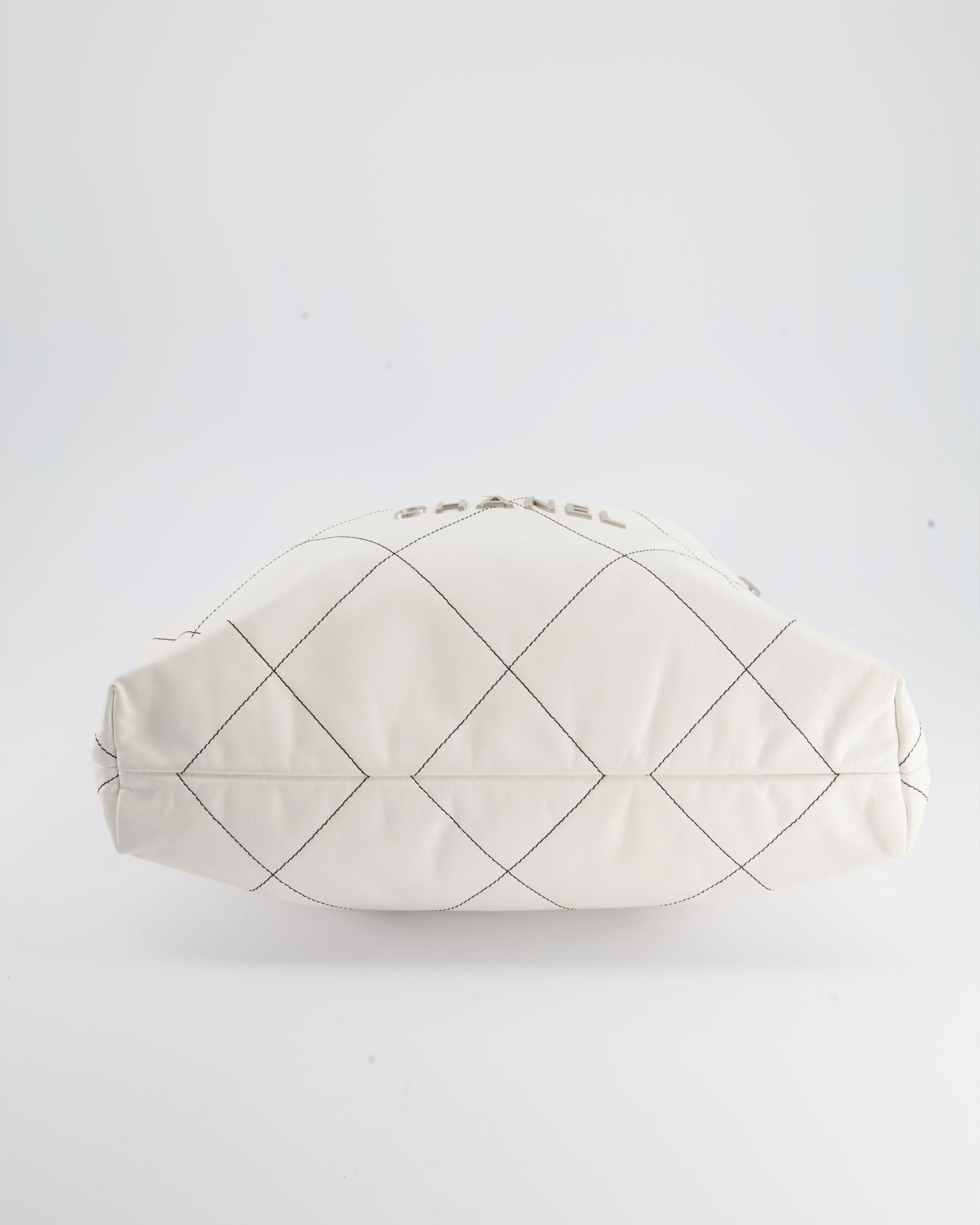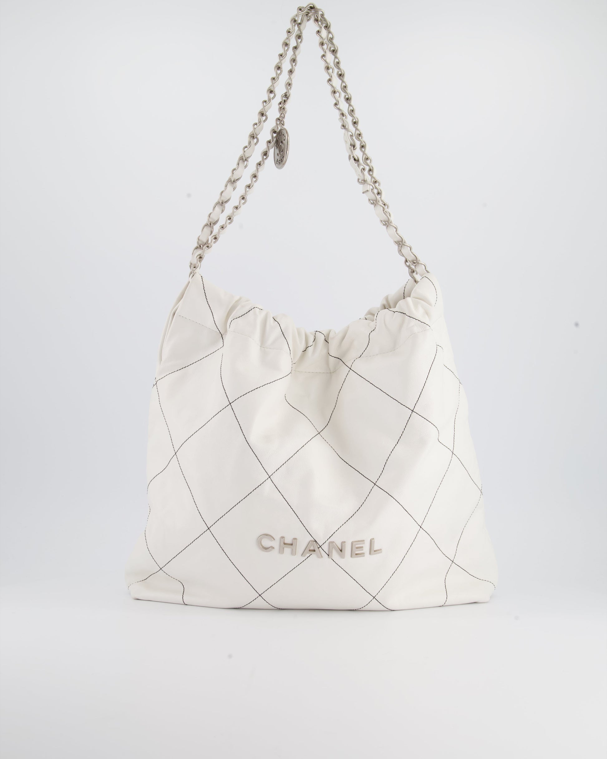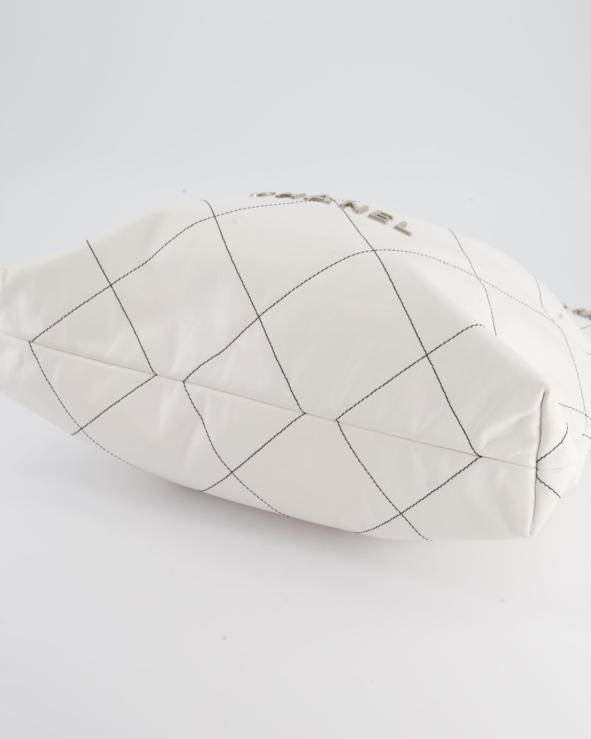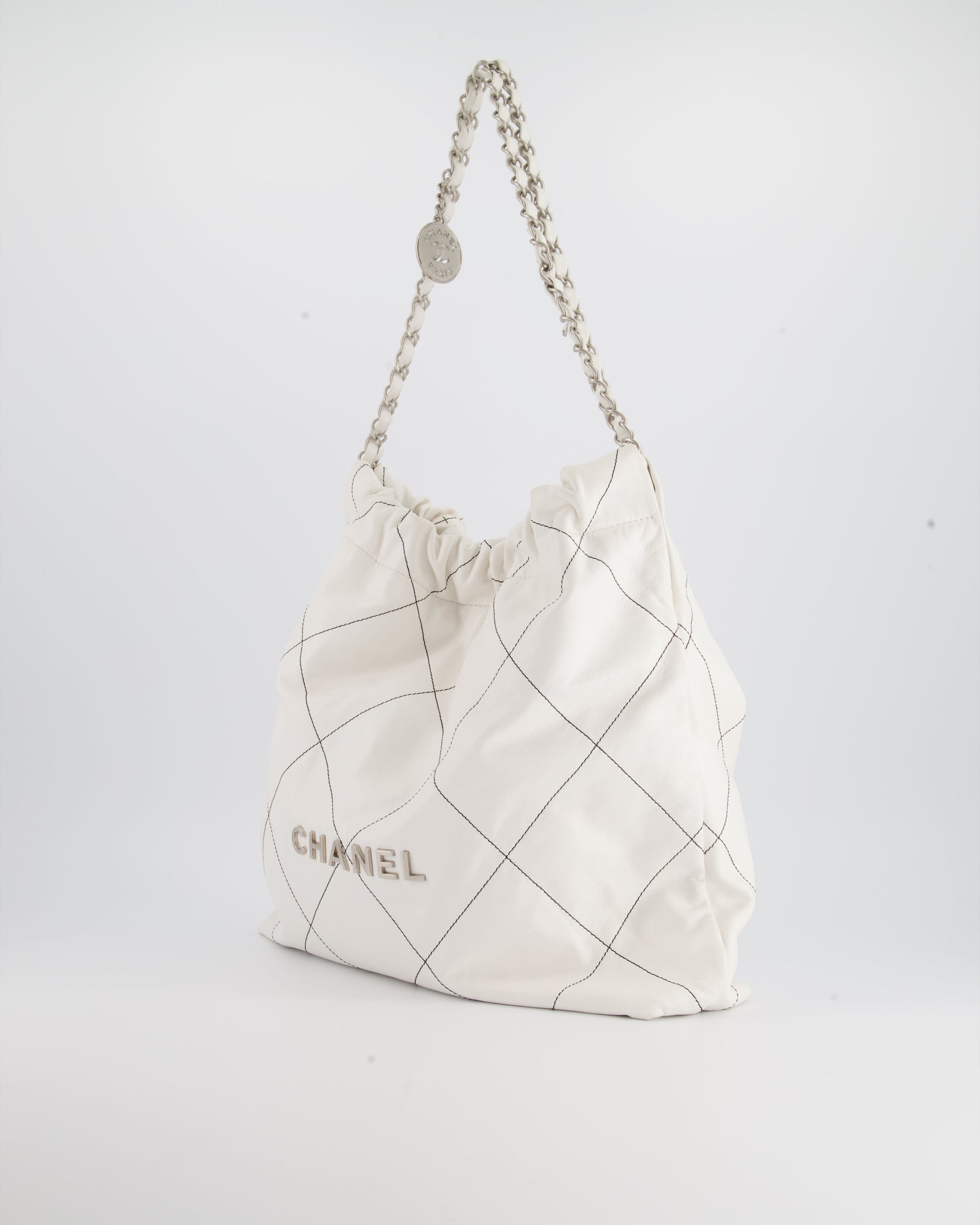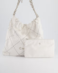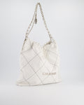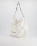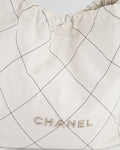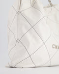 Chanel 22 Bag in White Aged Calfskin with Silver Hardware and Contrast Stitch Detail