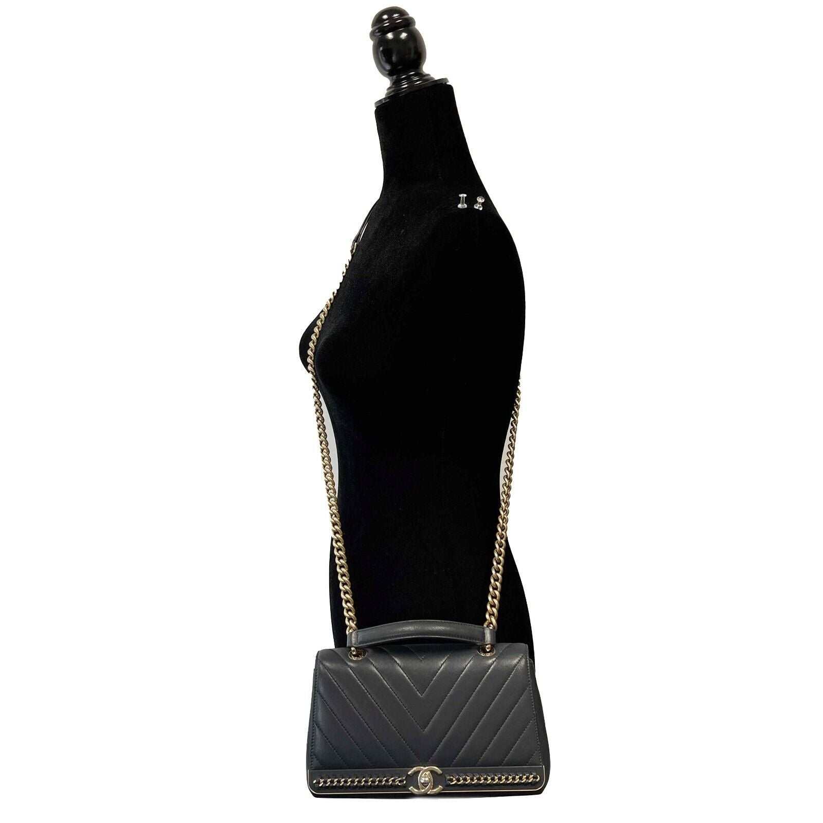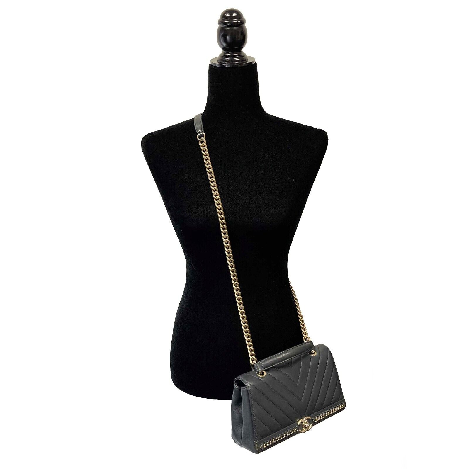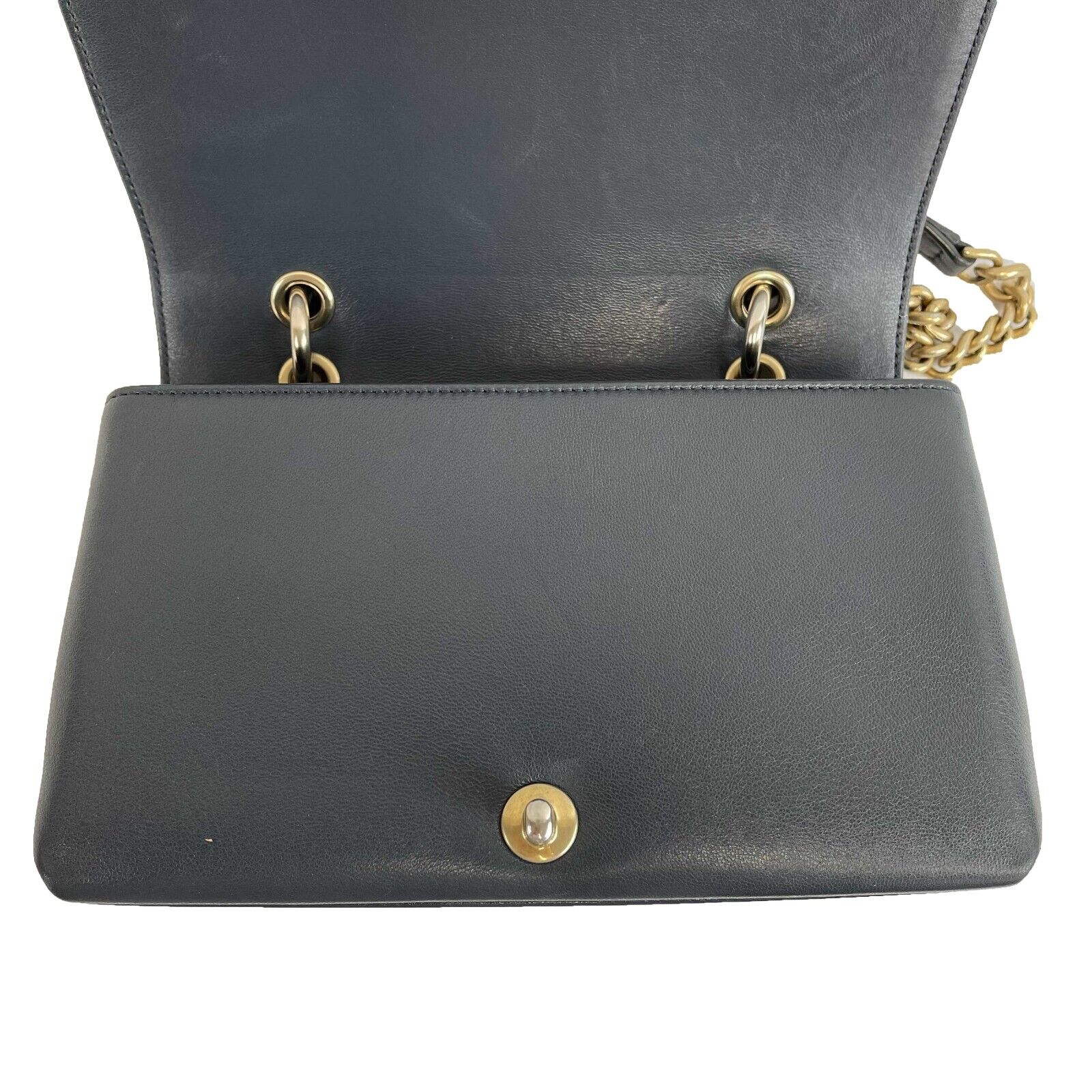 * Leather and aged gold chain detail on front