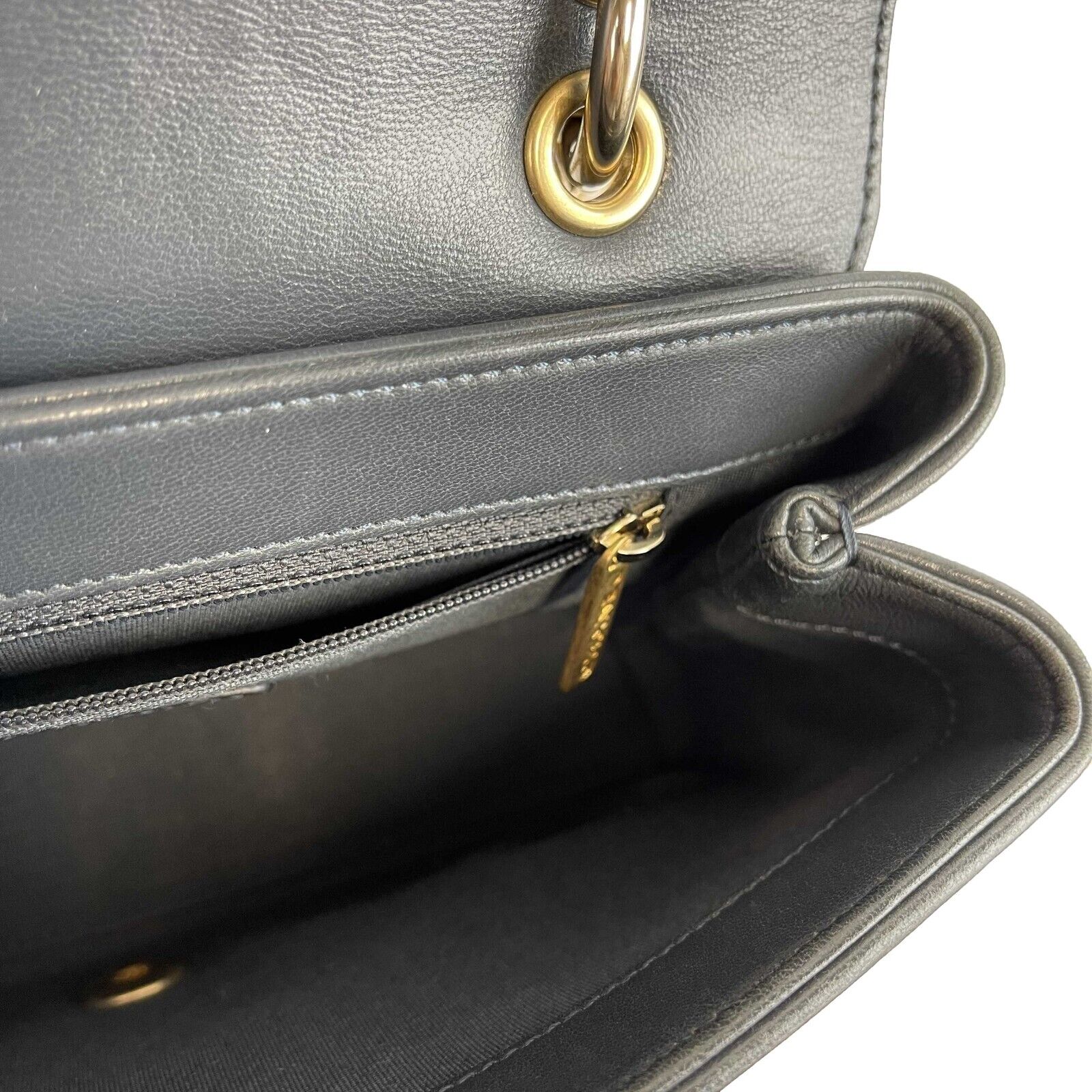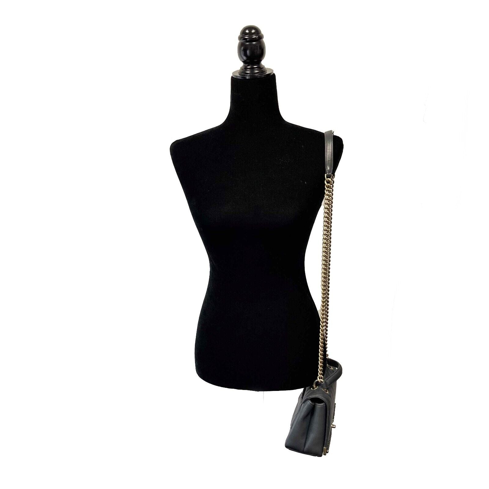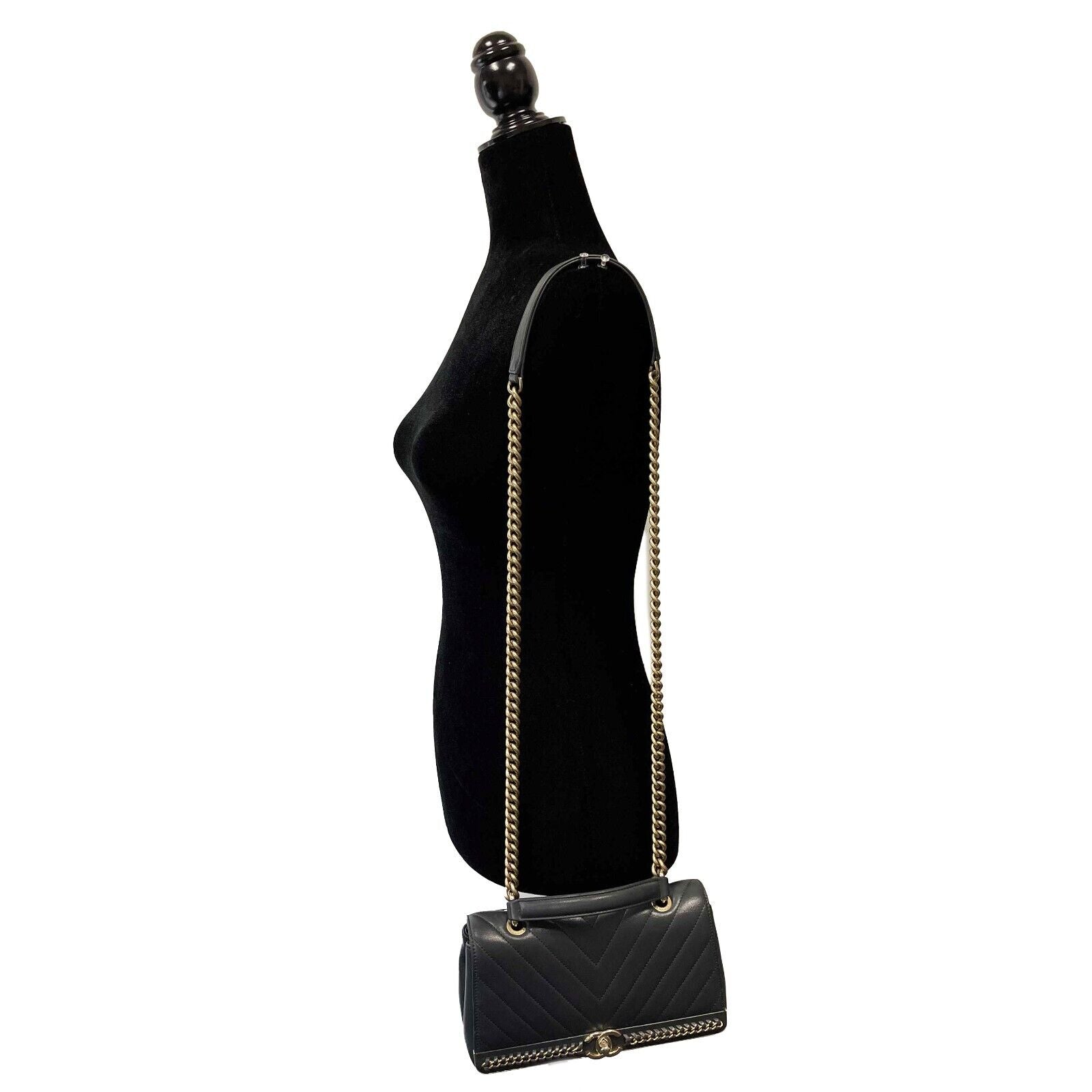 * Leather and aged gold chain detail on front