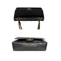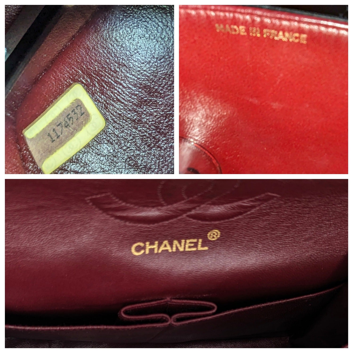 This classic shoulder bag is crafted of diamond quilted lambskin leather in black. The bag features a gold chain-link shoulder strap threaded with leather and gold plated Chanel CC turn-lock for the facing flap. This opens to reveal an inner flap and a burgundy leather interior with pockets. Retail $9,600.