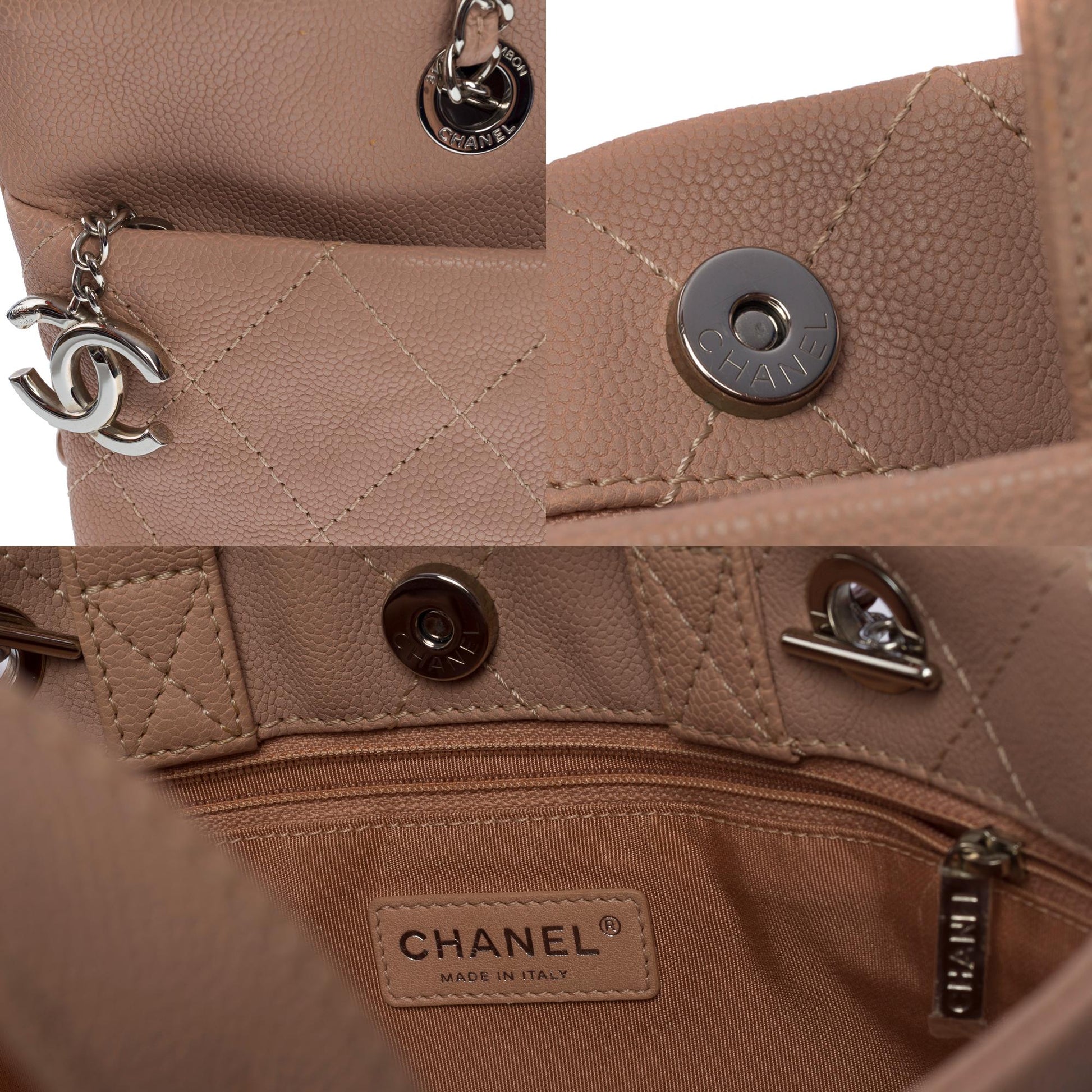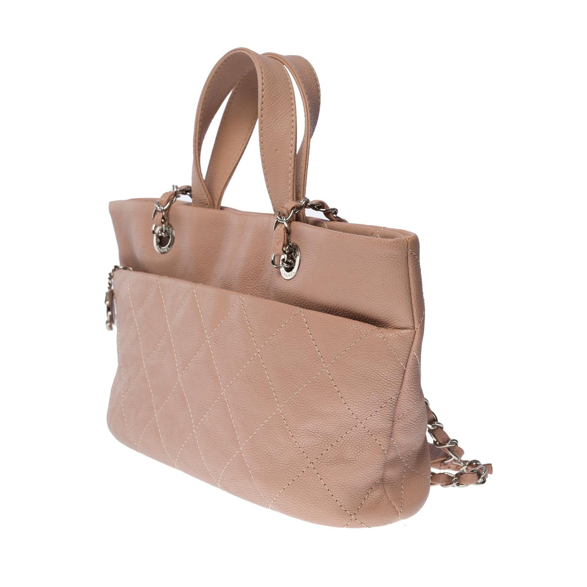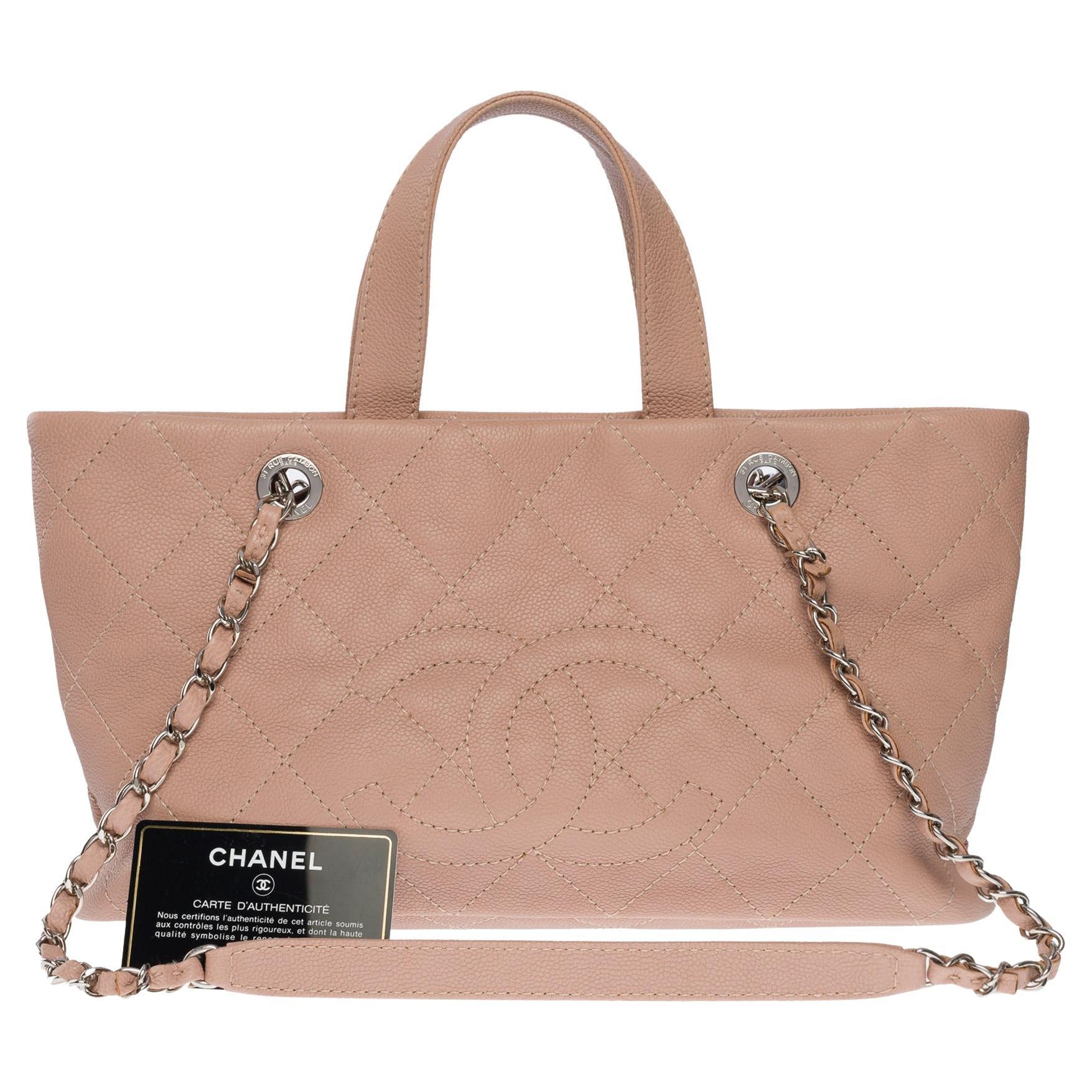Gorgeous Chanel Mini shopping Tote bag in pink caviar leather, silver metal hardware, double pink leather handles and a silver metal chain handle interwoven with pink leather for a hand and shoulder support Closure by silver magnet A zippered pocket on the back of the bag Inner lining in pink fabric, large central zippered pocket, 1 patch pocket, 1 phone slot Key Attachment Link Signature: "ChanelMade in Italy" Date: 2014/2015 Dimensions: 31 x 18 x 9 cm (12.2 x 7.1 x 3.5 Inches) Handle length: 12 cm (4.7 Inches) Chain loop length: 35 cm (13.8 Inches) Reference: 100938 Packaging: Hologram: Yes enticity card: Yes Dustbag: Yes Box: Yes General condition: 7.5/10 In amazing condition despite minor marks of use on the leather and hardware Option in addition: Certificate of enticity issued by a judicial expert at the Appeal Court of Paris