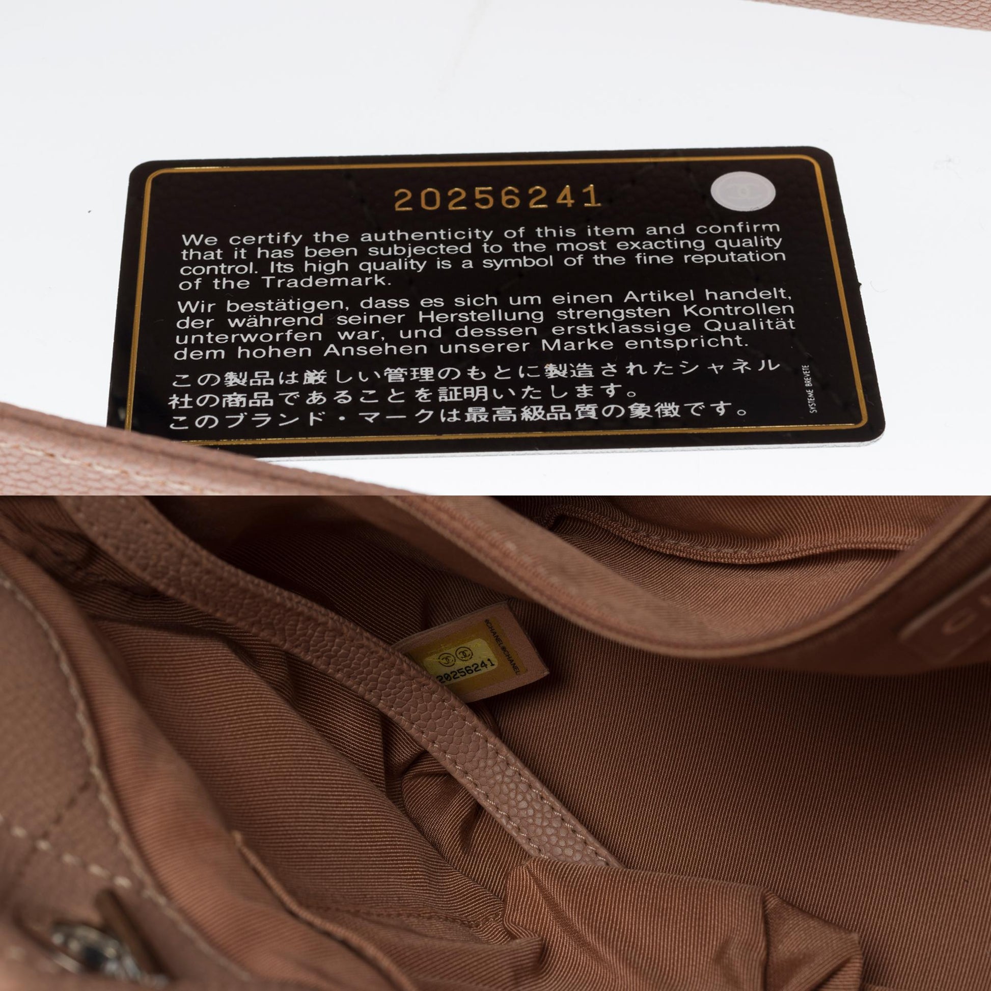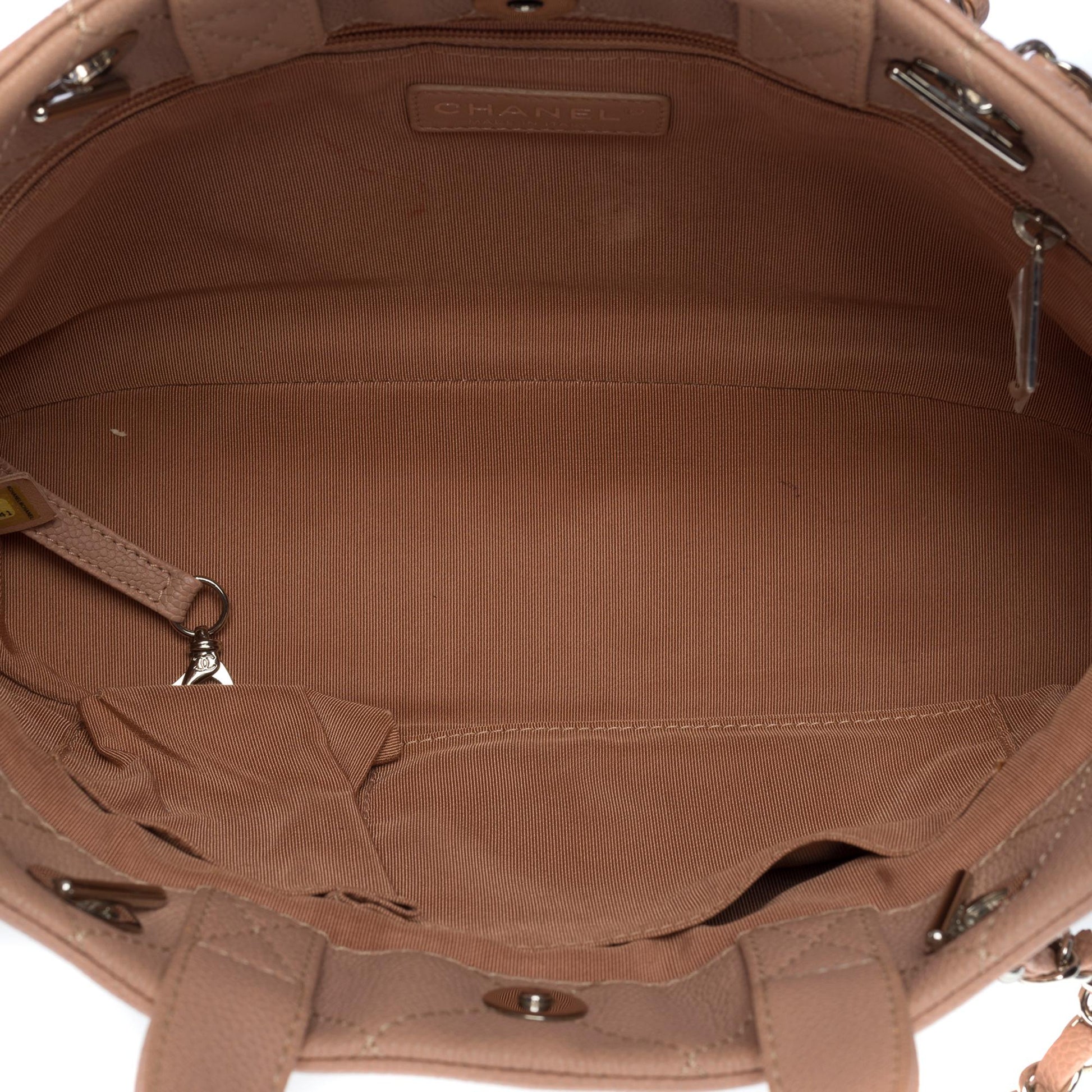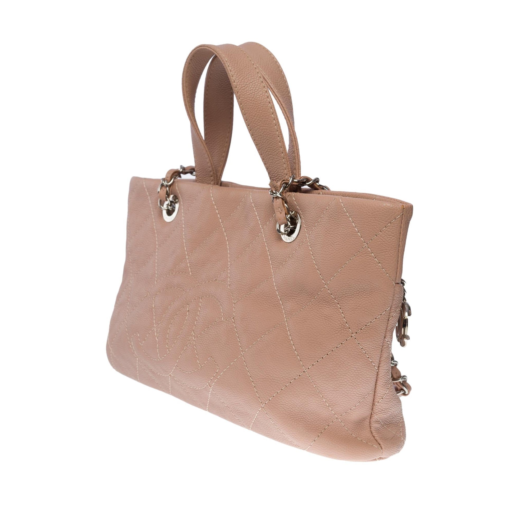 Gorgeous Chanel Mini shopping Tote bag in pink caviar leather, silver metal hardware, double pink leather handles and a silver metal chain handle interwoven with pink leather for a hand and shoulder support Closure by silver magnet A zippered pocket on the back of the bag Inner lining in pink fabric, large central zippered pocket, 1 patch pocket, 1 phone slot Key Attachment Link Signature: "ChanelMade in Italy" Date: 2014/2015 Dimensions: 31 x 18 x 9 cm (12.2 x 7.1 x 3.5 Inches) Handle length: 12 cm (4.7 Inches) Chain loop length: 35 cm (13.8 Inches) Reference: 100938 Packaging: Hologram: Yes enticity card: Yes Dustbag: Yes Box: Yes General condition: 7.5/10 In amazing condition despite minor marks of use on the leather and hardware Option in addition: Certificate of enticity issued by a judicial expert at the Appeal Court of Paris