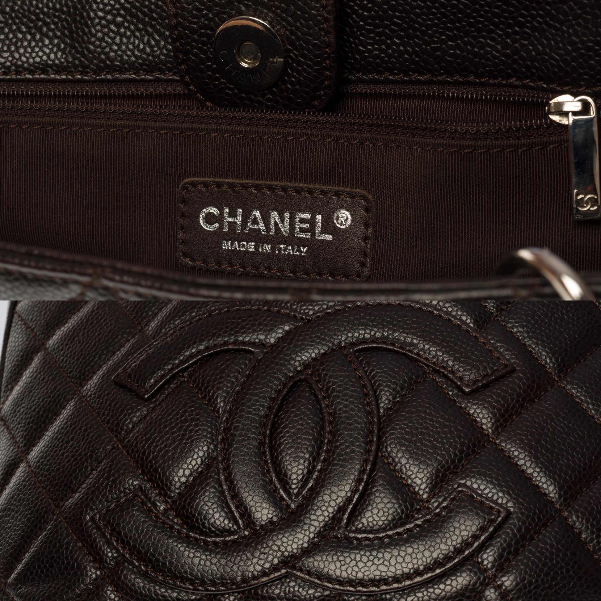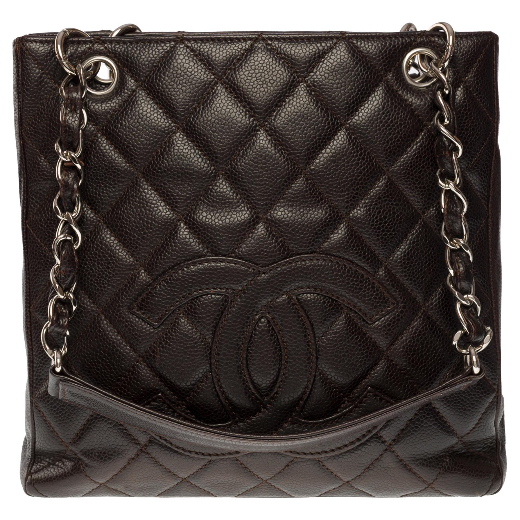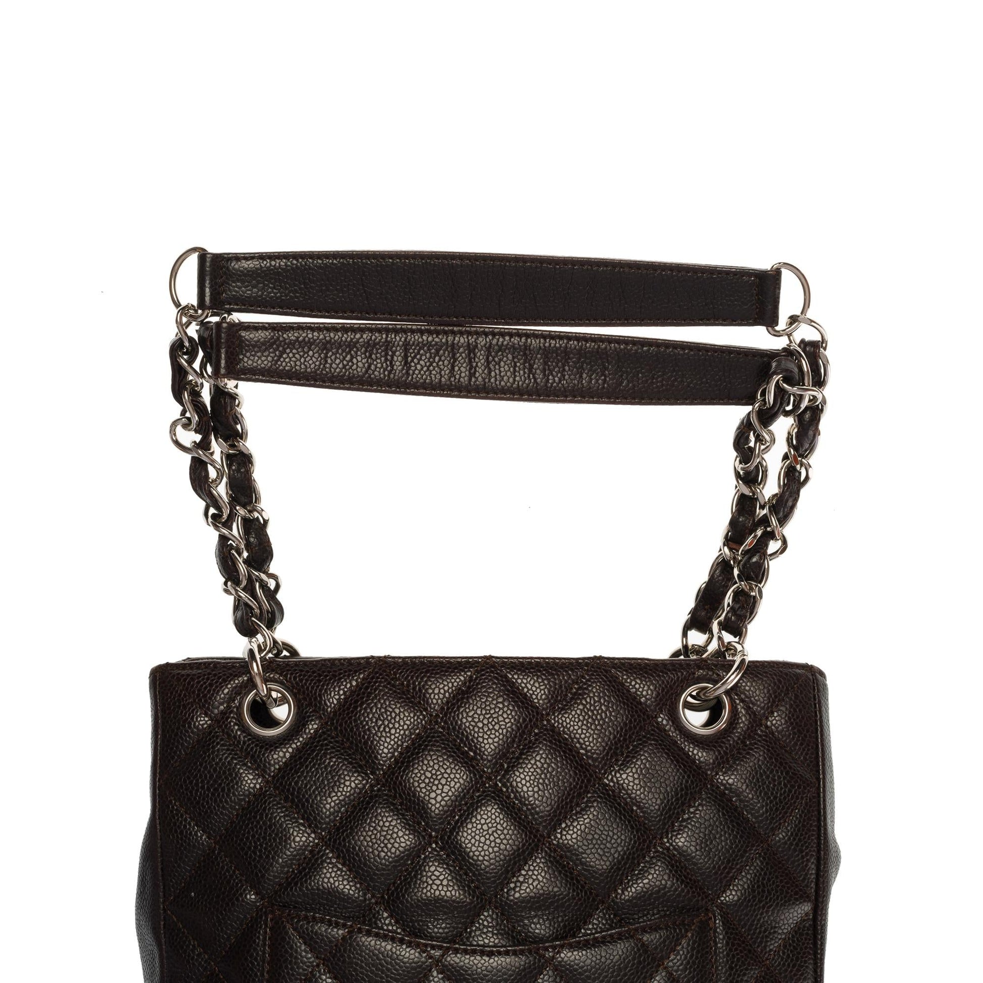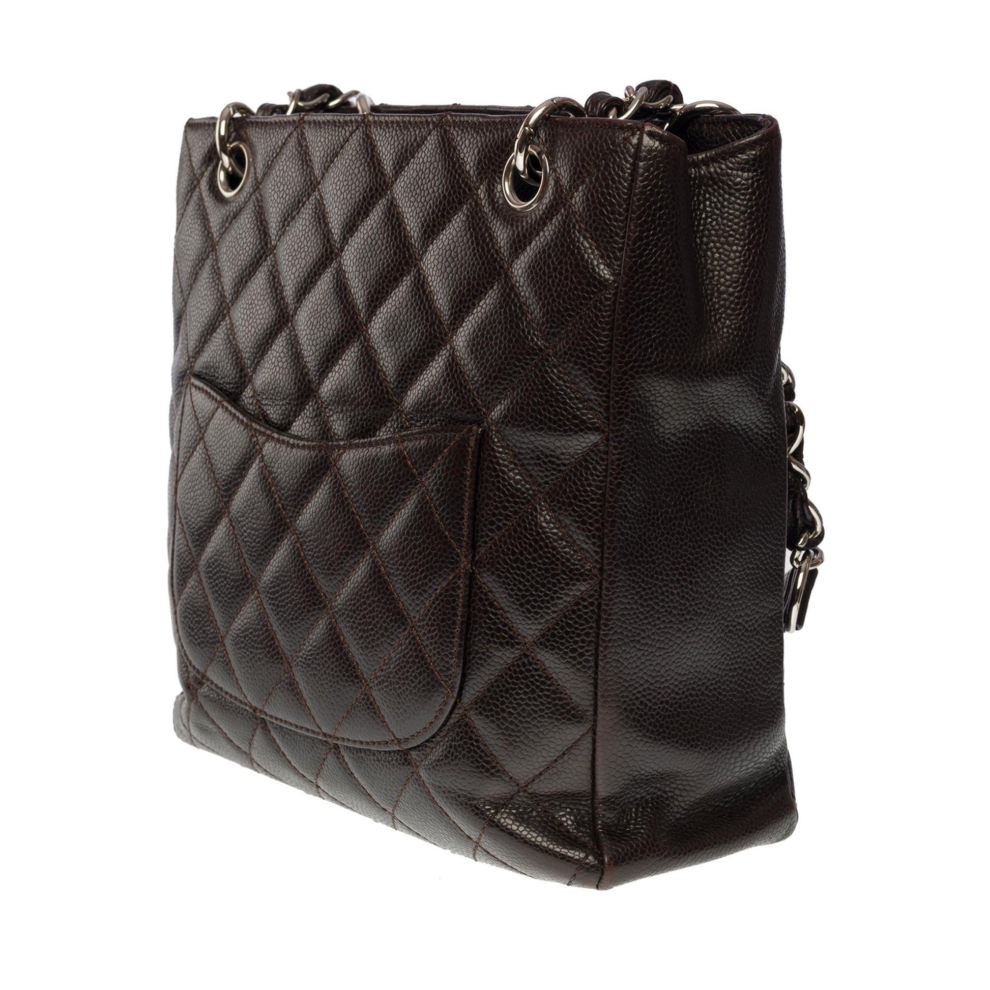 Gorgeous Chanel Shopping PST (Petit Shopping Tote) bag in brown caviar leather, silver metal hardware, double silver metal handle interwoven with brown leather for a hand and shoulder support Backpack pocket Snap closure on top Inner lining in brown canvas, one zip pocket, one patch pocket Signature: "Chanel, Made in Italy" Date: 2006/2008 Dimensions: 25 x 23 x 8 cm (9.8 x 9 x 3.1 Inches) Handle length: 23 cm (9 Inches) Reference: 100891 Packaging: Hologram: Yes enticity card: Yes Dustbag: No Box: No General condition: 7/10 In very good general condition despite light marks of use on the leather and hardware Option in addition: Certificate of enticity issued by a judicial expert at the Appeal Court of Paris
