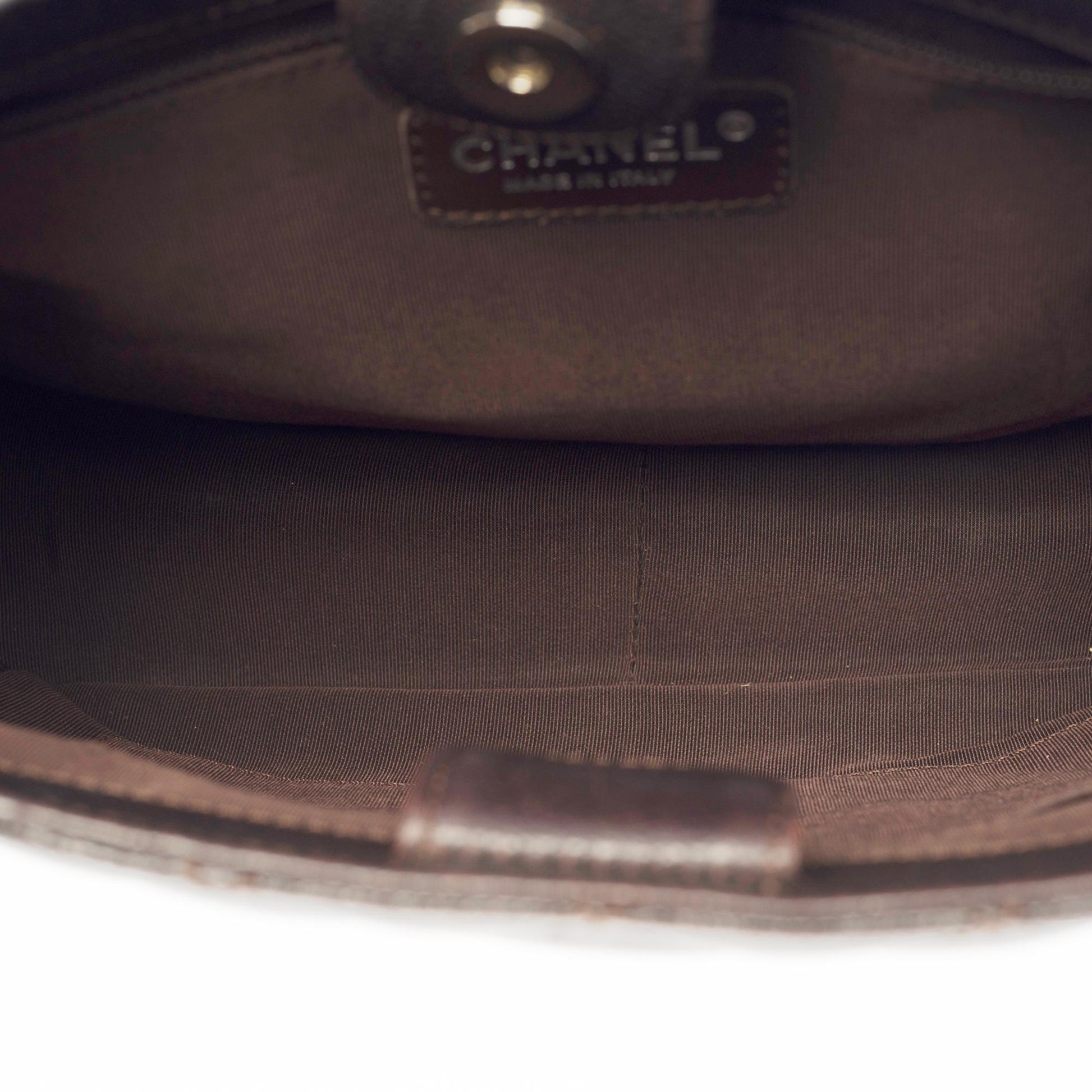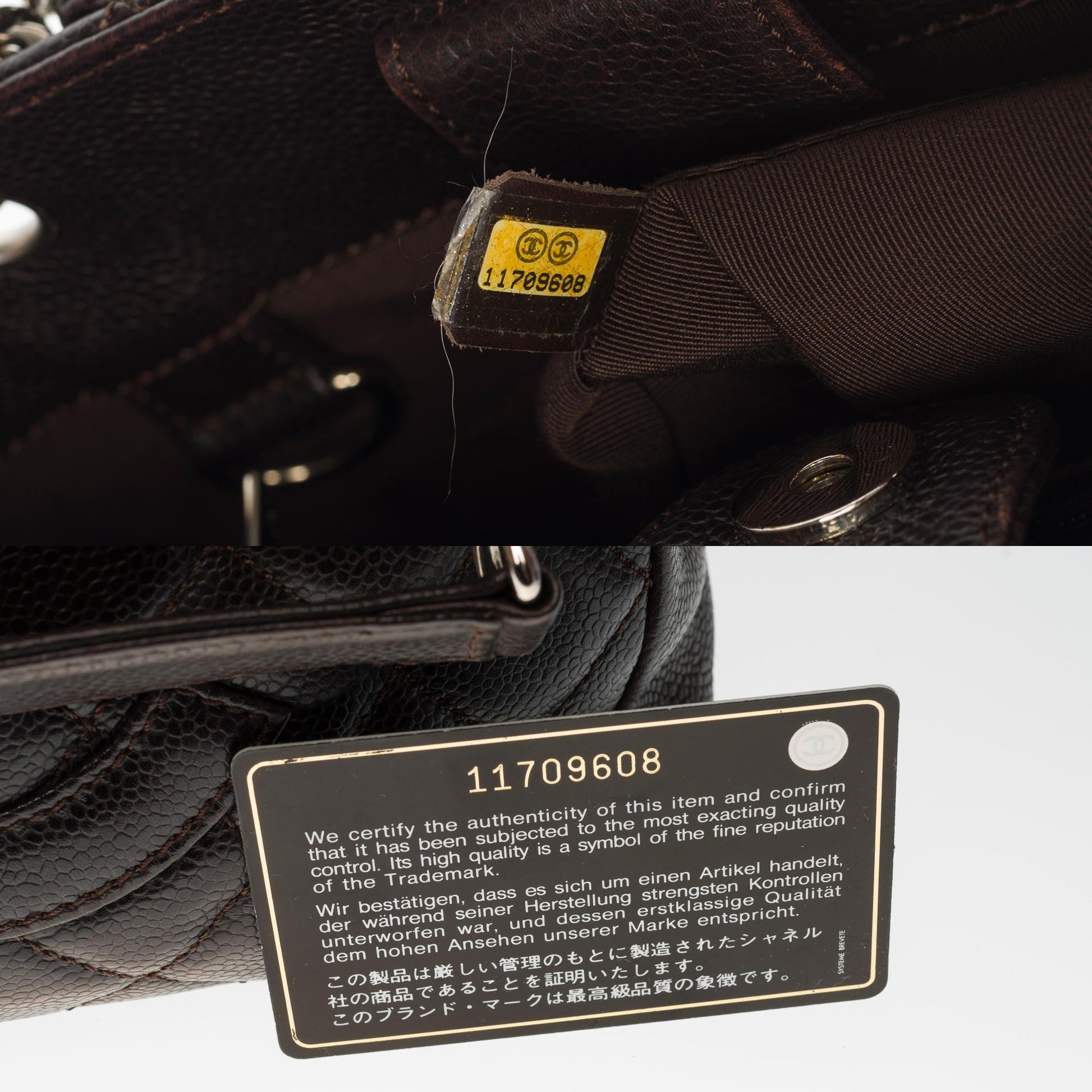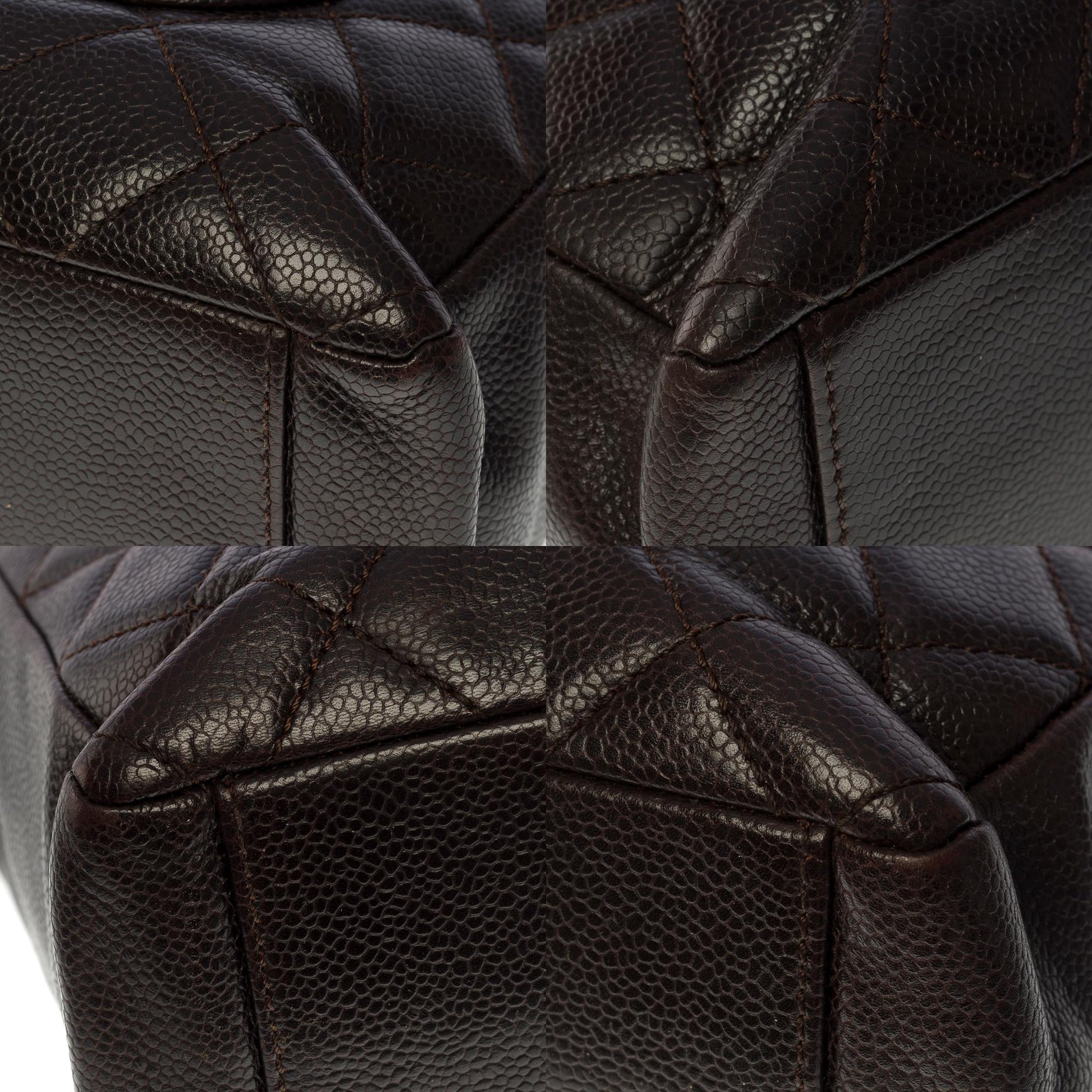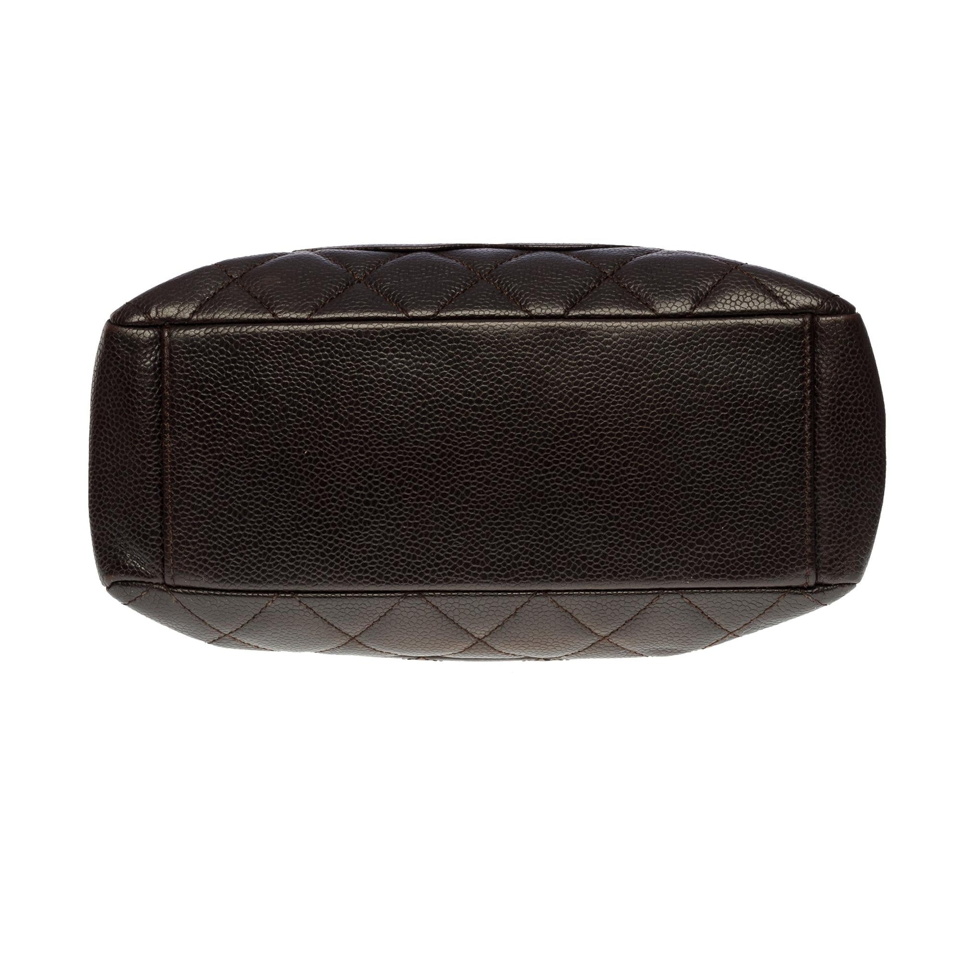 Gorgeous Chanel Shopping PST (Petit Shopping Tote) bag in brown caviar leather, silver metal hardware, double silver metal handle interwoven with brown leather for a hand and shoulder support Backpack pocket Snap closure on top Inner lining in brown canvas, one zip pocket, one patch pocket Signature: "Chanel, Made in Italy" Date: 2006/2008 Dimensions: 25 x 23 x 8 cm (9.8 x 9 x 3.1 Inches) Handle length: 23 cm (9 Inches) Reference: 100891 Packaging: Hologram: Yes enticity card: Yes Dustbag: No Box: No General condition: 7/10 In very good general condition despite light marks of use on the leather and hardware Option in addition: Certificate of enticity issued by a judicial expert at the Appeal Court of Paris