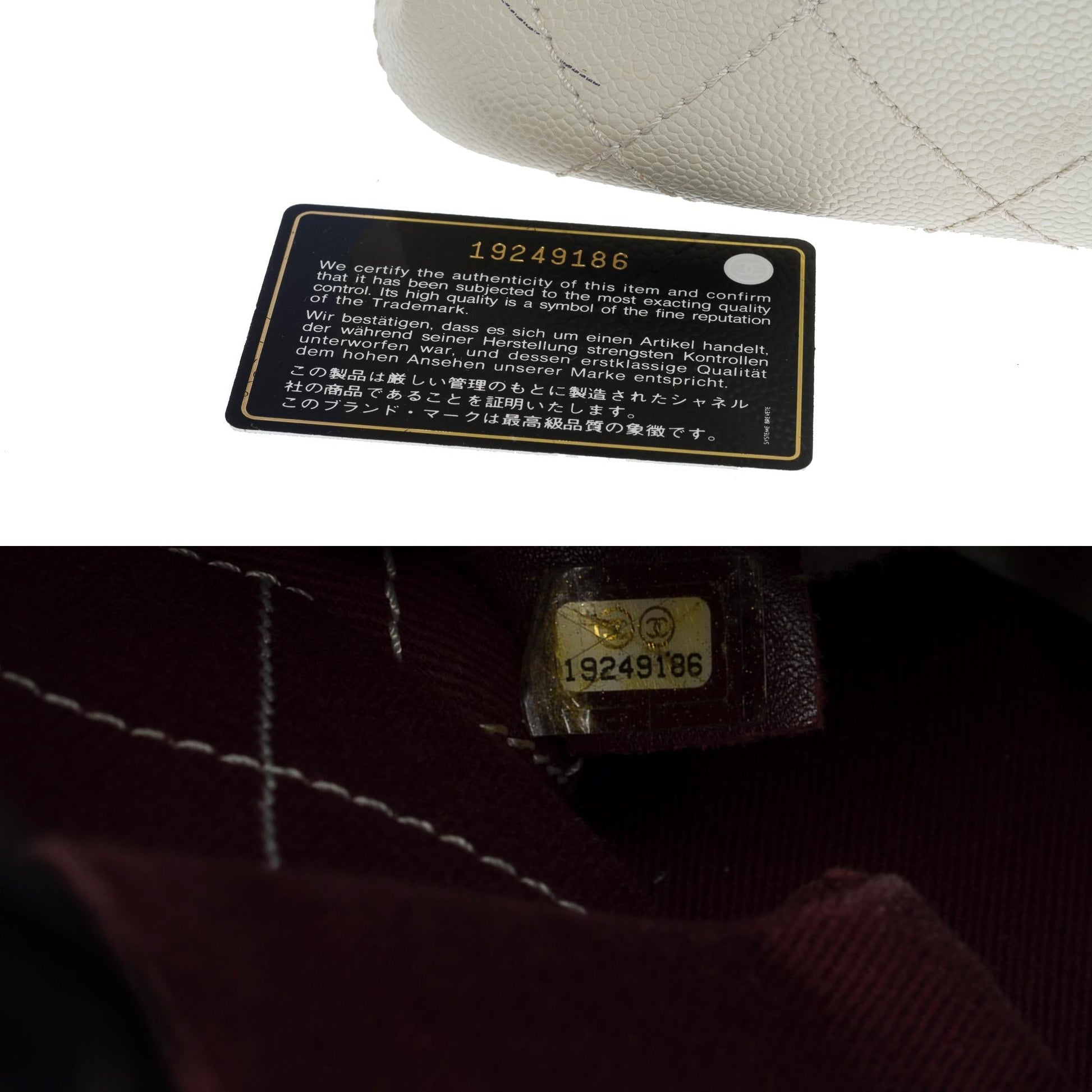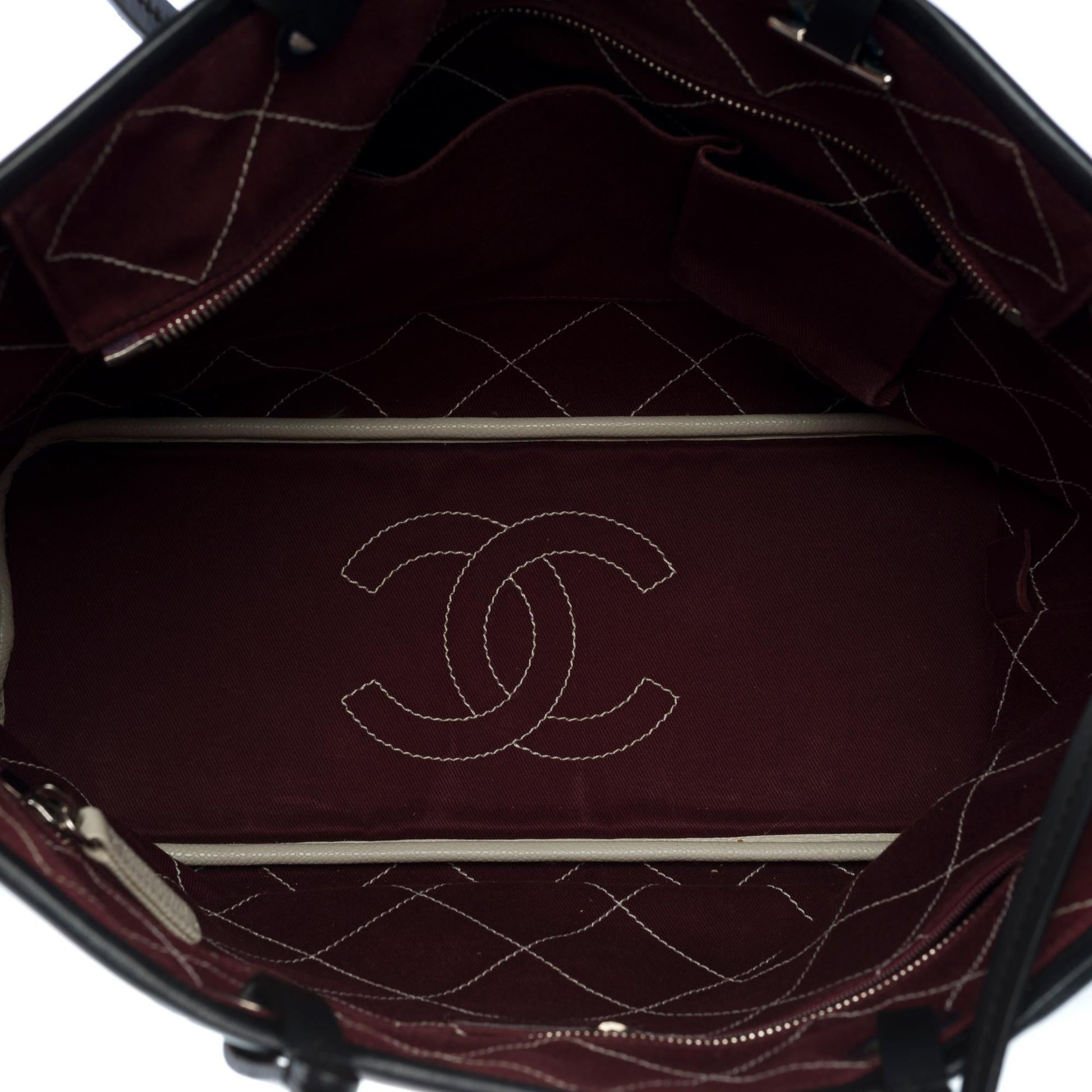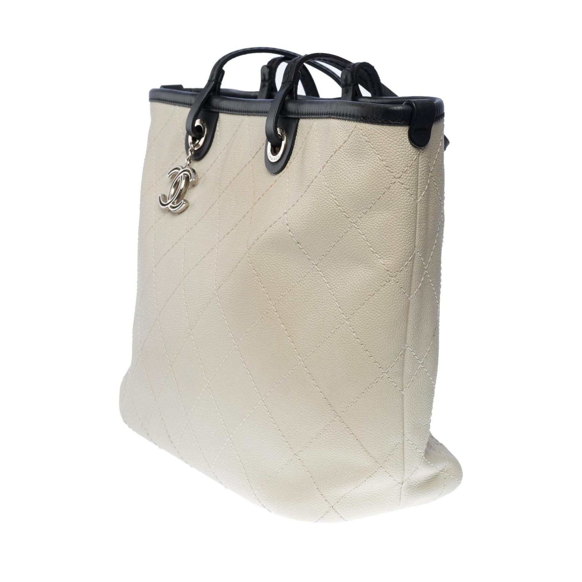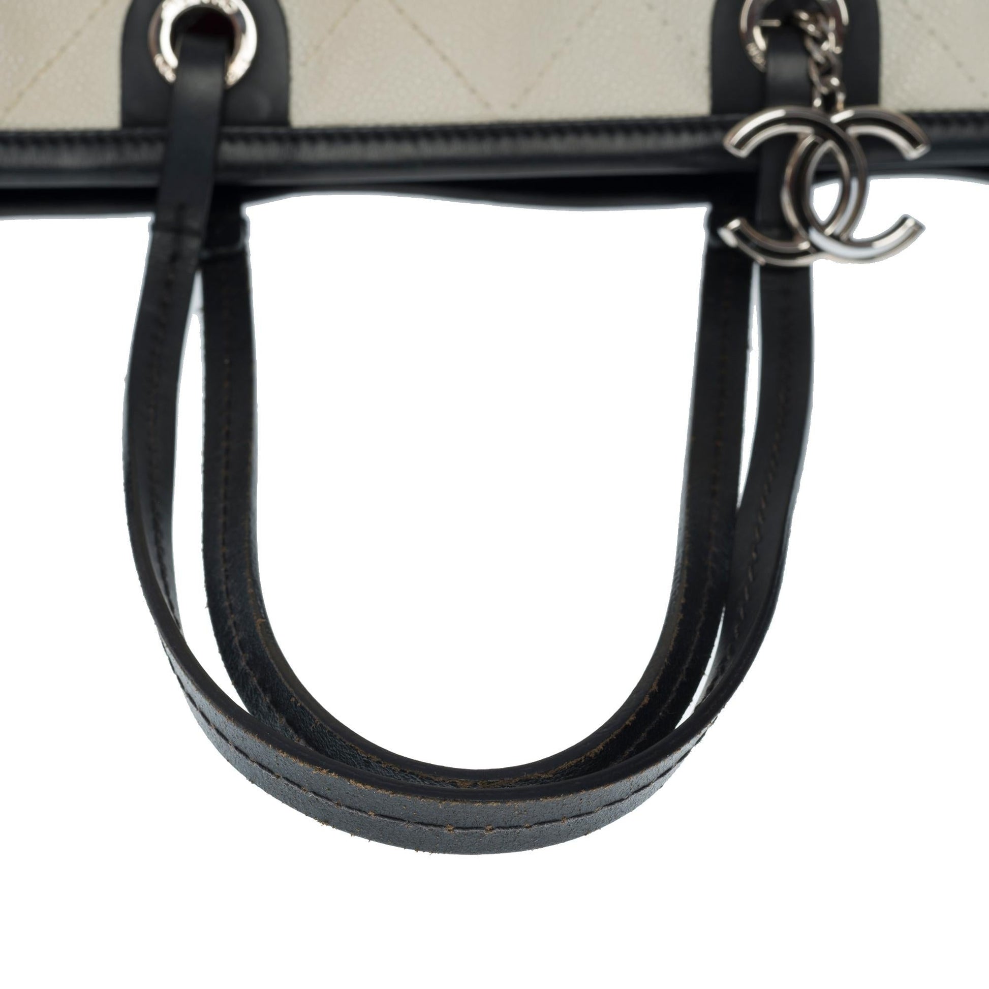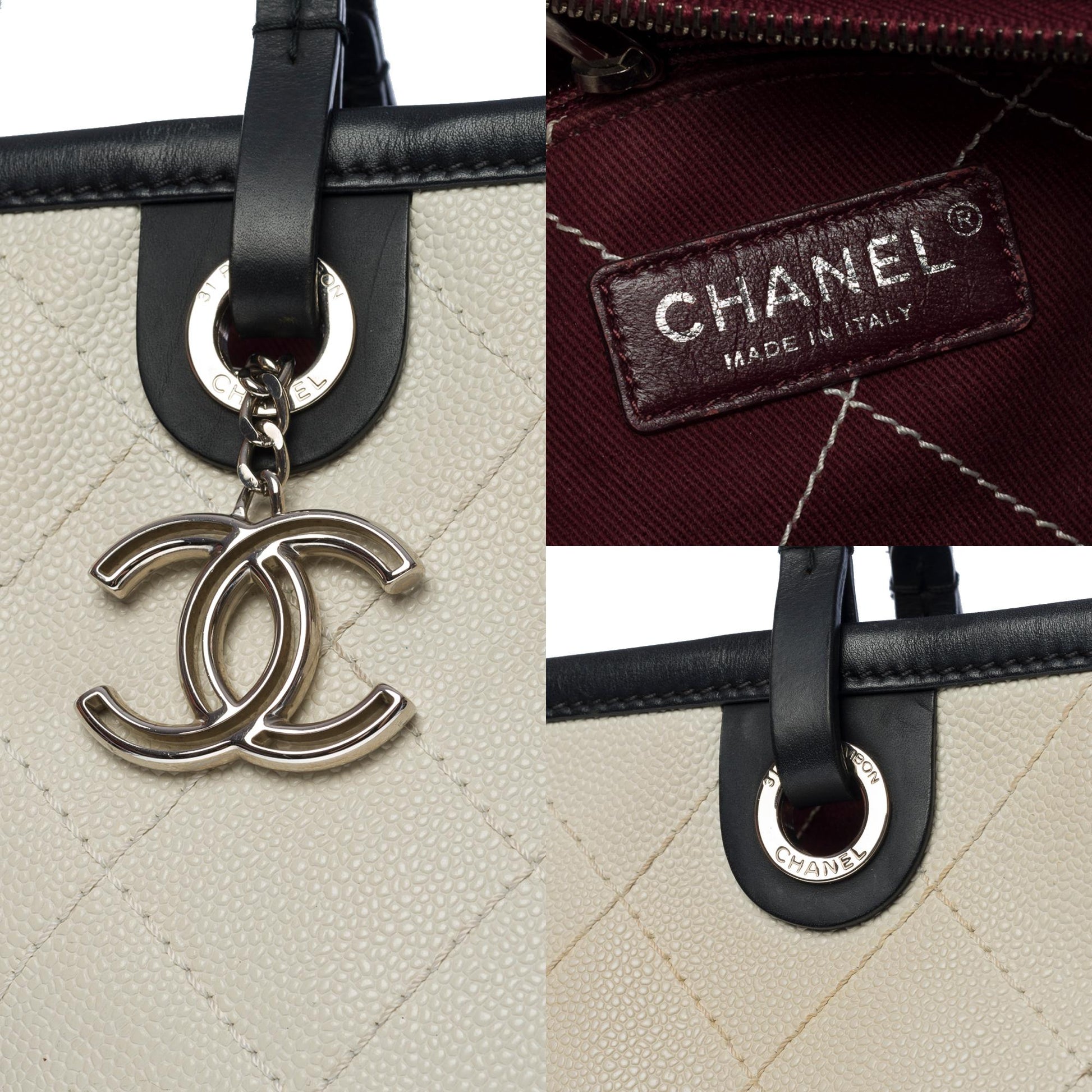 Beautiful Chanel Shopping Tote in white caviar leather with black leather , silver metal hardware, a double handle in black leather allowing a hand or shoulder support Inner lining in burgundy canvas, 1 zippered pocket, 1 patch pocket, 1 phone slot, 1 CC silver metal charm Signature: "ChanelMade in Italy" Date: 2014 Dimensions: 33 x 30 x 13 cm (13 x 11.8 x 5.1 Inches) Double handle length: 25 cm (9.8 Inches) Reference: 100937 Packaging: Hologram: Yes enticity card: Yes Dustbag: No Box: No General condition: 7/10 In excellent condition despite wear marks on leather (light patina, dirt, wrinkle) and hardware Option in addition: Certificate of enticity issued by a judicial expert at the Appeal Court of Paris