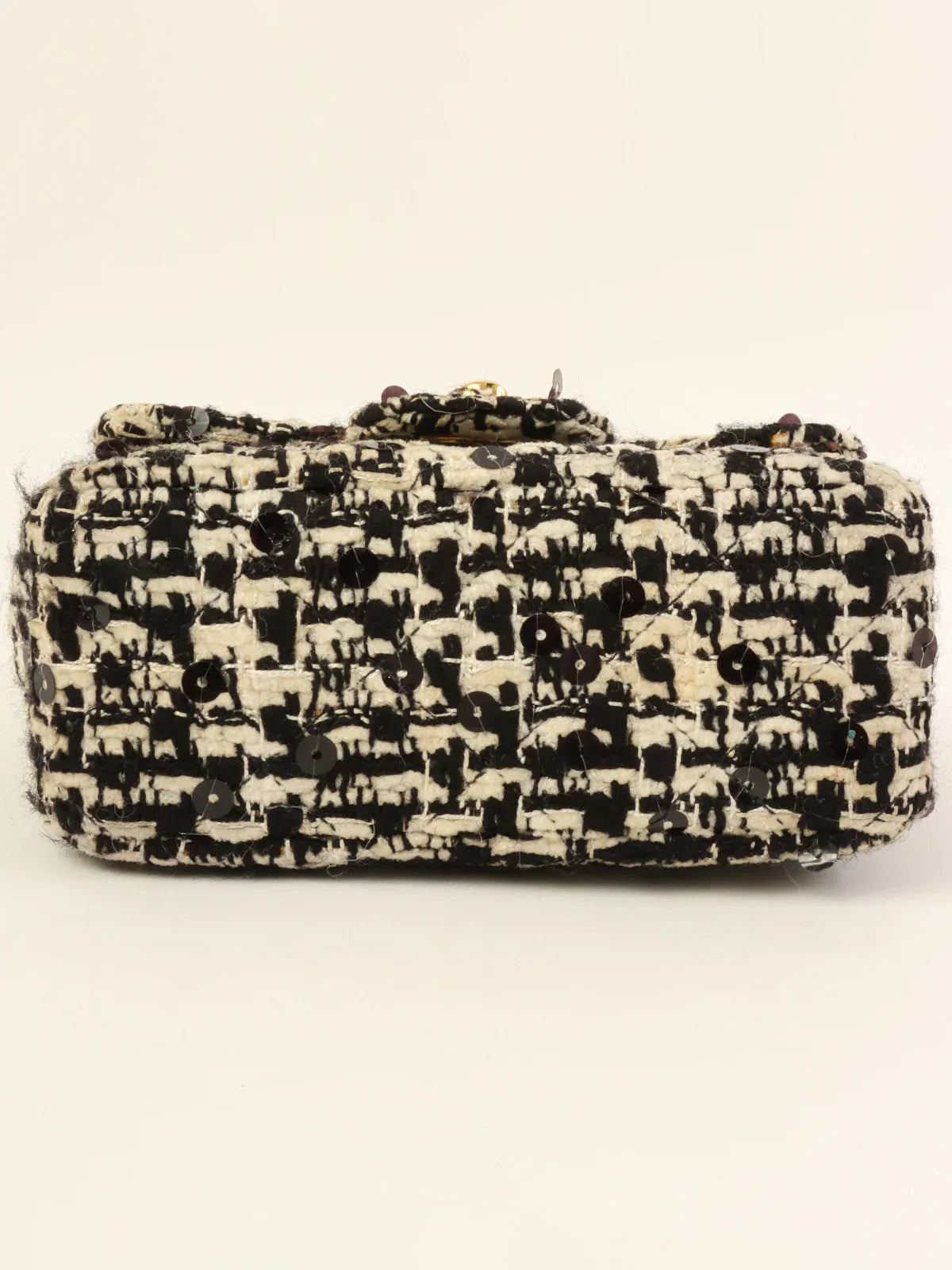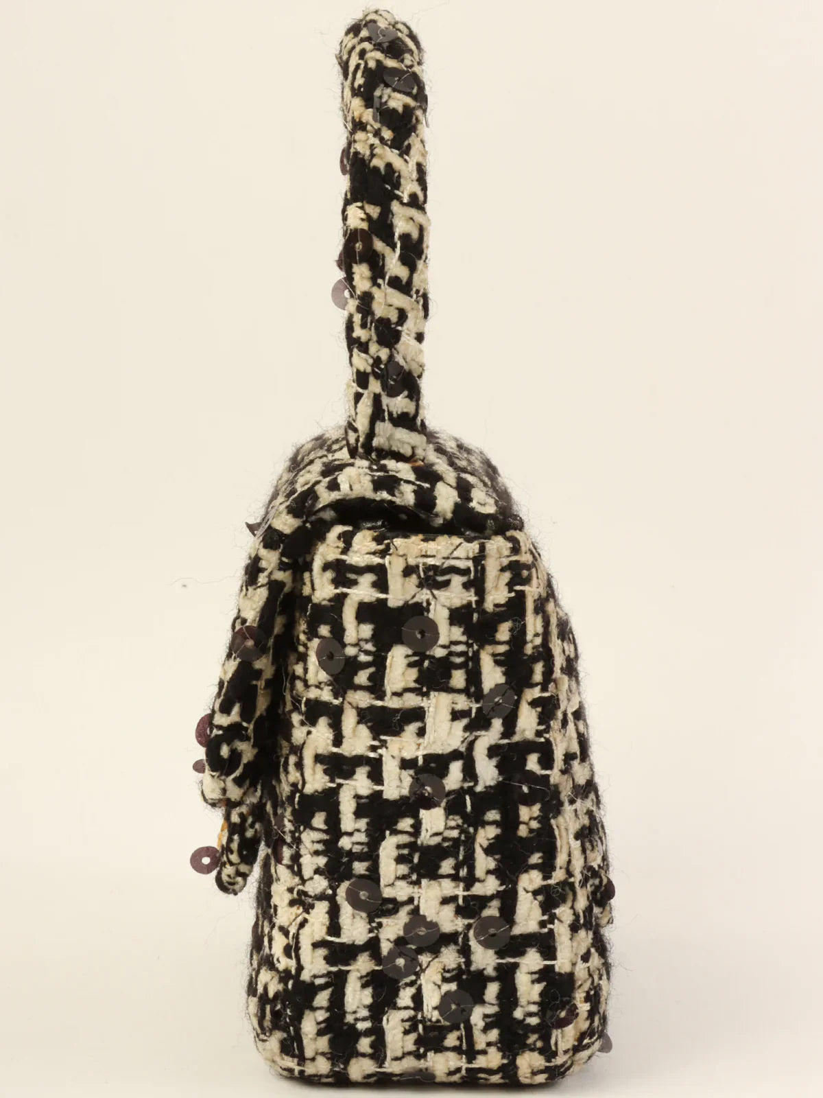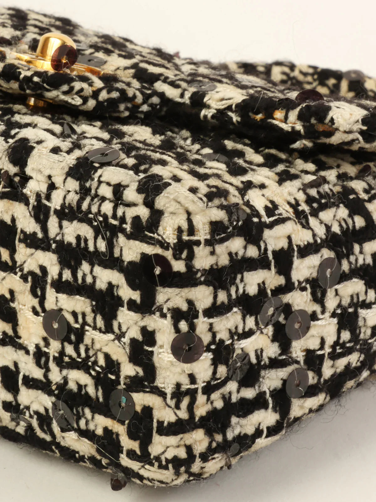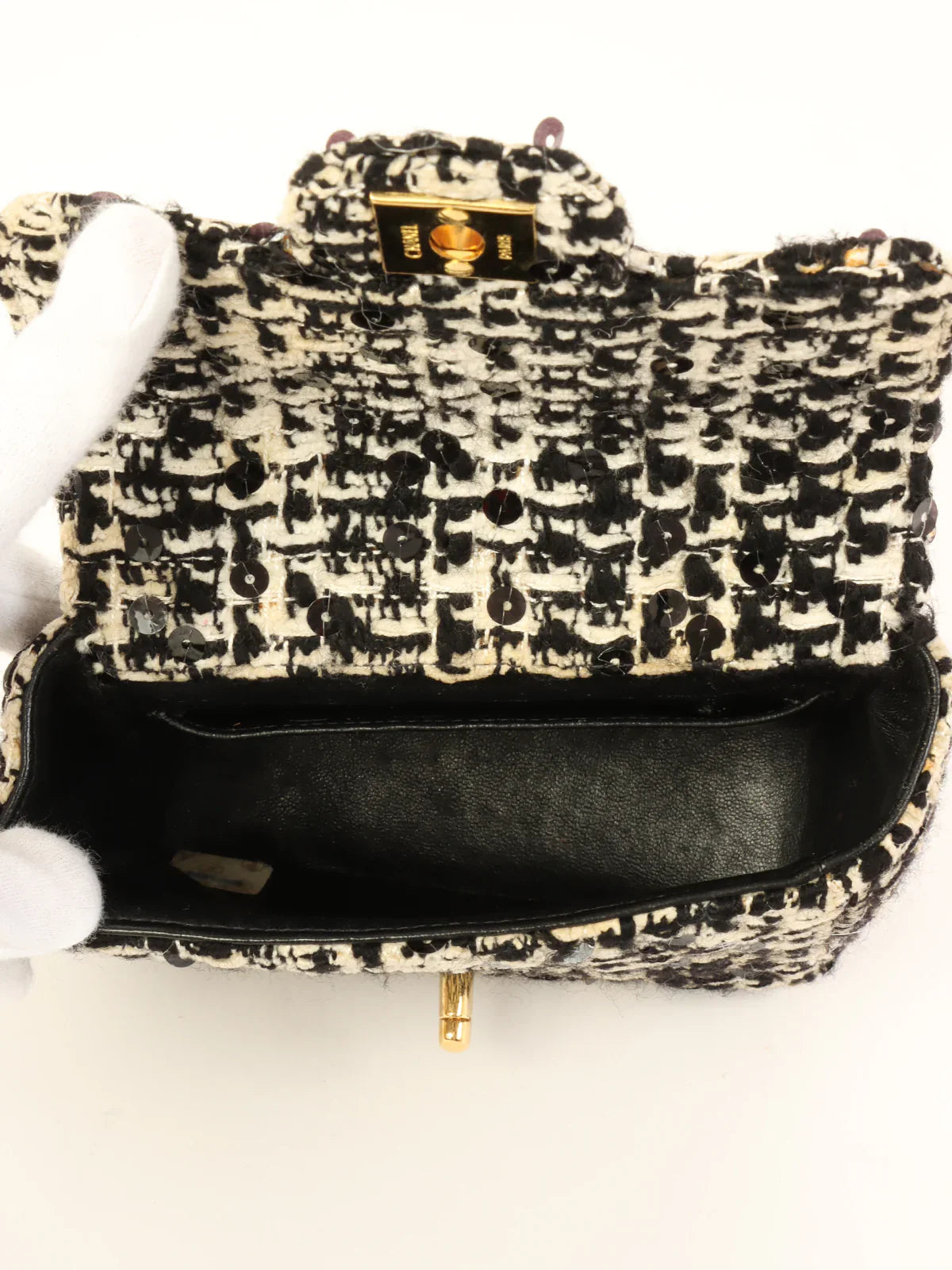 CHANEL Around 1992 Made Tweed Sequin Classic Flap Top Handle Bag Mini Black/White