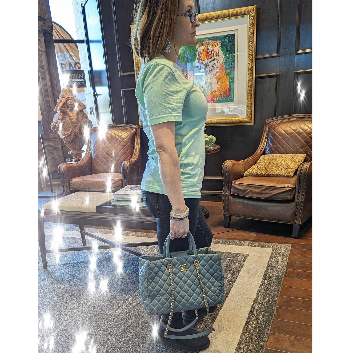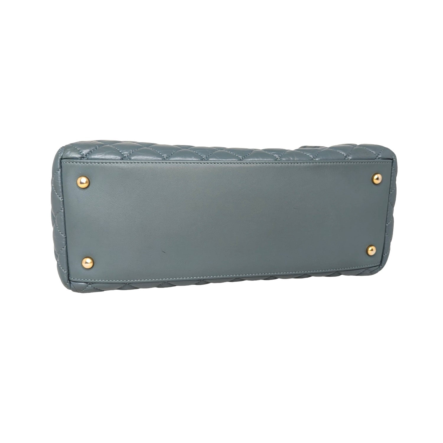 Chanel bag Coco Allure Shopping Bag is crafted of diamond quilted blue aged Calfskin leather with aged gold-tone hardware. It features chain and leather threaded shoulder straps, dual rolled top handles, gold Chanel bag CC logo on the front, an exterior patch pocket. Snap closure at top that opens to a blue interior lining with zipper, patch pockets, and a removable central zipper pouch.