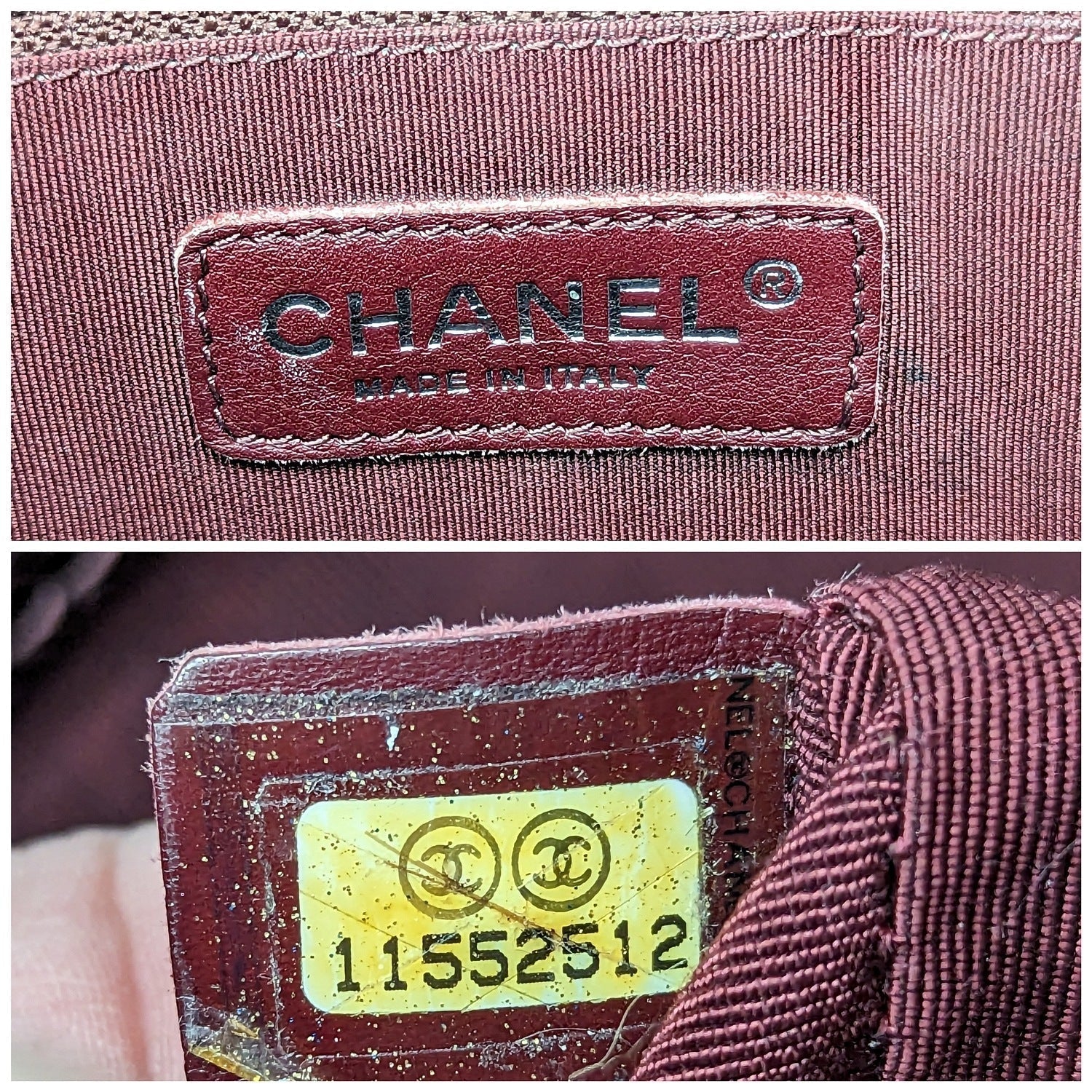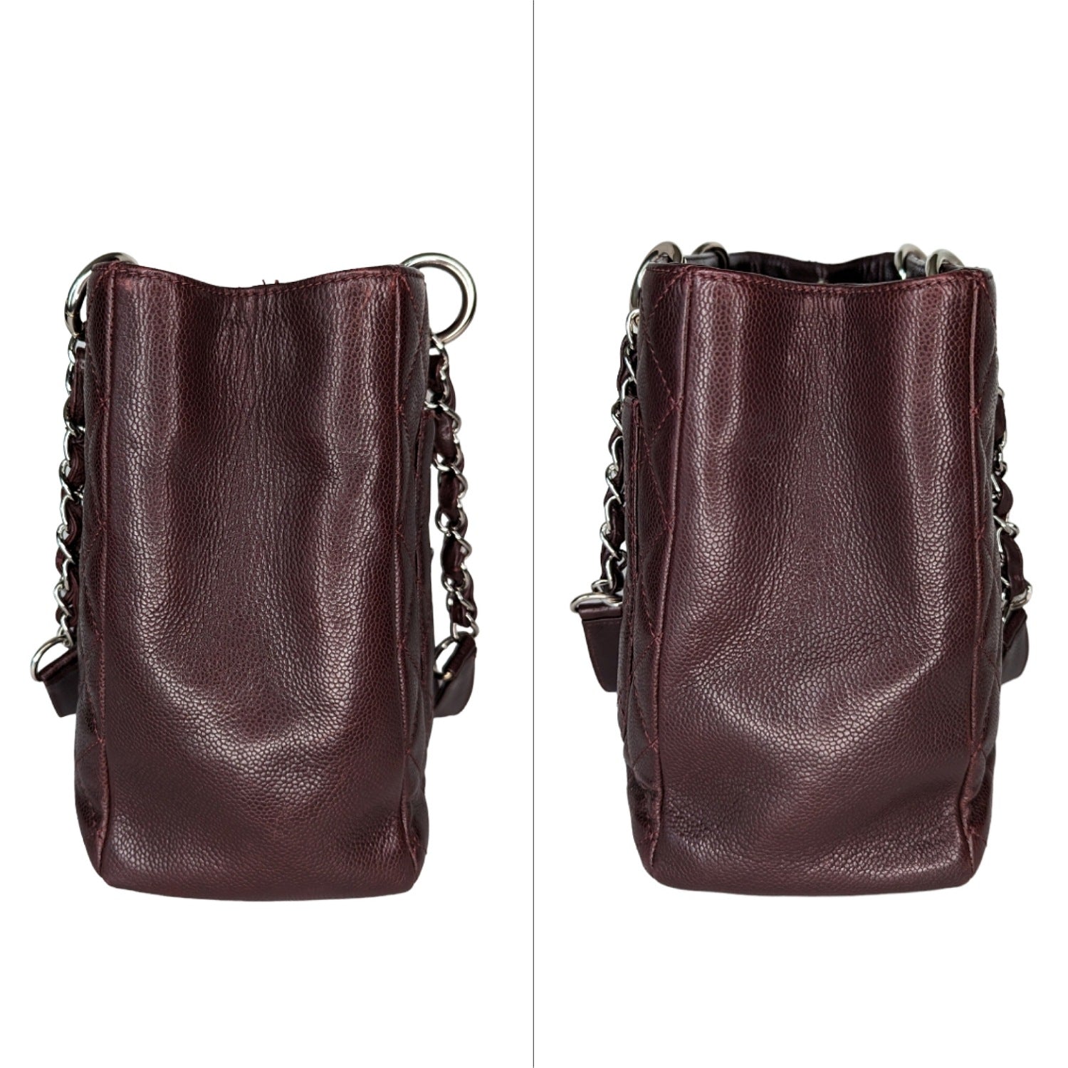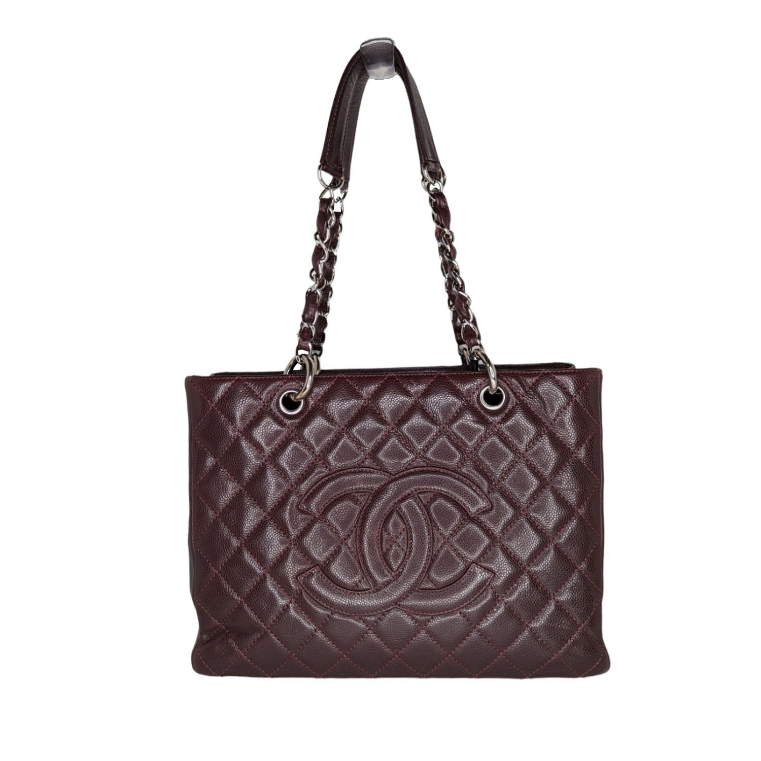 This stylish tote is crafted of diamond-quilted caviar leather in burgundy. This shoulder bag features leather-threaded polished silver chain-link shoulder straps with shoulder pads, a quilted Chanel bag CC logo on the front, and a flat pocket on the rear. The top is open to a partitioned textile fabric interior with patch and zipper pockets.