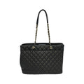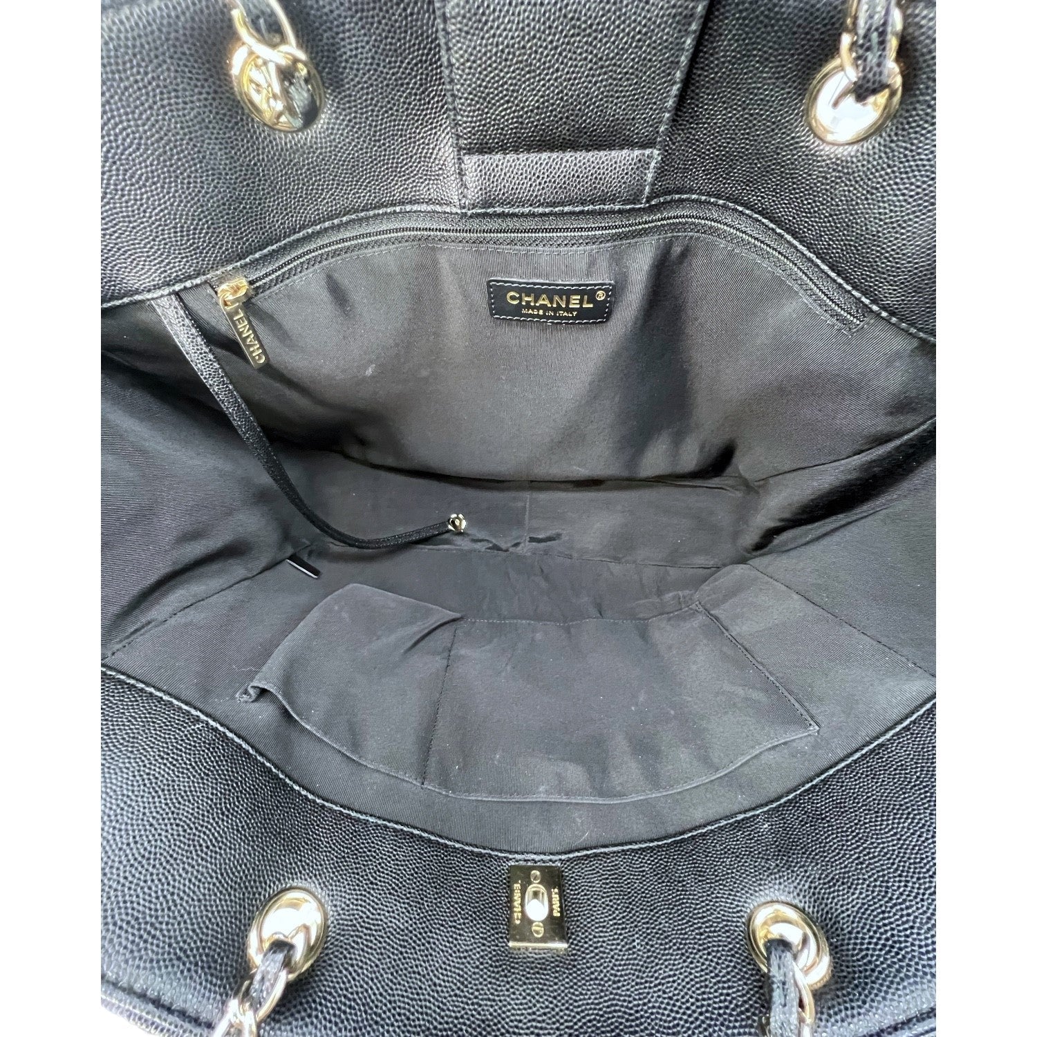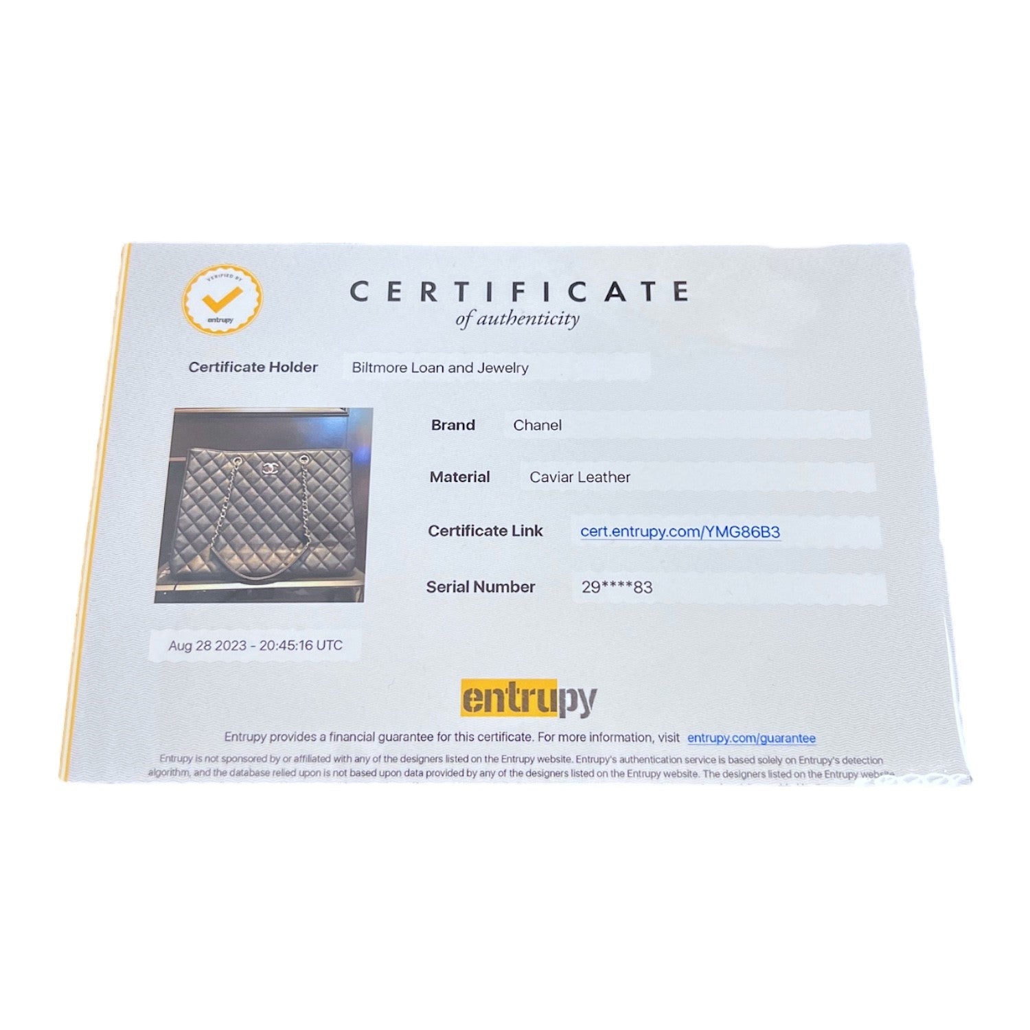 This Chanel bag Classic Timeless Tote was made in Italy and it is finely crafted of a black quilted caviar leather exterior with gold-tone hardware features. It has dual leather and chain-link shoulder straps. It has a slip pocket on the backside with a magnetic closure. It has a locking push through closure and it opens up to a black grosgrain interior with 2 slip pockets and a zipper pocket. This classic, timeless tote is perfect for everyday use and it is also certified by Entrupy!