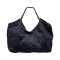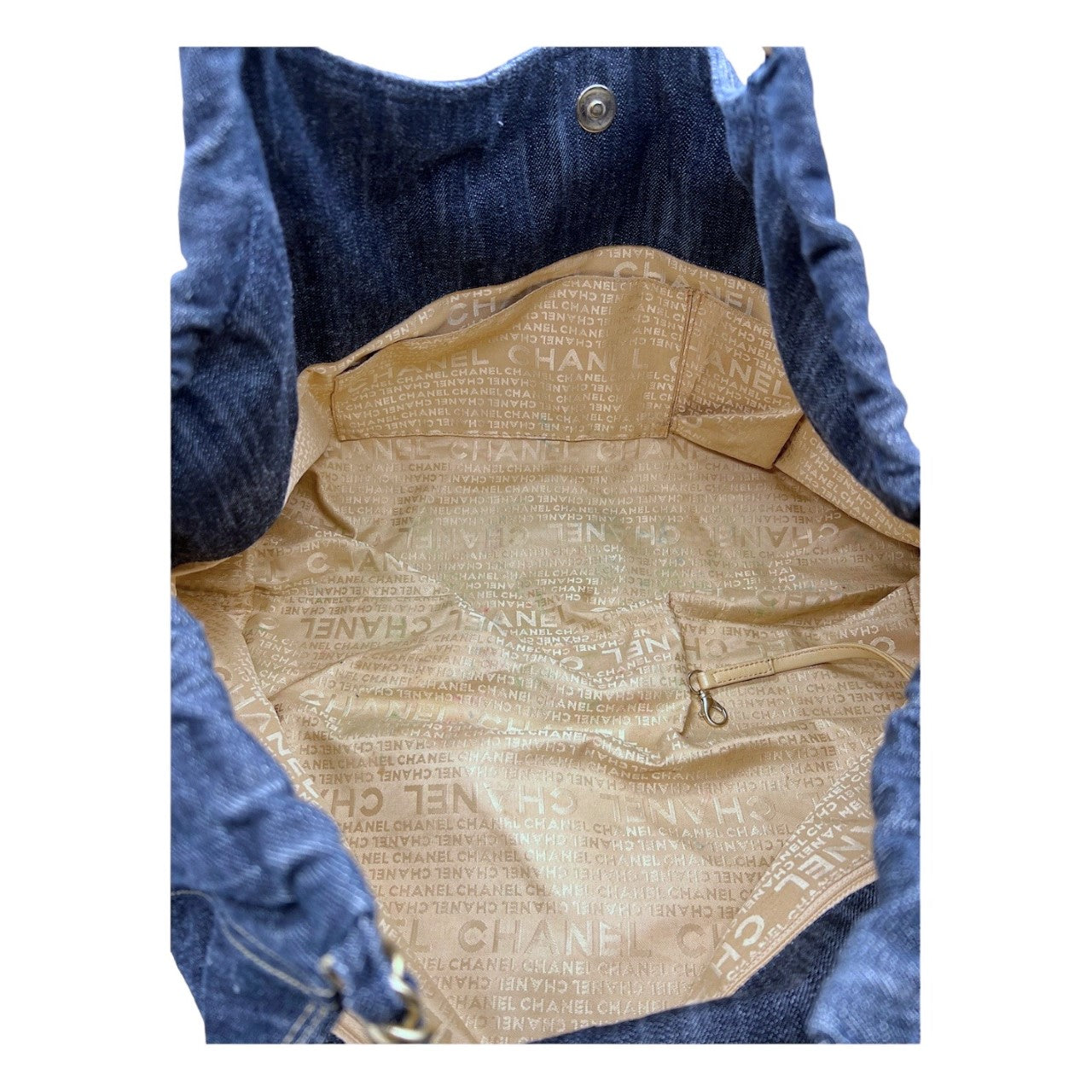 We are offering this lovely denim Chanel bag tote. Made in Italy, this bag is finely crafted of a denim exterior with a large embroidered Chanel bag interlocking 'CC' logo front and center. It has dual intertwined denim and gold-tone chain shoulder straps. It has an open top magnetic snap closure and it opens up to an interior with Chanel bag logo jacquard fabric lining that features a zip pocket and 2 slip pockets. Certified by Entrupy!