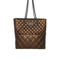This exquisite tote is beautifully crafted of diamond quilted distressed aged calfskin leather in metallic bronze. The bag features bijoux ruthenium tightly linked chain shoulder straps and a ruthenium squared mademoiselle turn-lock. This opens to a cream fabric interior with zipper compartments and patch pockets. Est.