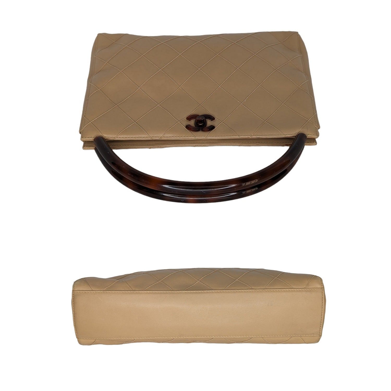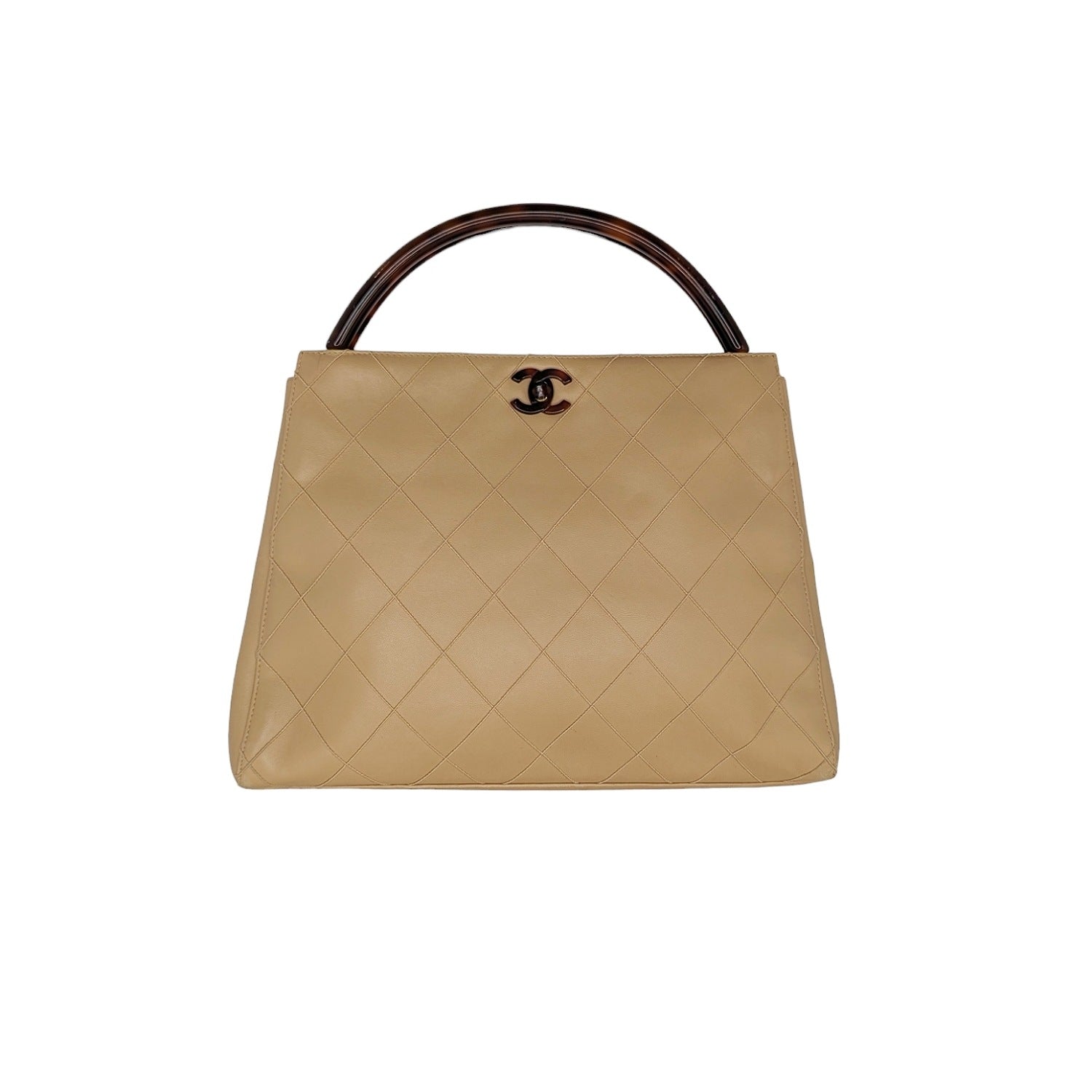 Chanel Bag Vintage Quilted Tortoise Motif Handle Bag. Crafted of quilted leather in beige. Featuring an interlocking CC turn-lock closure, gold-tone hardware with resin trim, dual rolled handles and tonal leather lined interior with a zipper pocket and a patch pocket.
